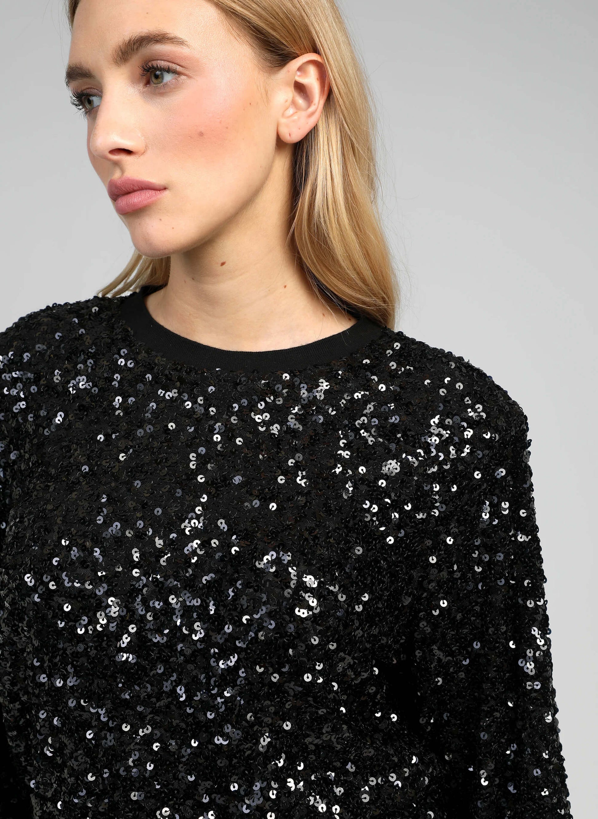 Black sequin jumper with long sleeves and stretchy hems and cuffs.