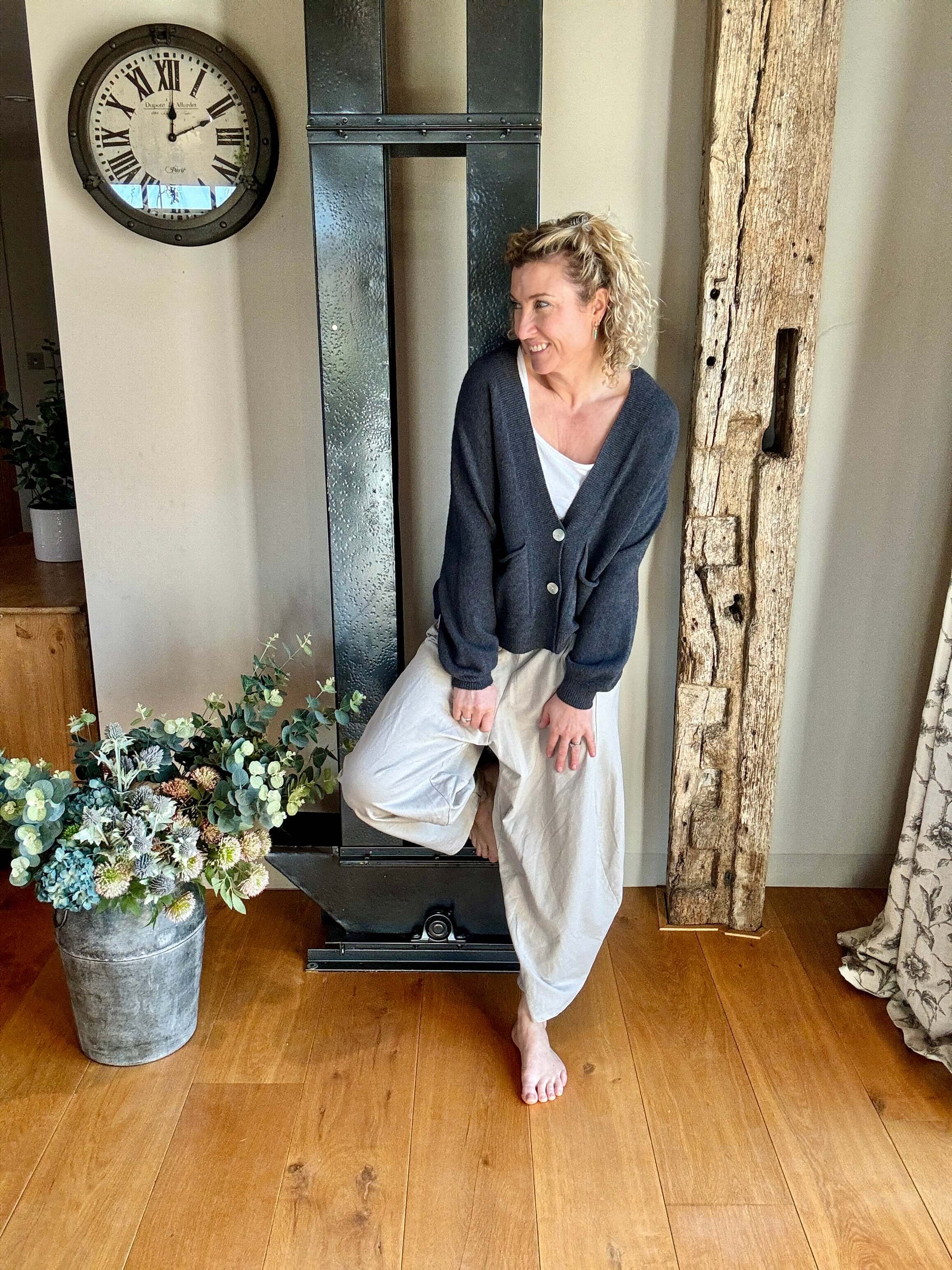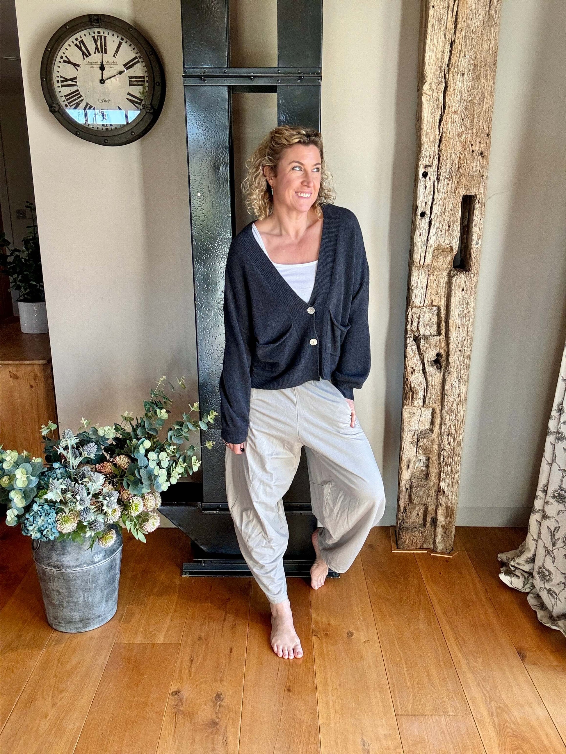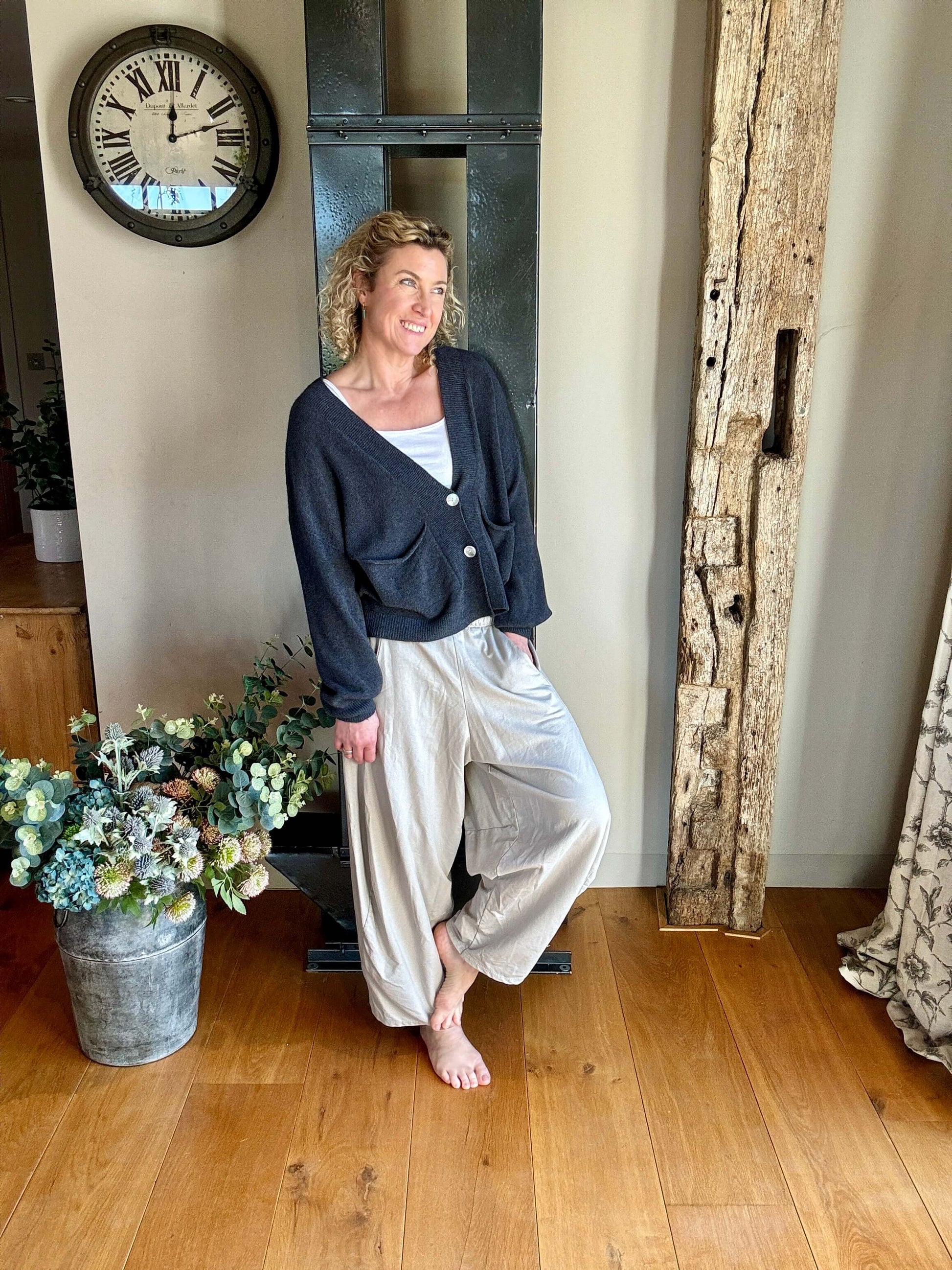 Wide throughout the legs. Tapered at the ankles. Stretchy waistband. Pockets. Perfect for those of you who love a relaxed, slouchy silhouette.