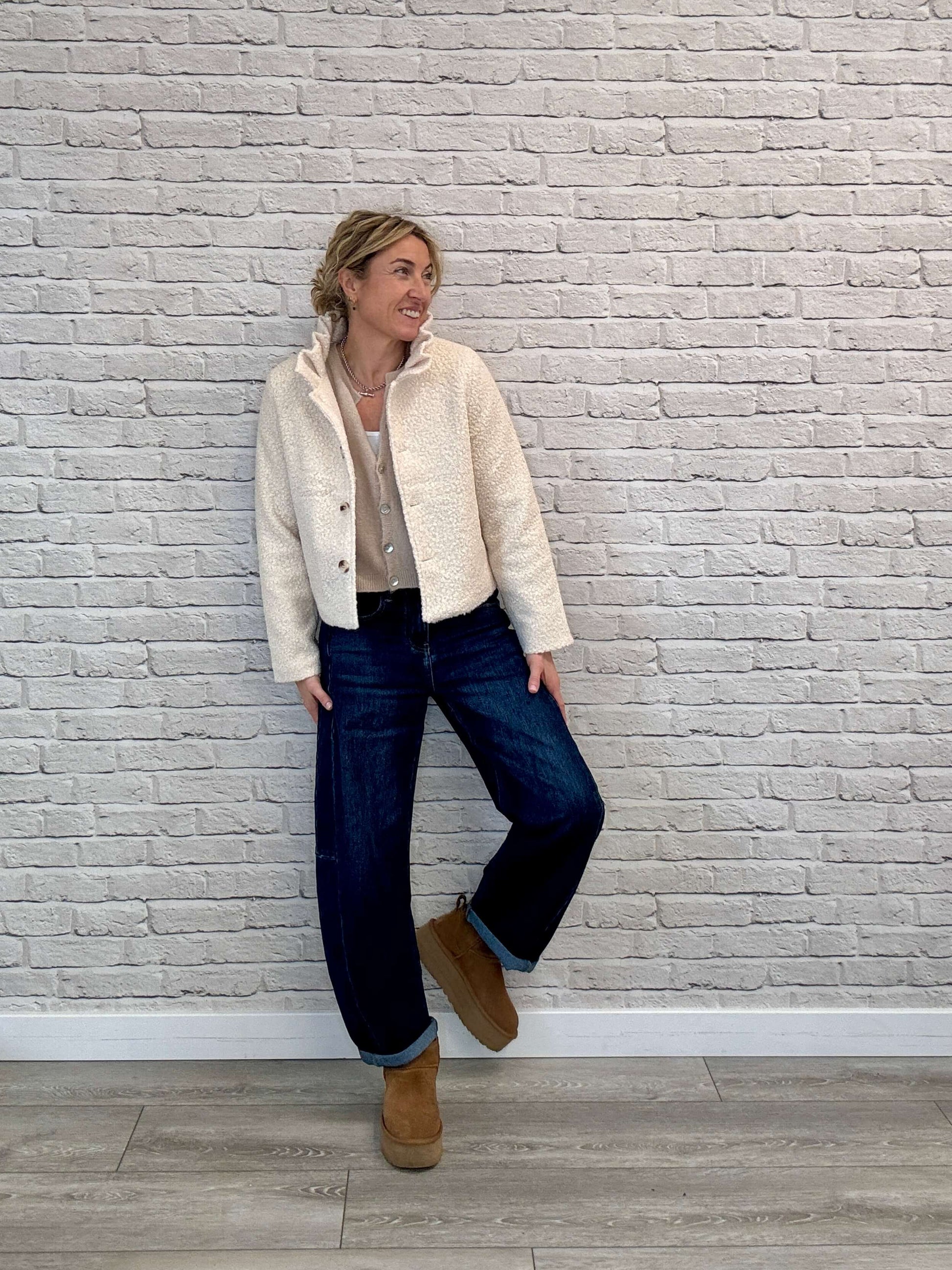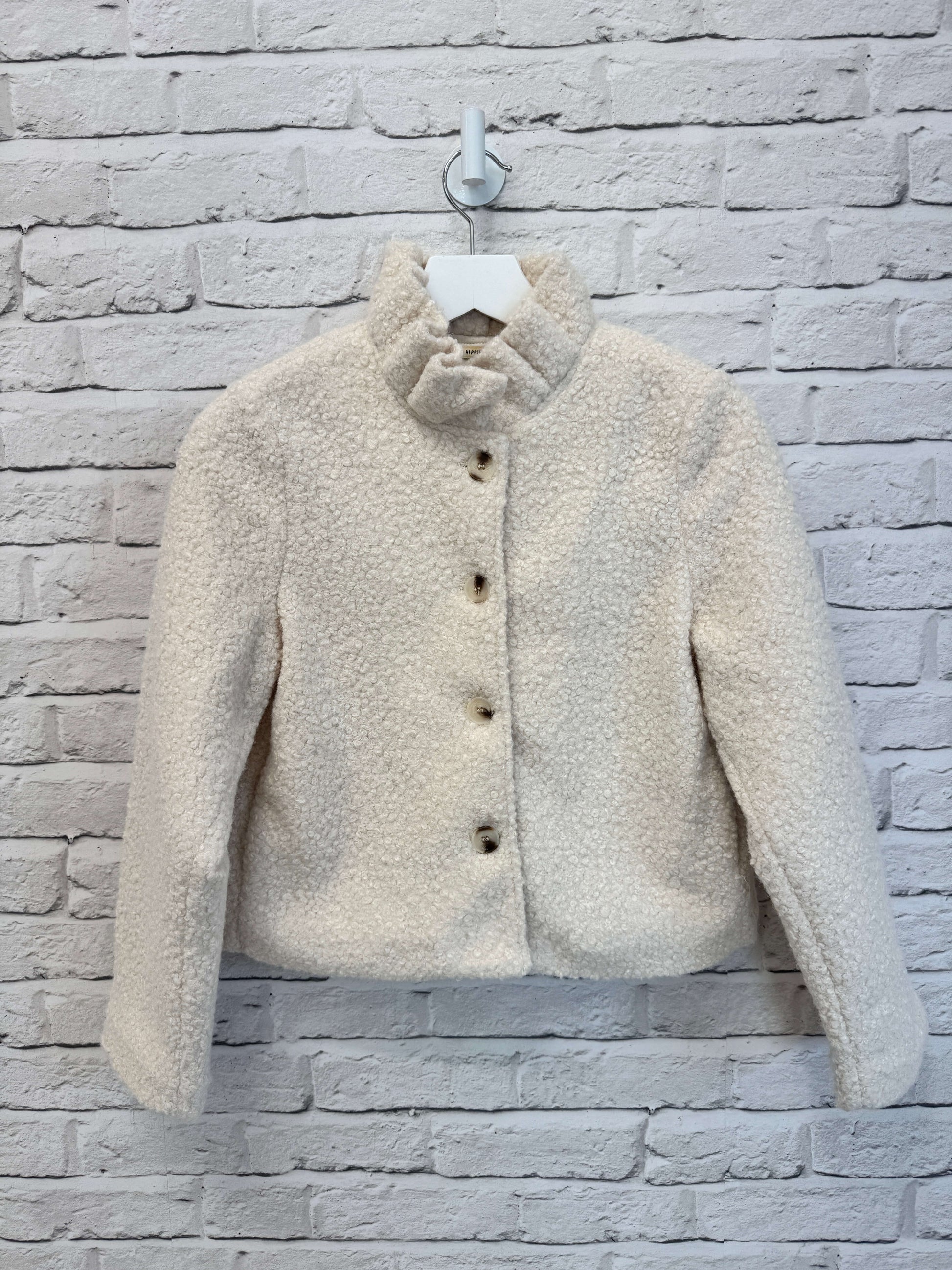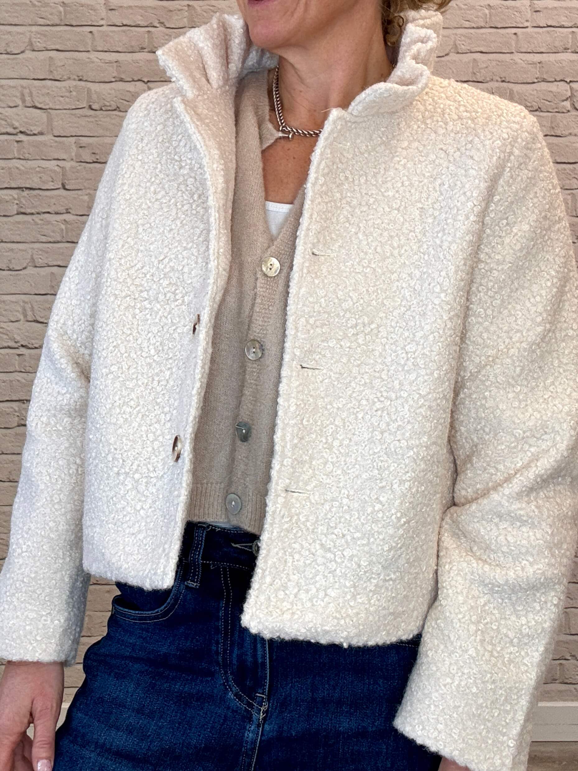 Meet your new statement layer. Our beautiful textured boucle jacket features a stunning standing frill collar that will literally have heads turning. The short, modern cut, button front and side pockets keep it effortlessly wearable while still delivering boutique-level style.