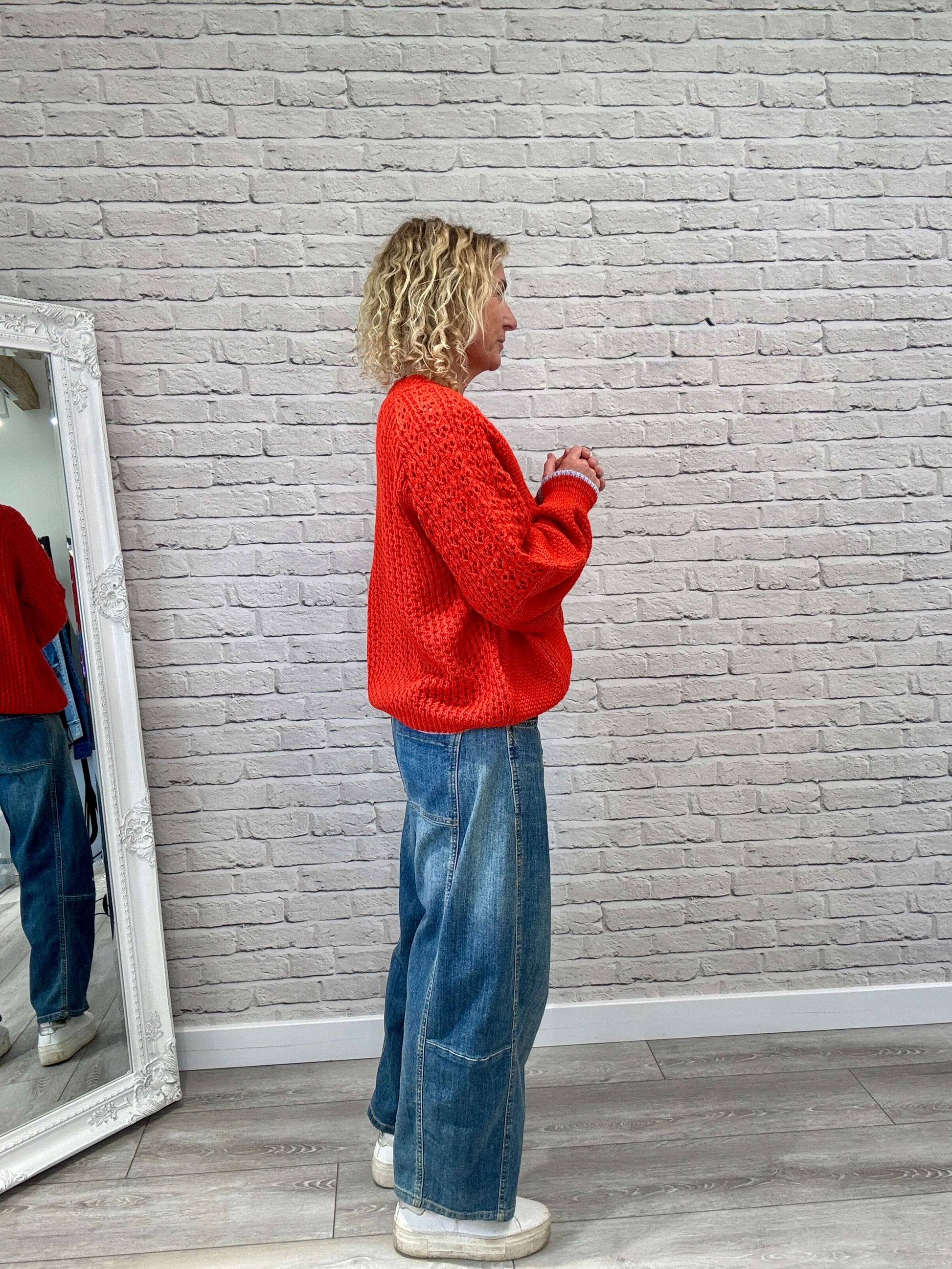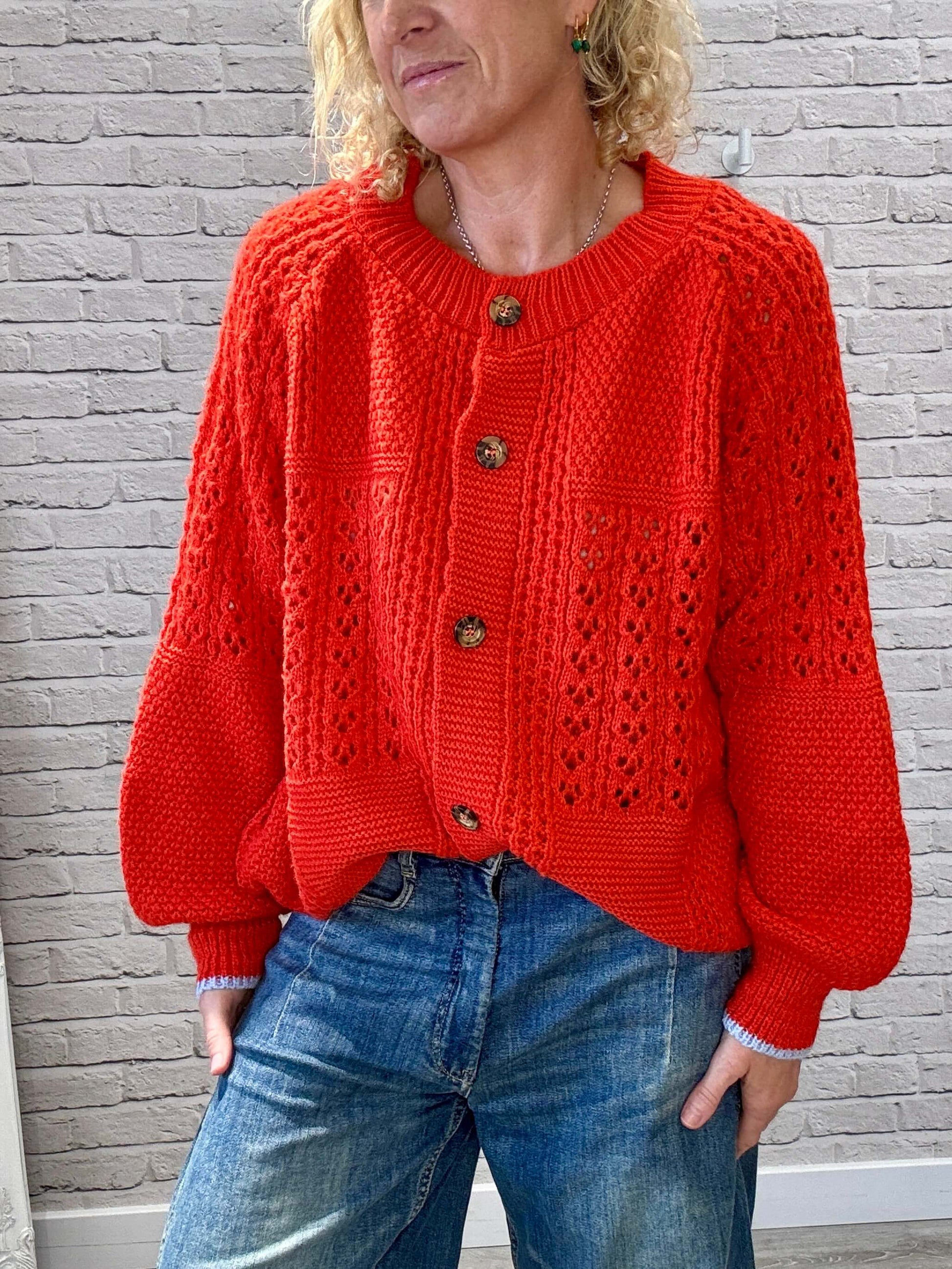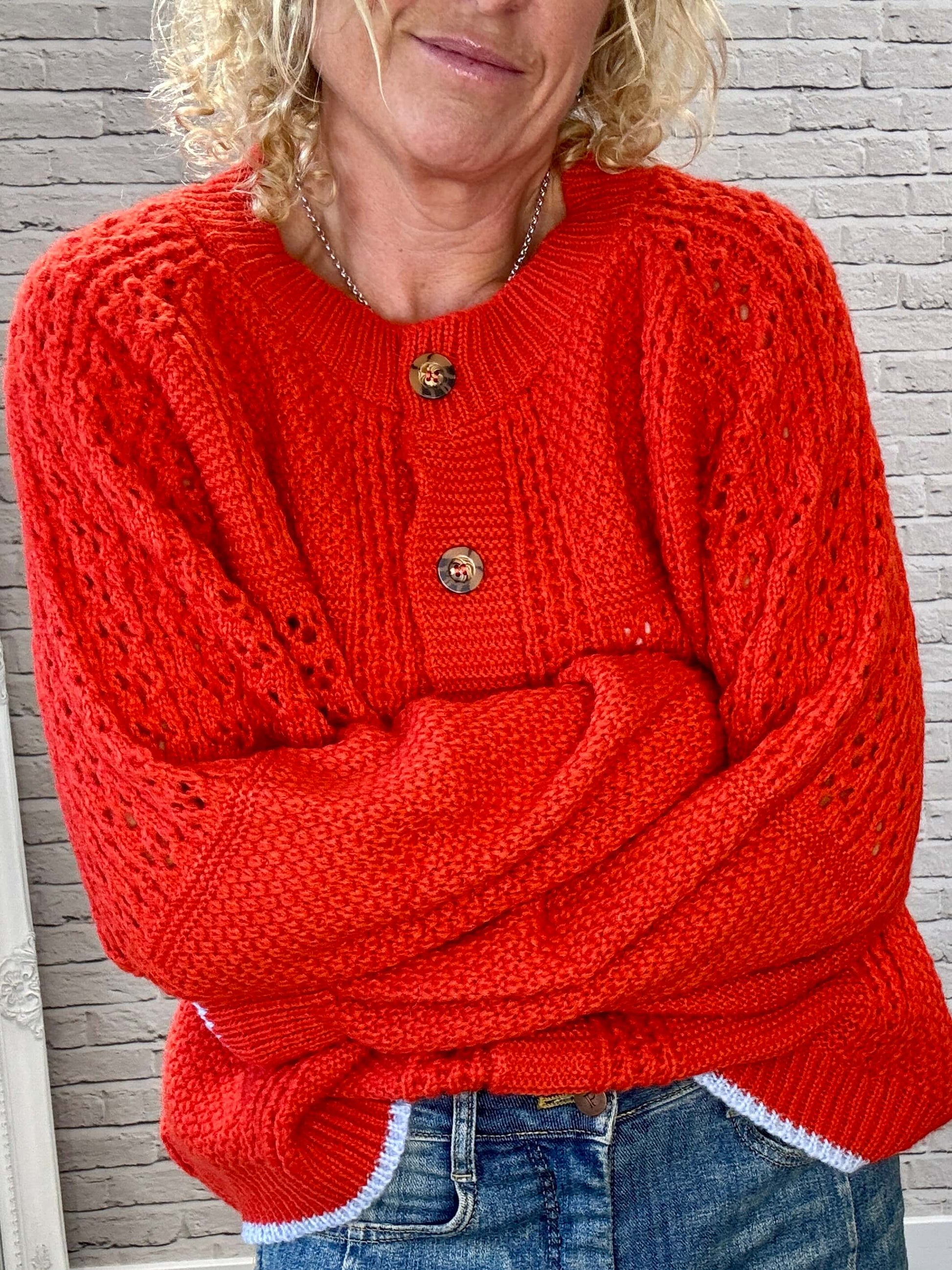 Chunky pointelle stitch balloon sleeve cardigan in this season's must have colour, bitter orange. Crafted from soft, cosy yarn with tortoiseshell buttons and contrasting soft blue edging on the cuffs and hem.