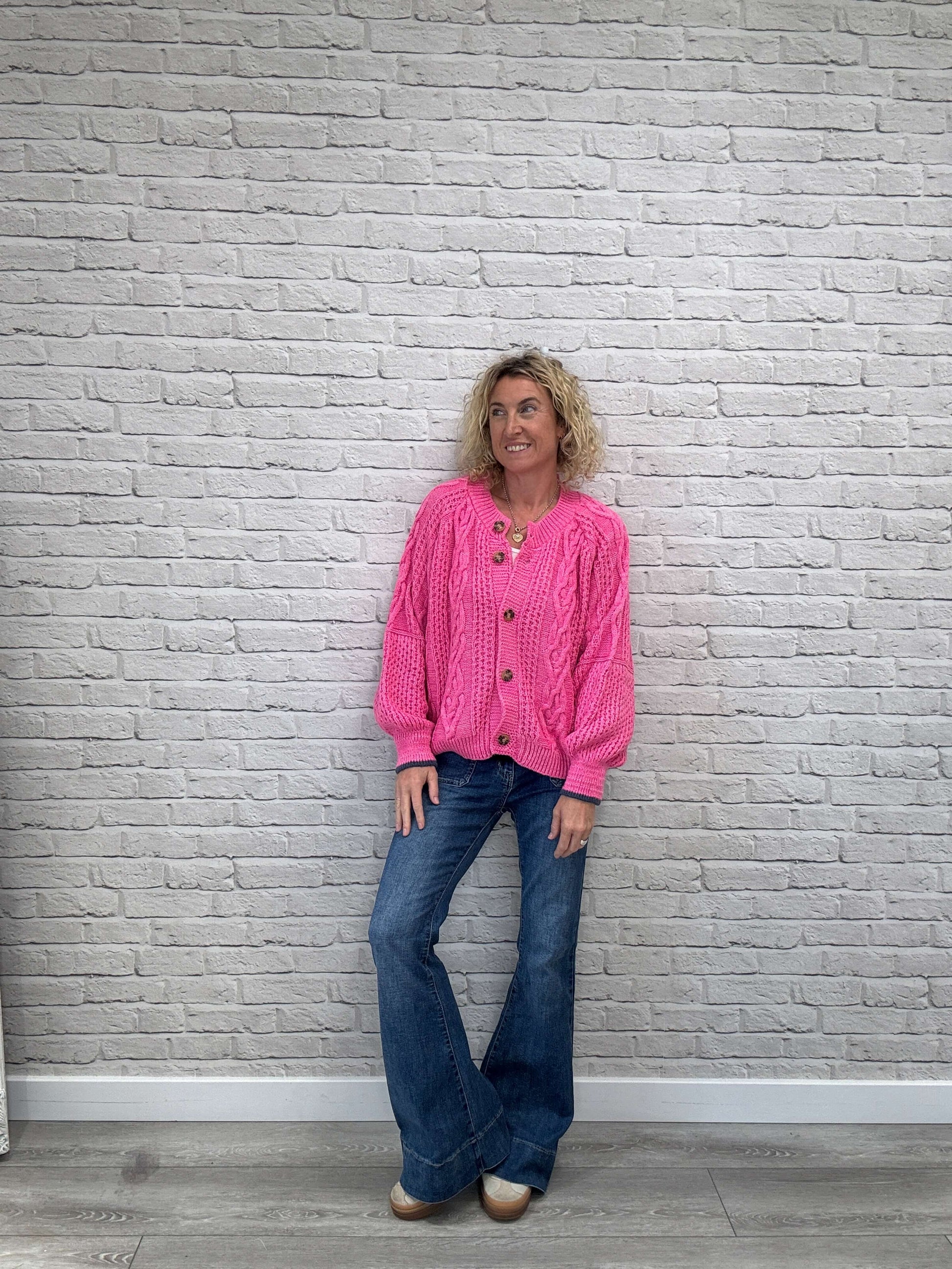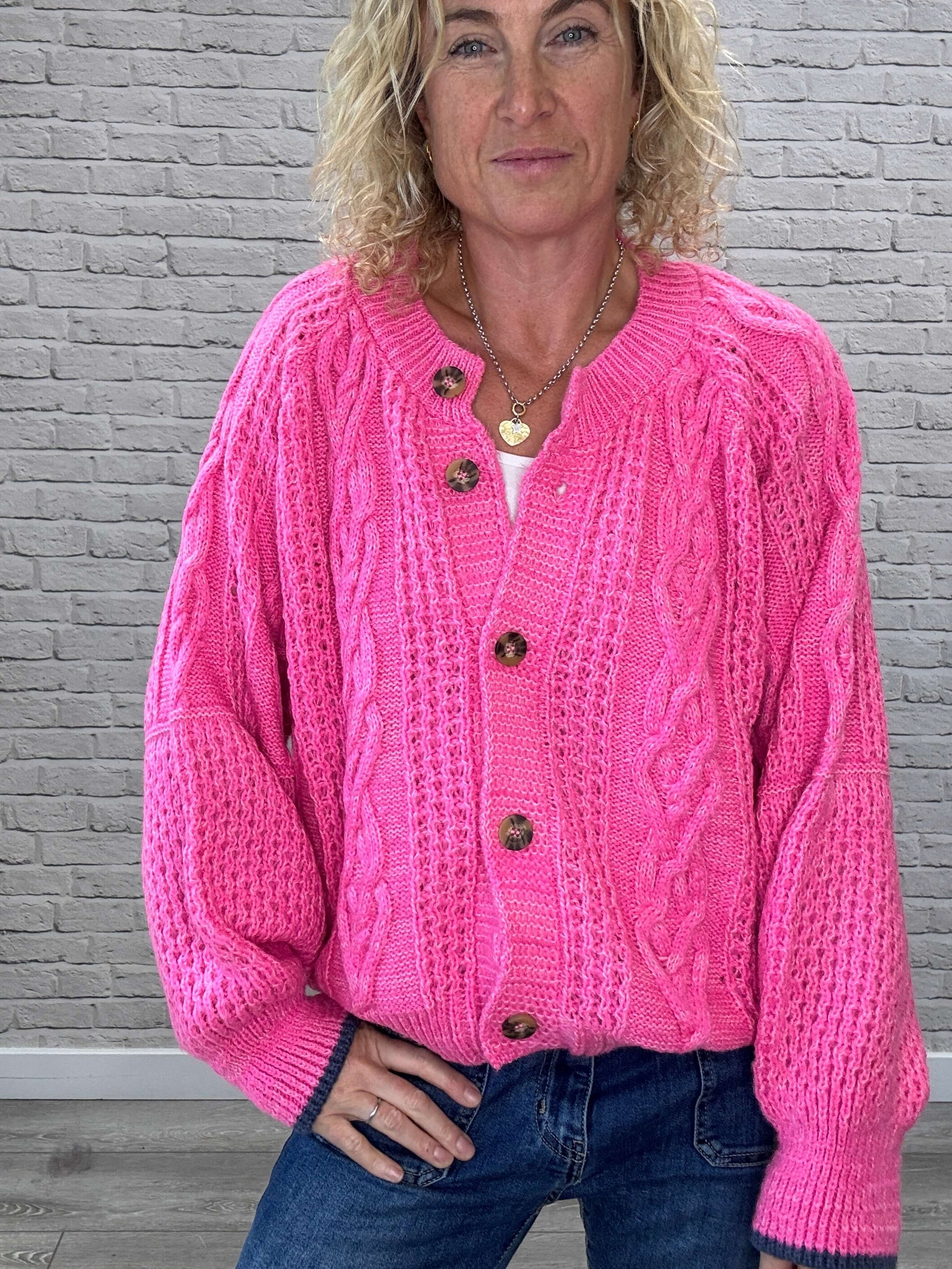 Chunky pointelle stitch balloon sleeve cardigan in bright pink. Crafted from soft, cosy yarn with tortoiseshell buttons and contrasting navy edging on the cuffs and hem.