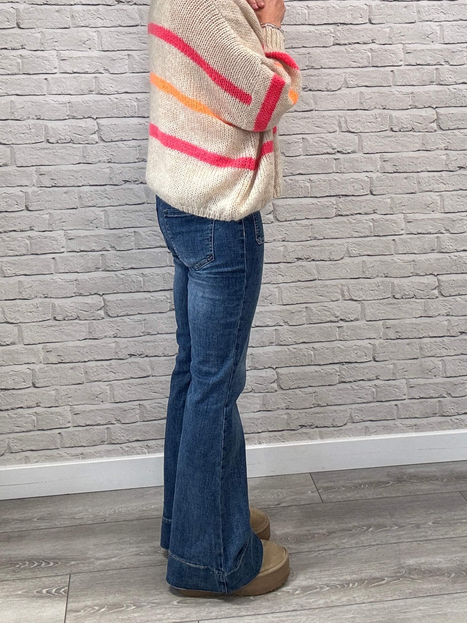 Mid rise skinny flare with patch pockets - fitted through the waist, hips & thighs, graduated flare from the knee. Mid wash denim.
