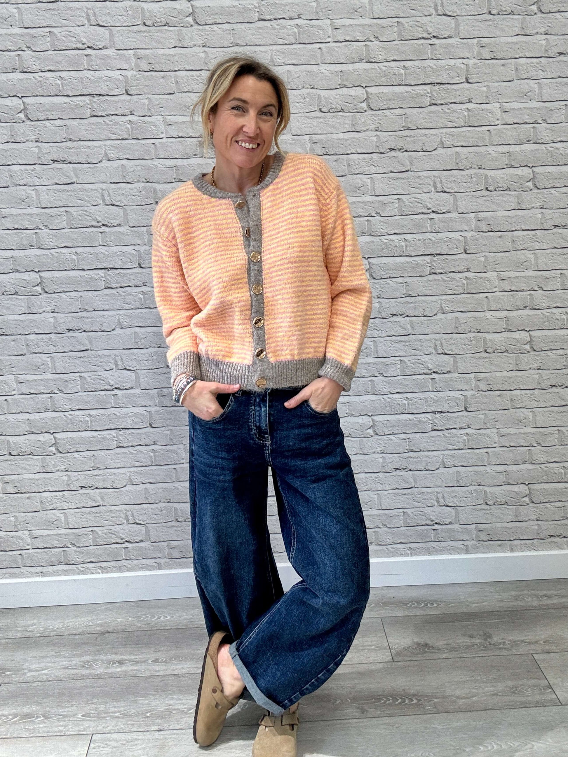 Pink & yellow striped cardigan with a taupe coloured collar, cuff and hem. Gold button detailing. Chunky vibes.