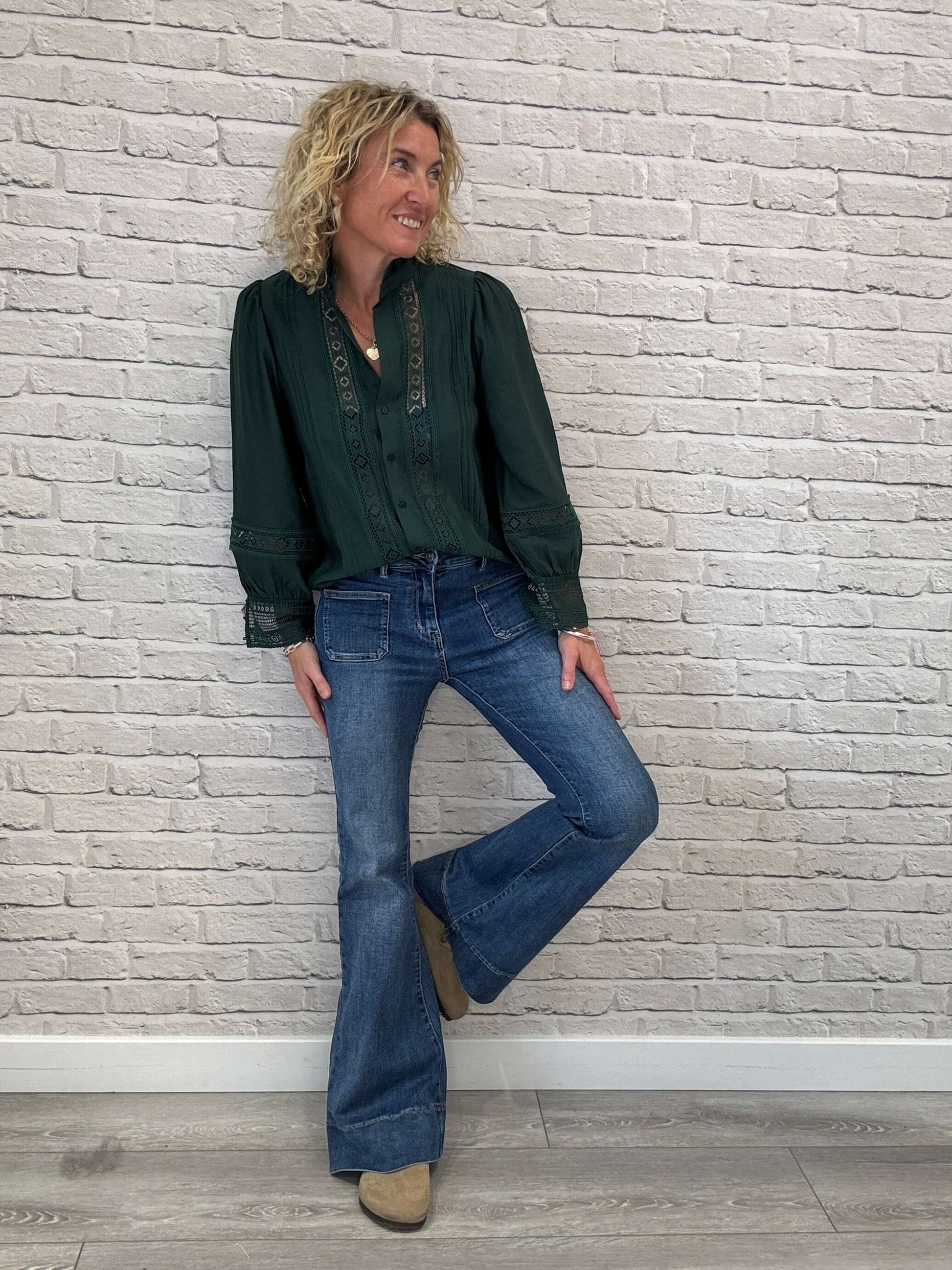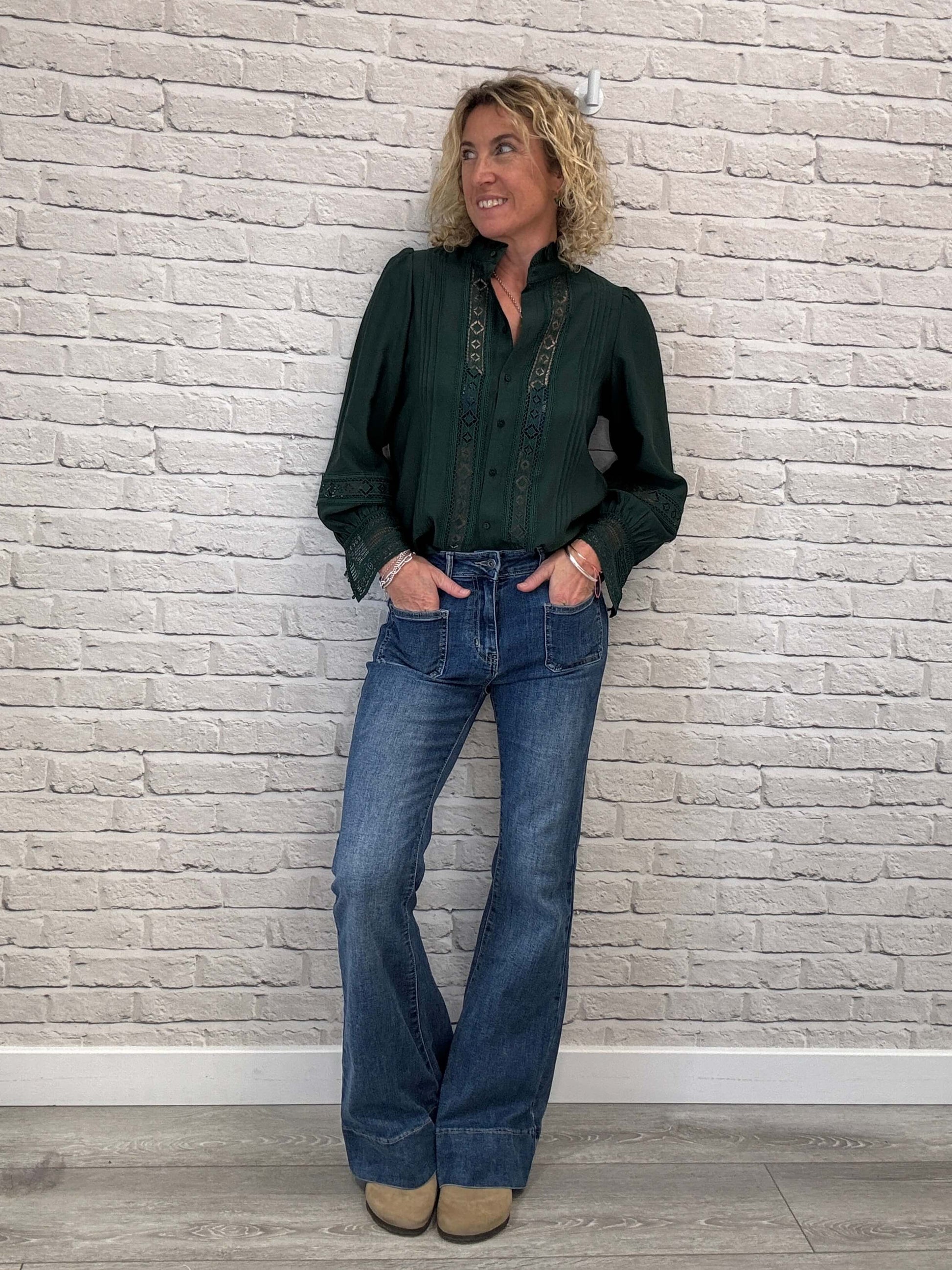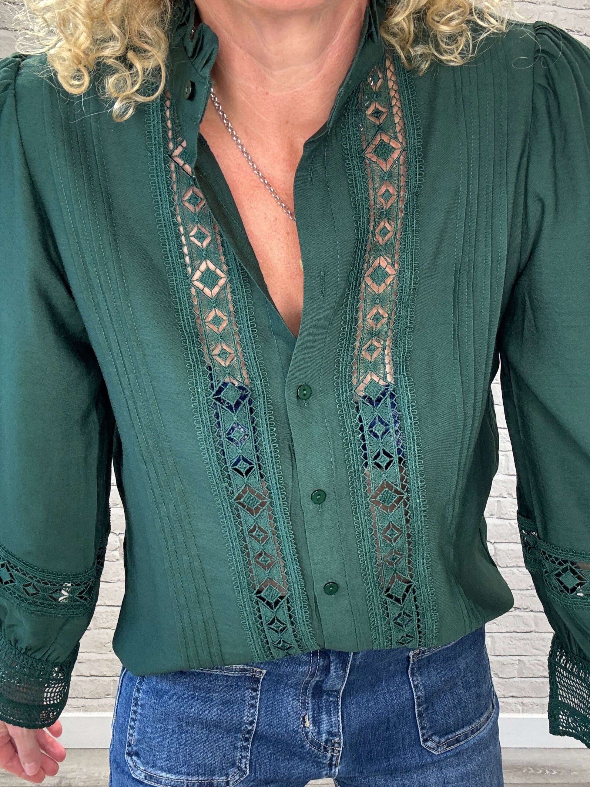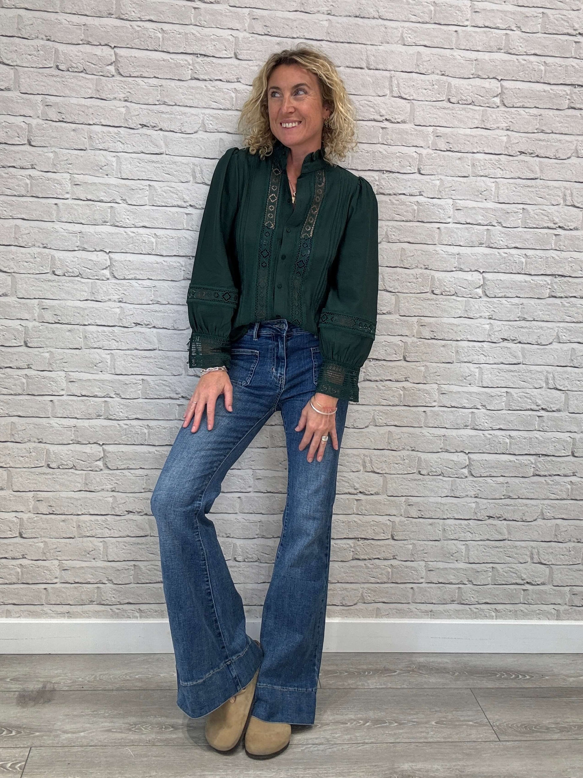 A vintage-inspired blouse featuring a standing frill collar and pleated placket front, with delicate lace detailing and elegant deep buttoned lace cuffs. Pair with wide-leg jeans for a chic, effortless vibe.
