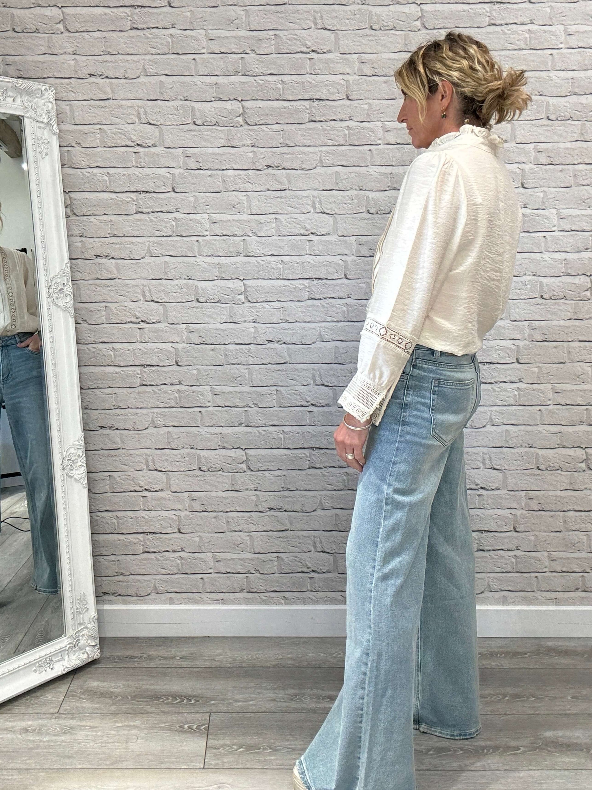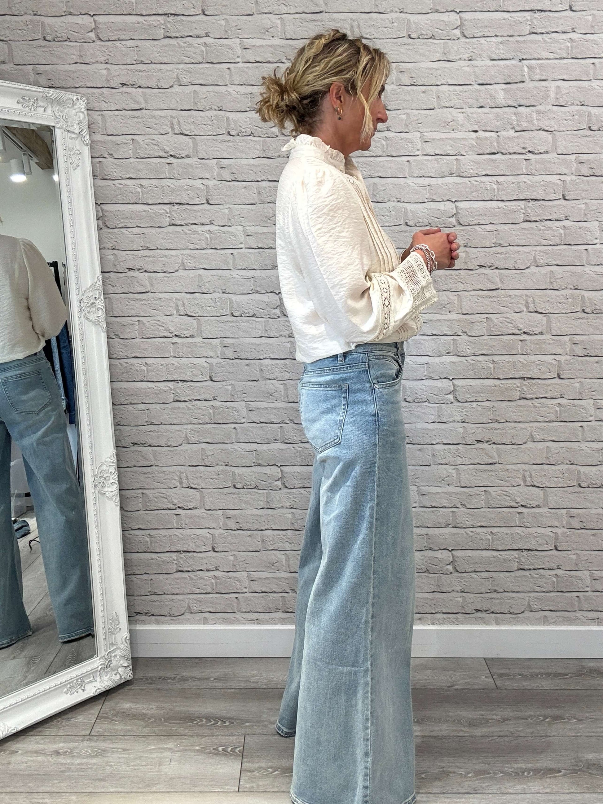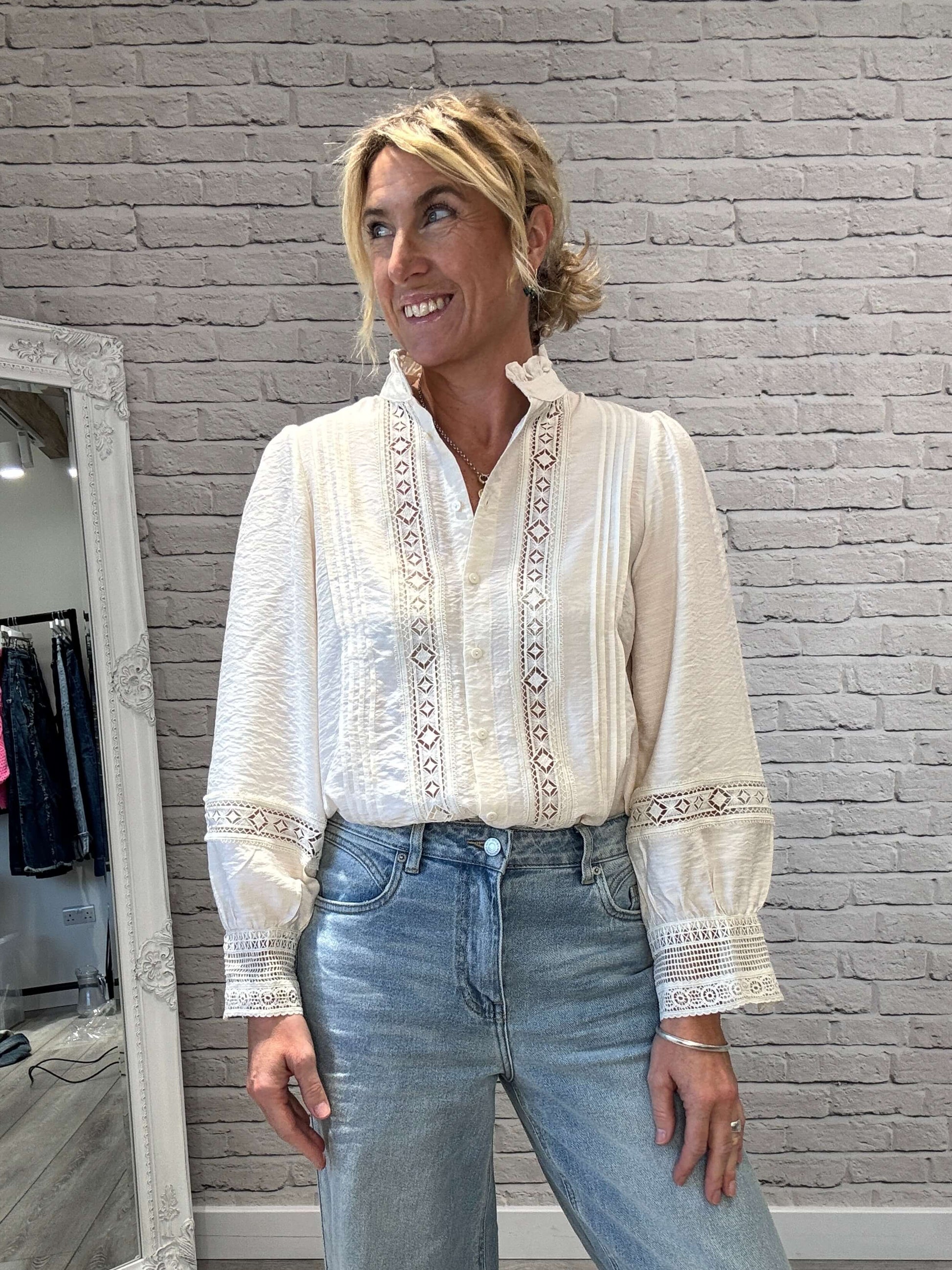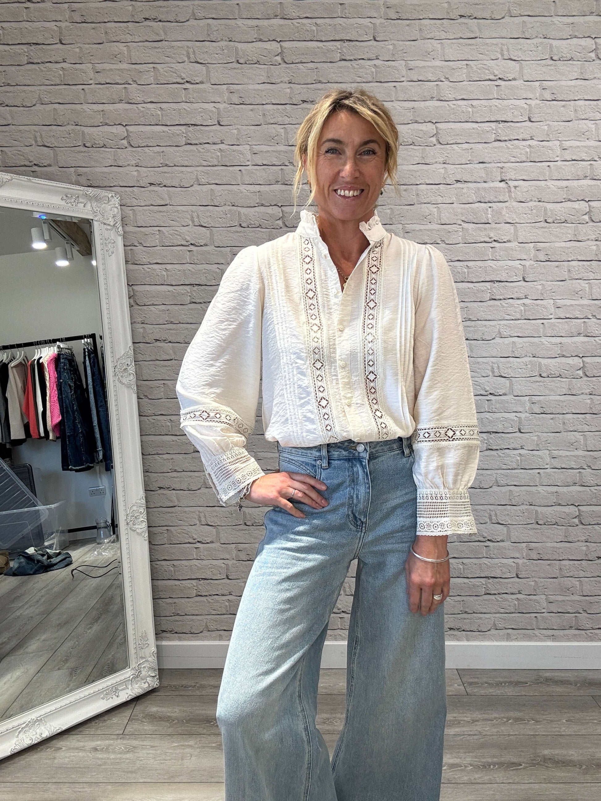 A vintage-inspired blouse featuring a standing frill collar and pleated placket front, with delicate lace detailing and elegant deep buttoned lace cuffs. Pair with wide-leg jeans for a chic, effortless vibe.