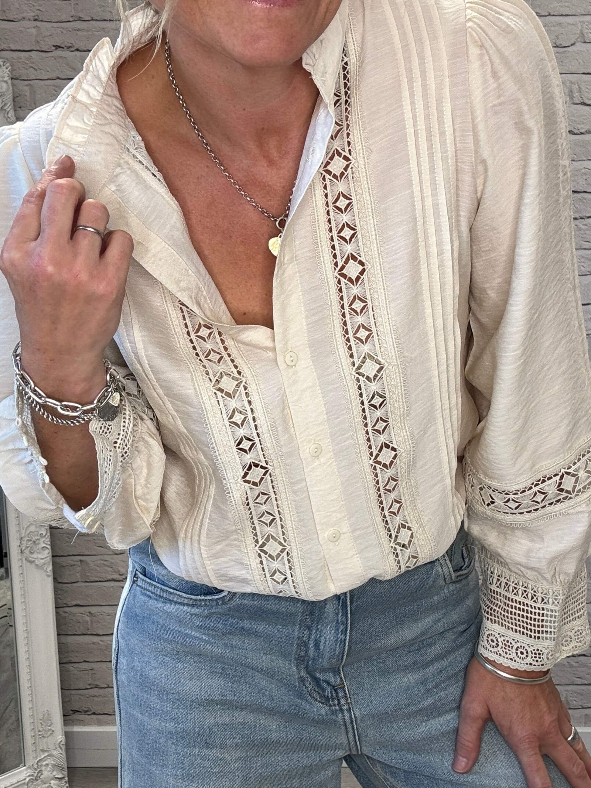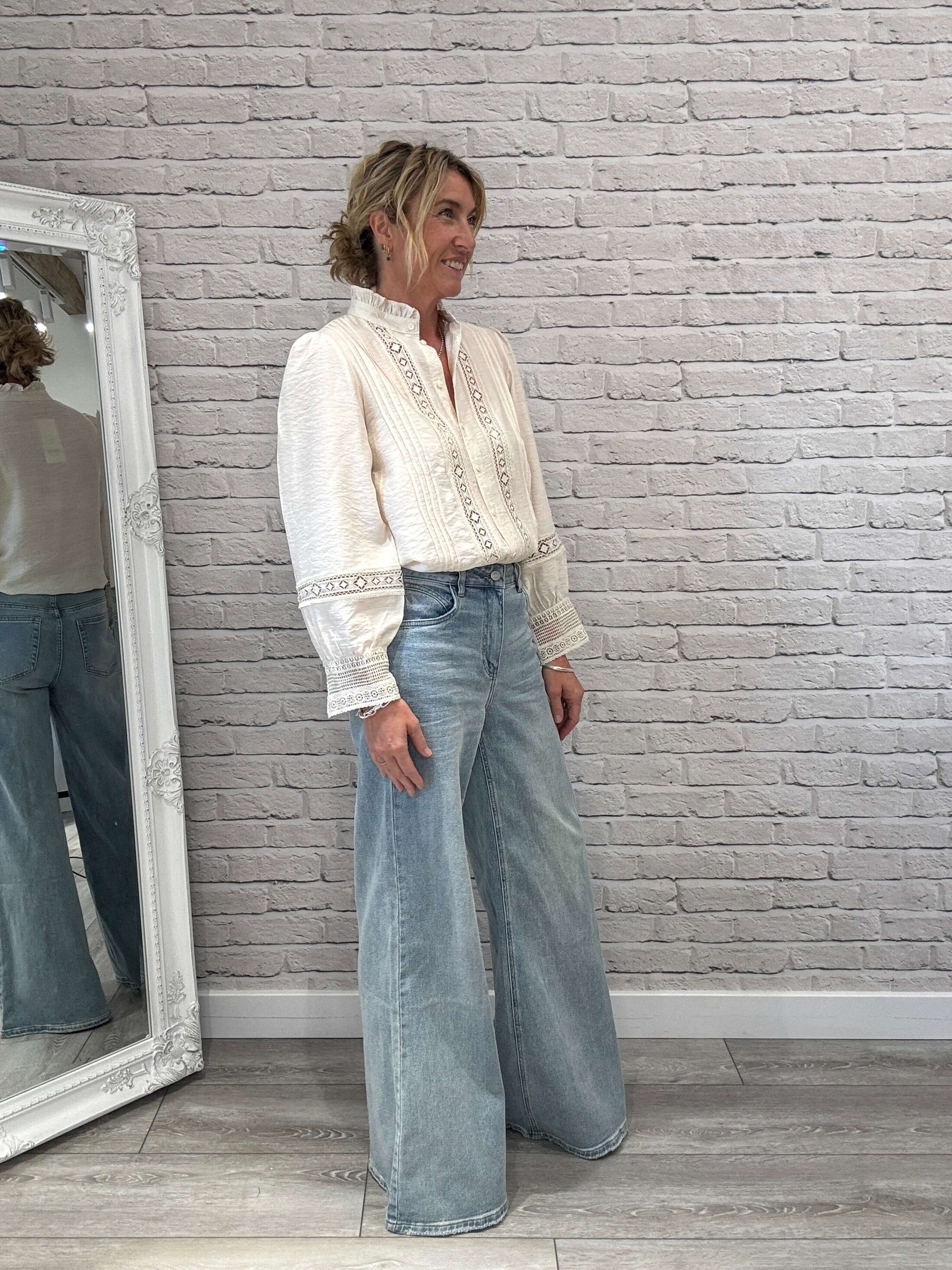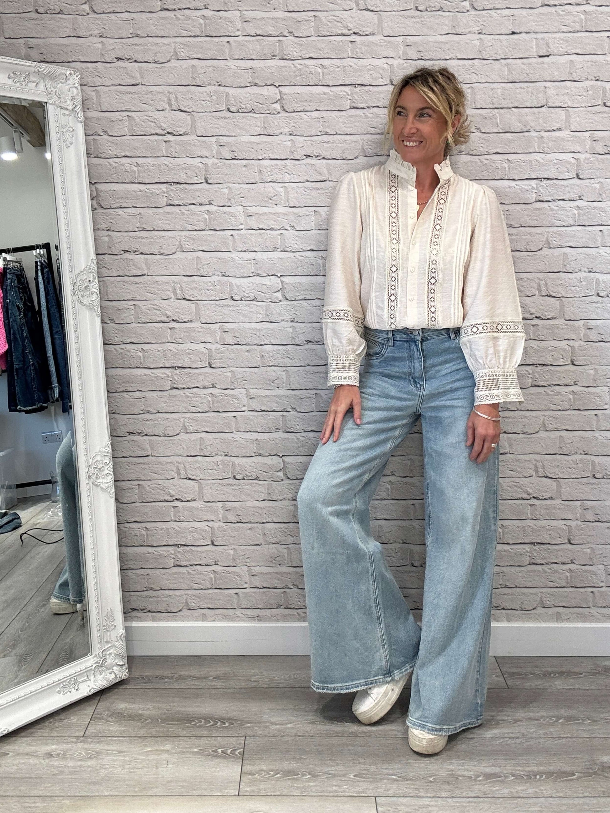 A vintage-inspired blouse featuring a standing frill collar and pleated placket front, with delicate lace detailing and elegant deep buttoned lace cuffs. Pair with wide-leg jeans for a chic, effortless vibe.