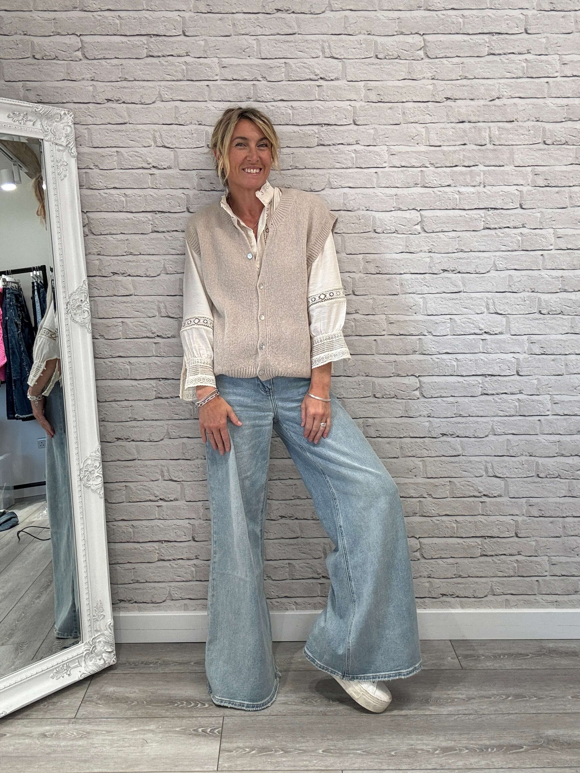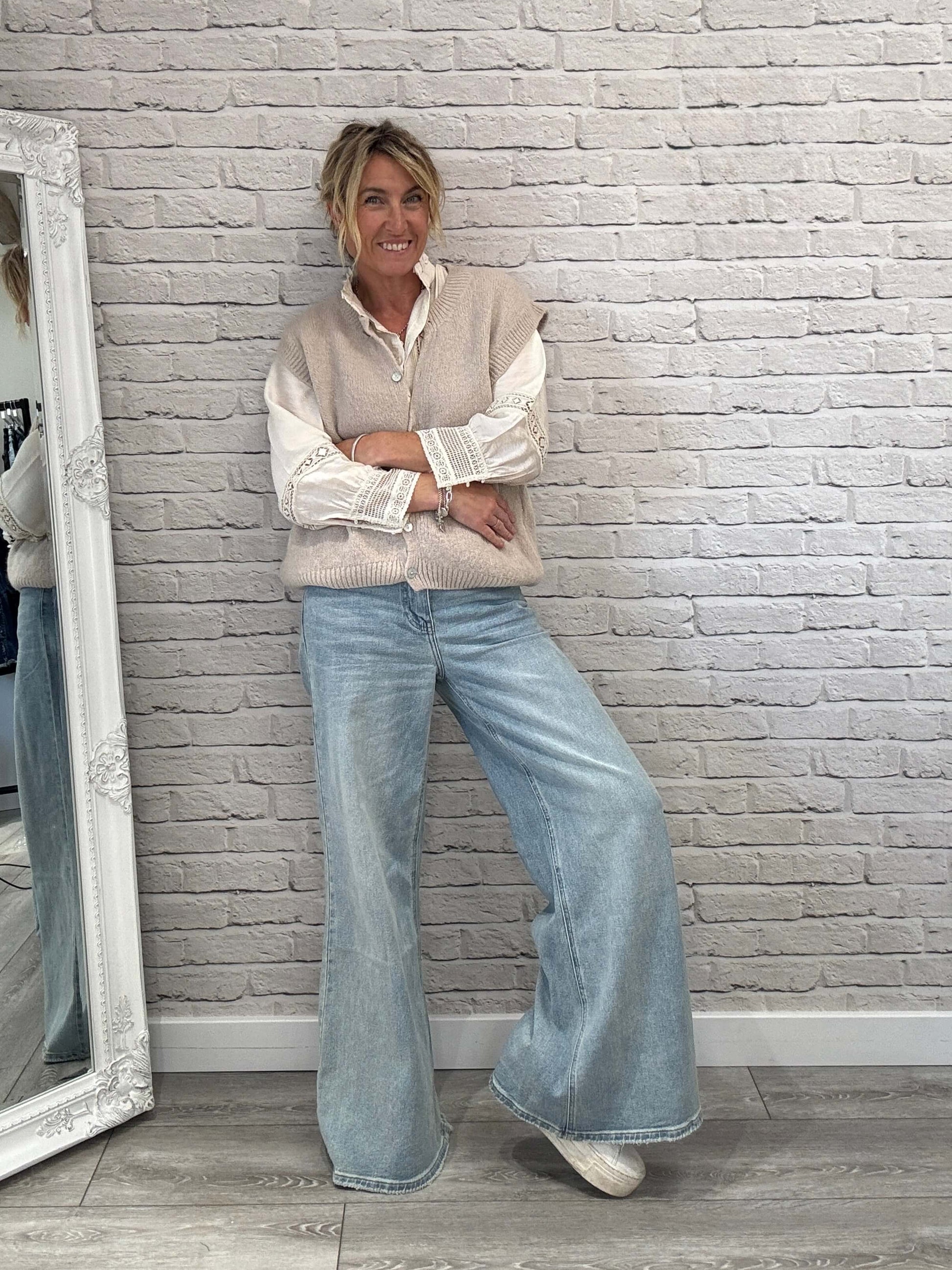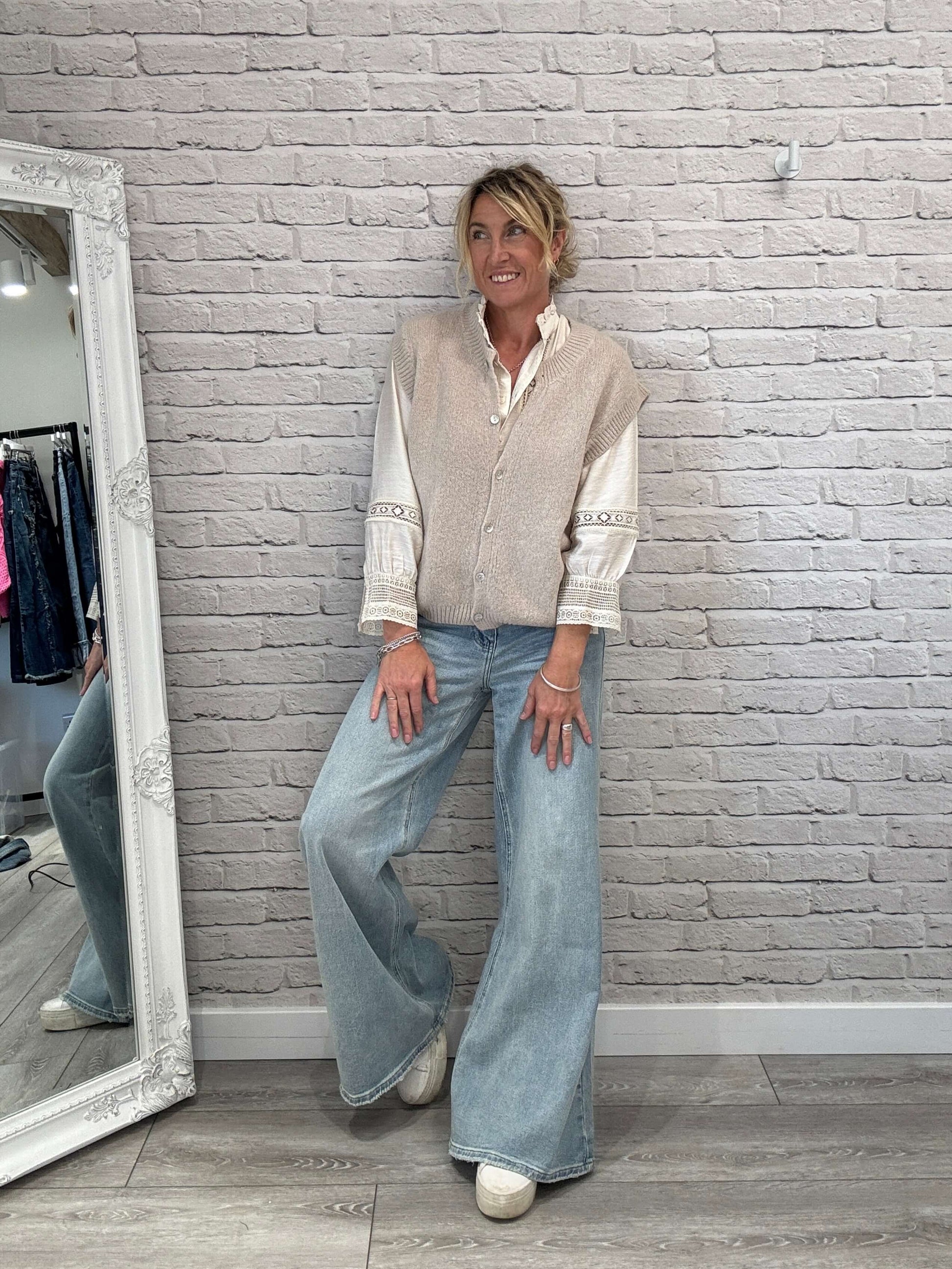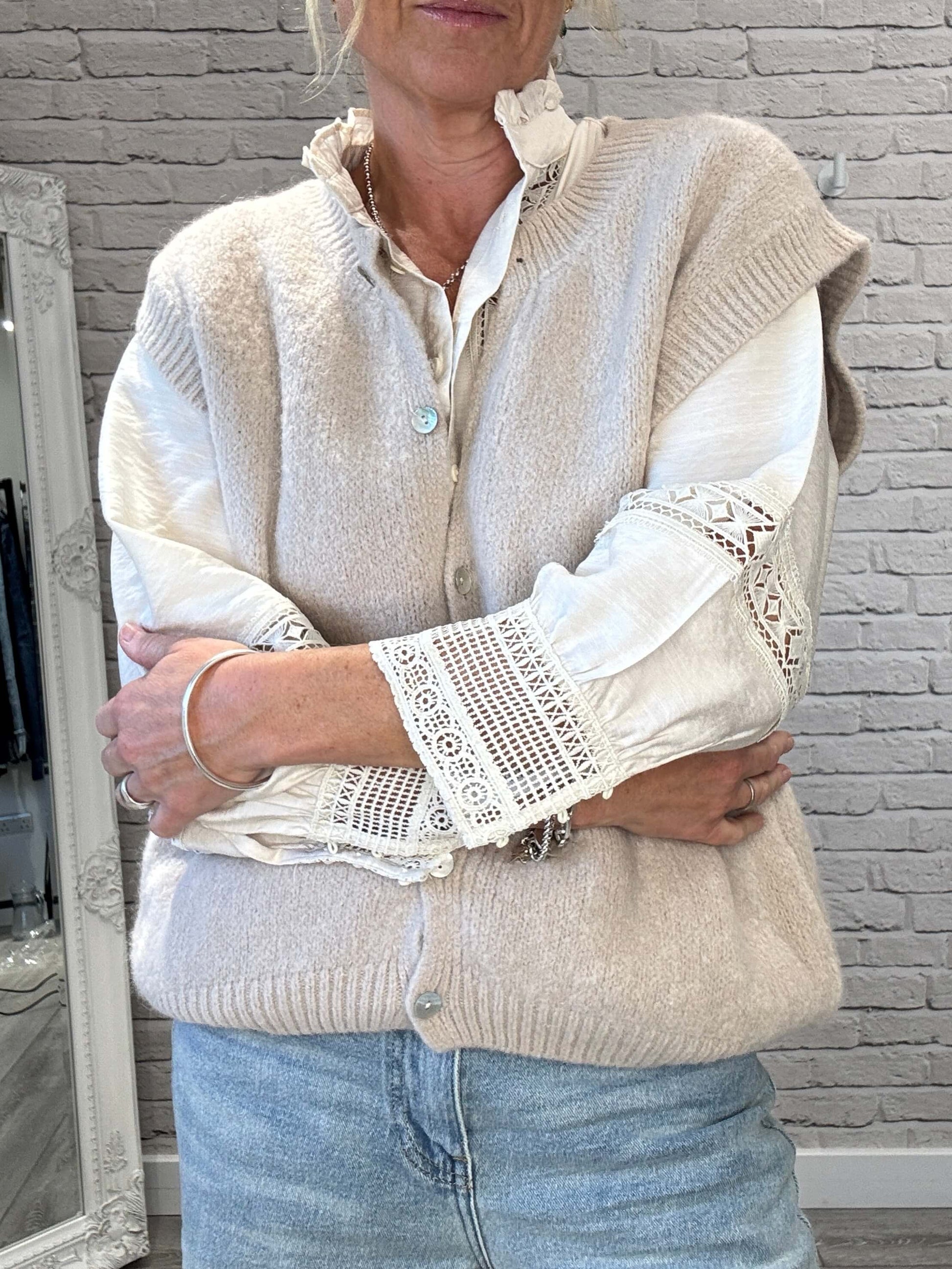 A vintage-inspired blouse featuring a standing frill collar and pleated placket front, with delicate lace detailing and elegant deep buttoned lace cuffs. Pair with wide-leg jeans for a chic, effortless vibe.