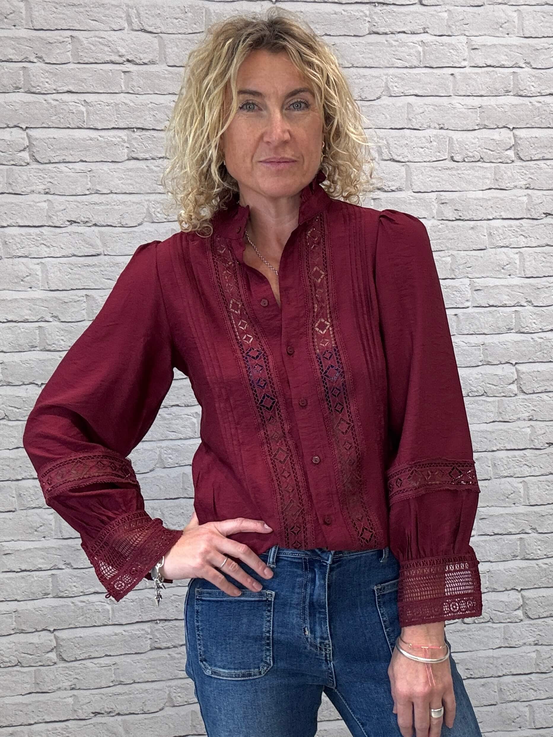 A vintage-inspired blouse featuring a standing frill collar and pleated placket front, with delicate lace detailing and elegant deep buttoned lace cuffs. Pair with wide-leg jeans for a chic, effortless vibe.
