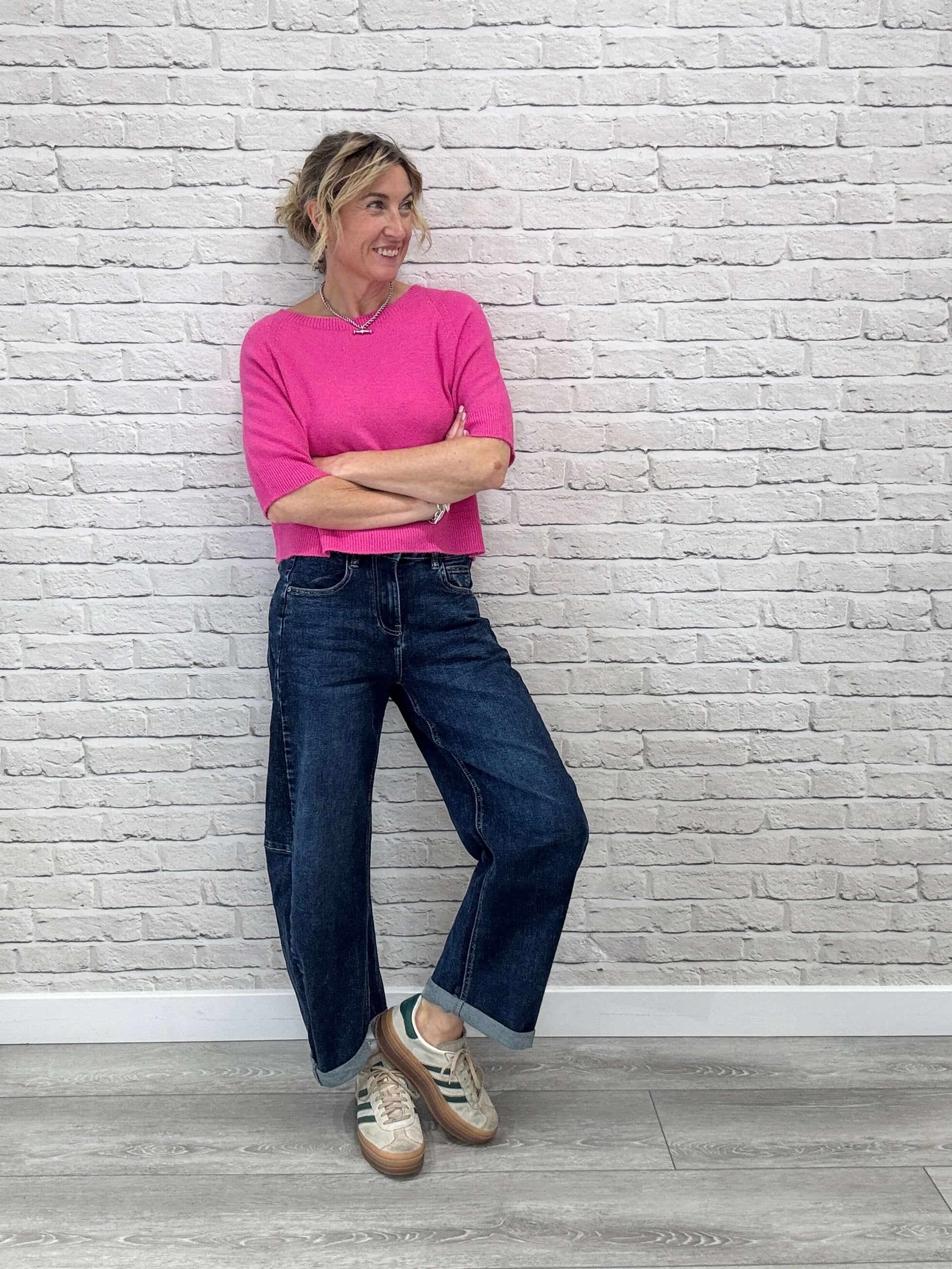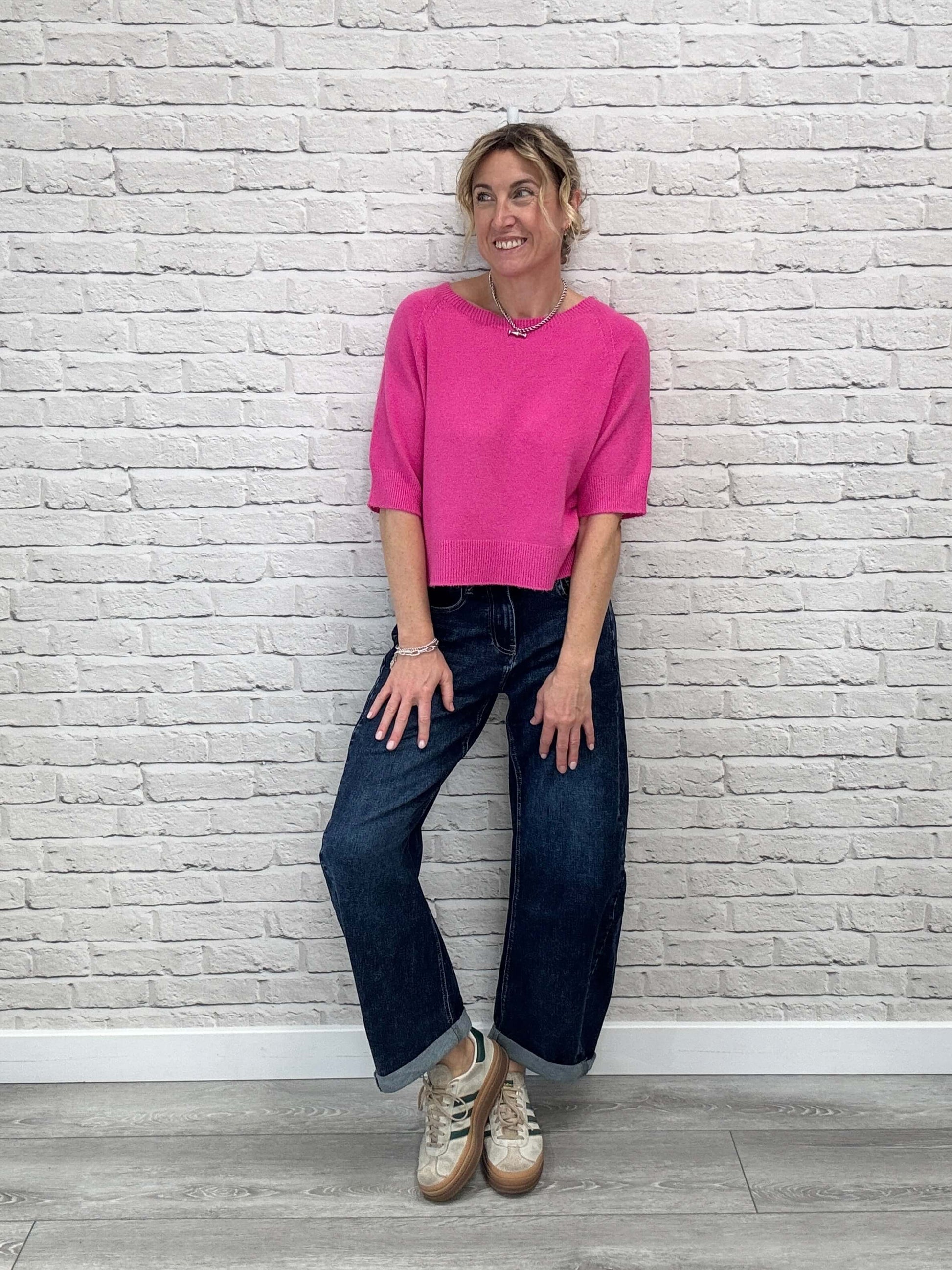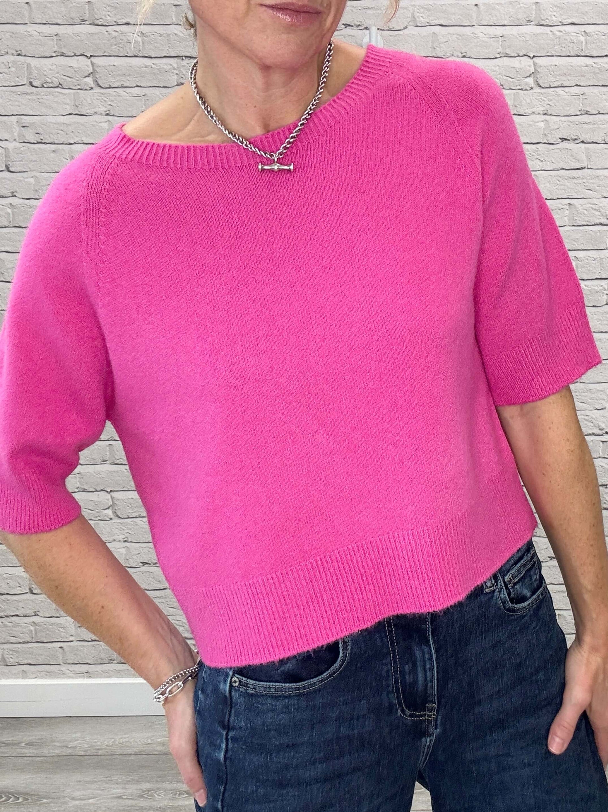 A smart, neat-fit sweater for that effortless polished look. Short sleeves finishing on the elbow with ribbed cuffs. High boat-neckline with ribbed detailing. Soft to touch.