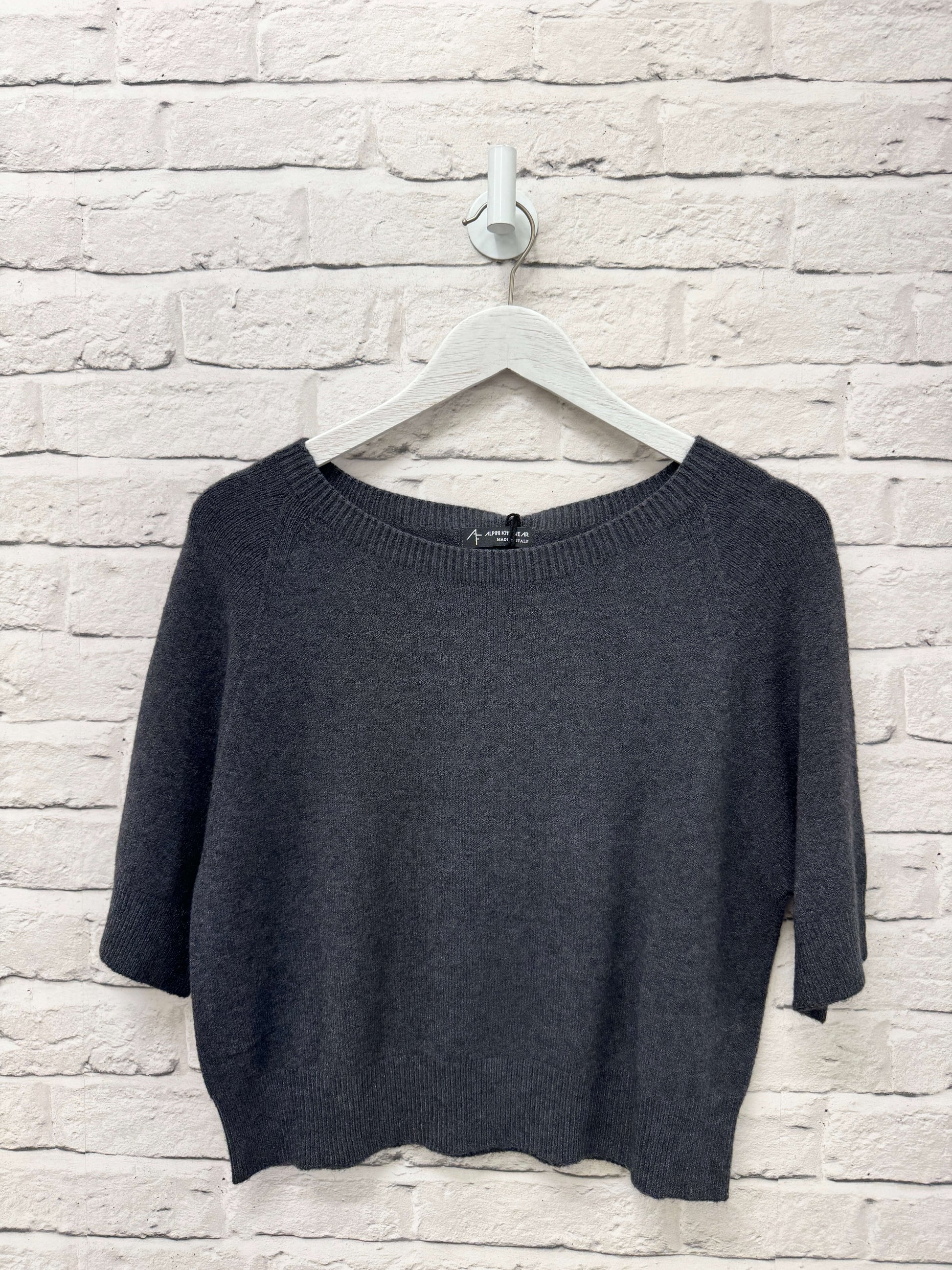 A smart, neat-fit sweater for that effortless polished look. Short sleeves finishing on the elbow with ribbed cuffs. High boat-neckline with ribbed detailing. Soft to touch.