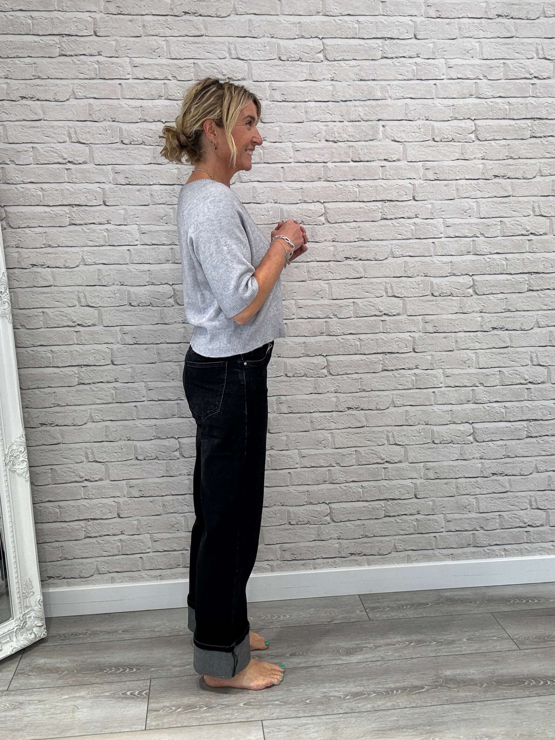 A smart, neat-fit sweater for that effortless polished look. Short sleeves finishing on the elbow with ribbed cuffs. High boat-neckline with ribbed detailing. Soft to touch.