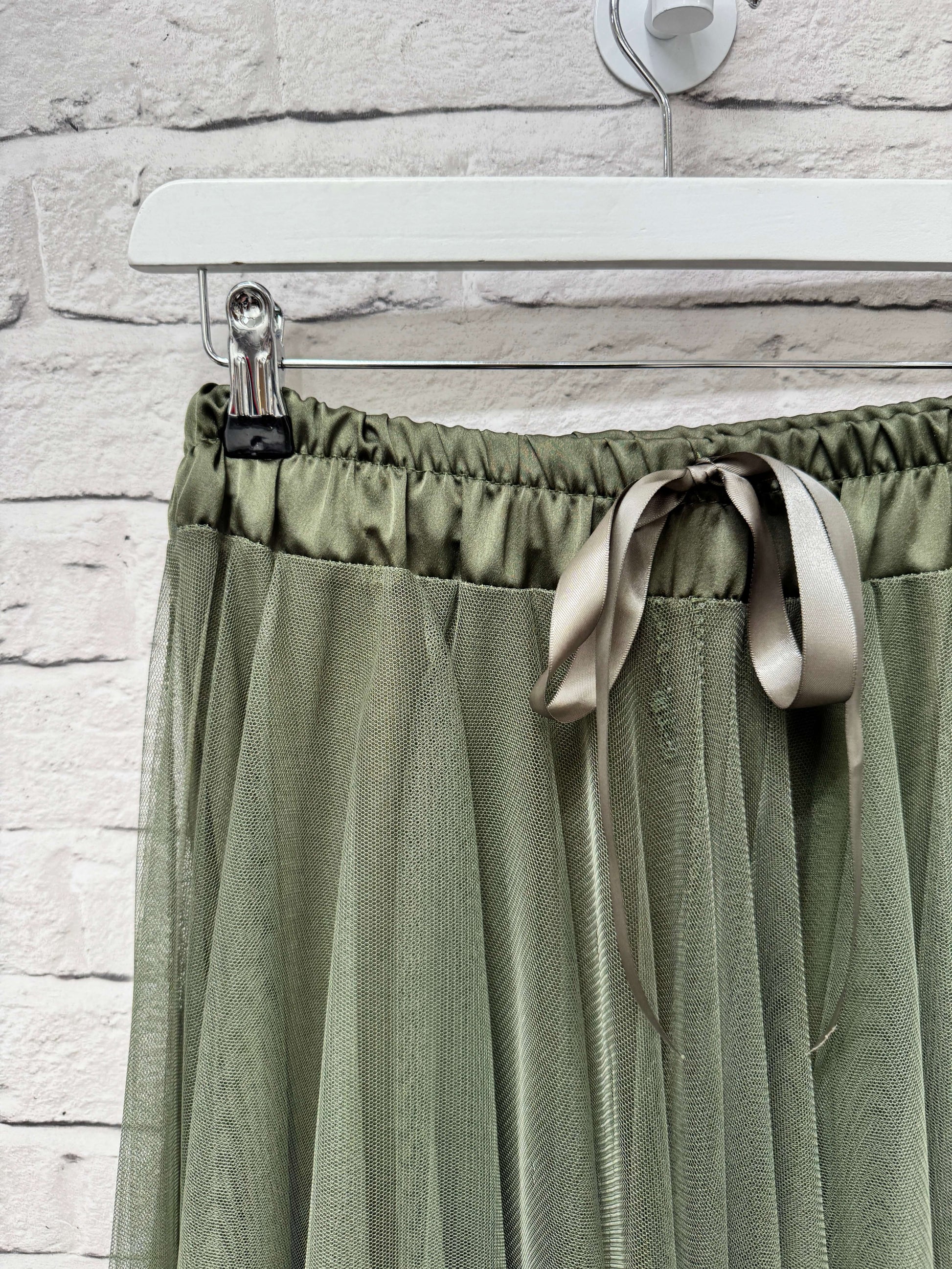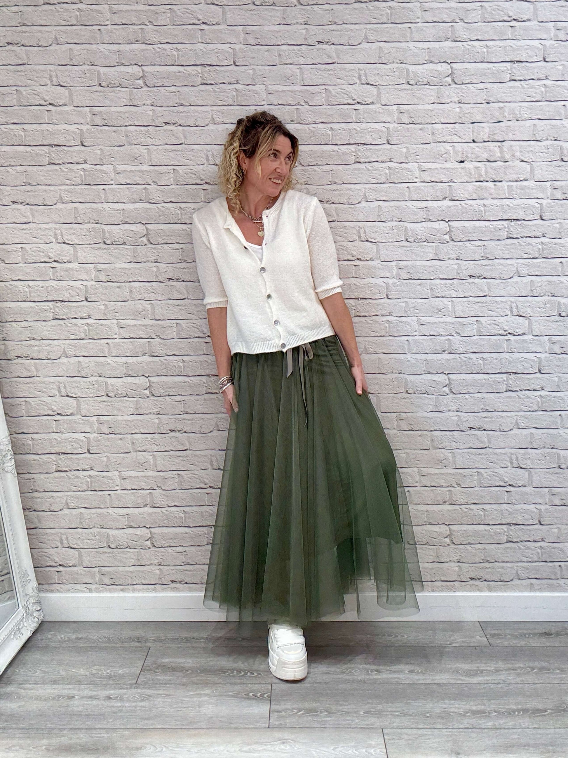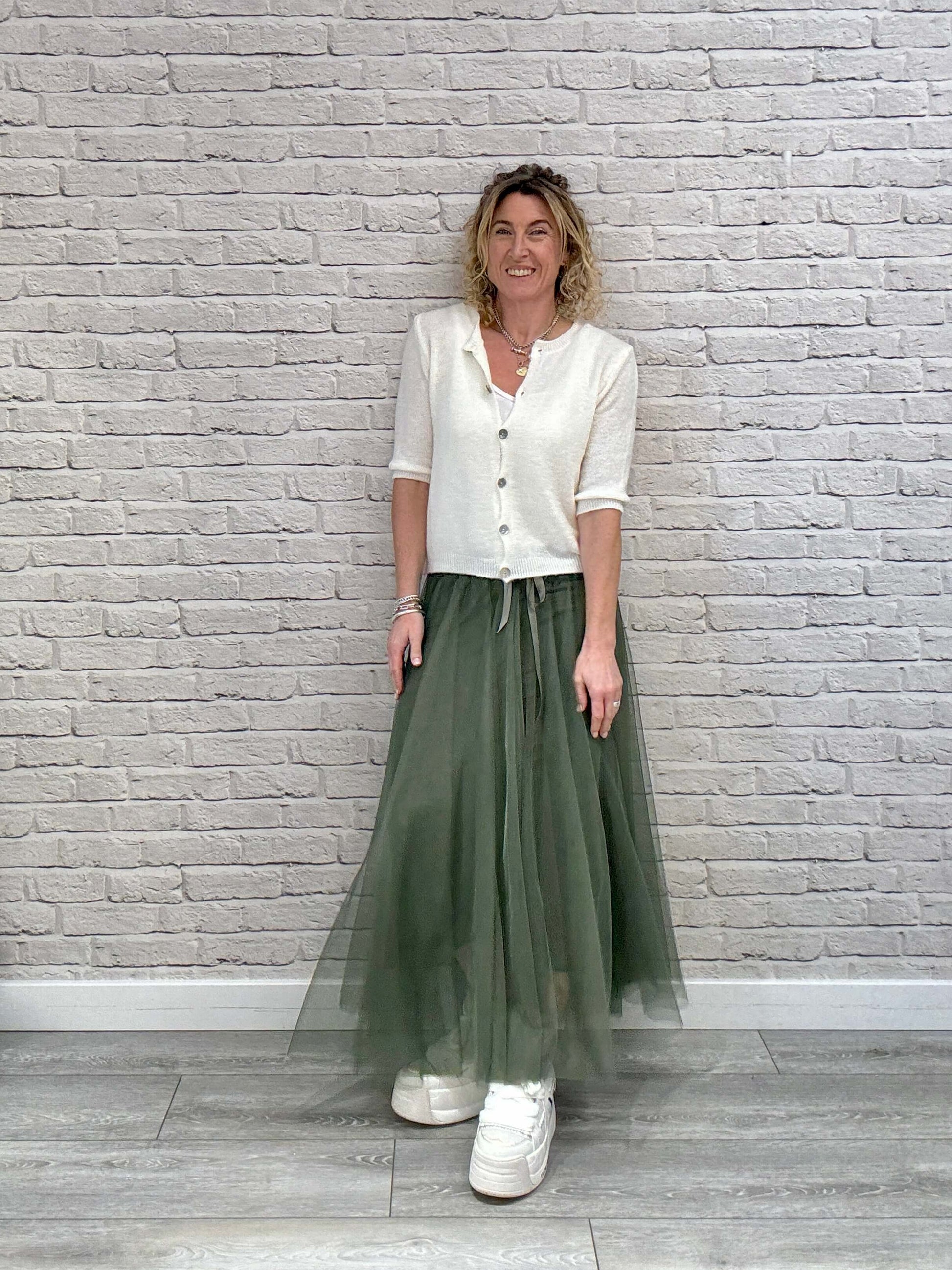 A beautiful Khaki coloured tulle skirt with stretchy satin waistband. Pair simply with our Sarah Cardigan and trainers for an easy-go-to outfit.