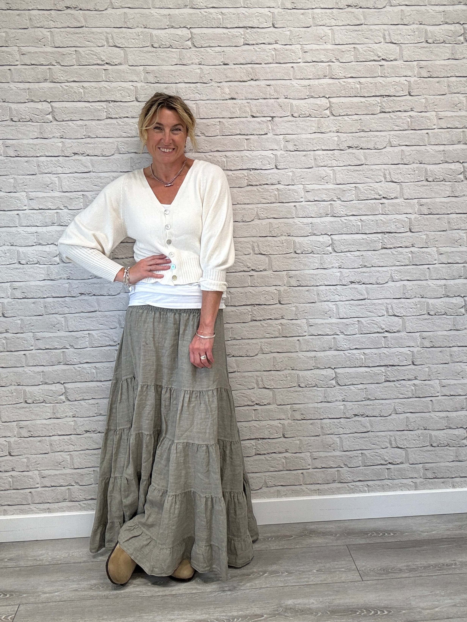 A beautiful tiered maxi skirt in an earthy, mushroom coloured linen. Style it with our chunky Ella Cardigan in Cream or Chocolate for the ultimate Autumn vibe.