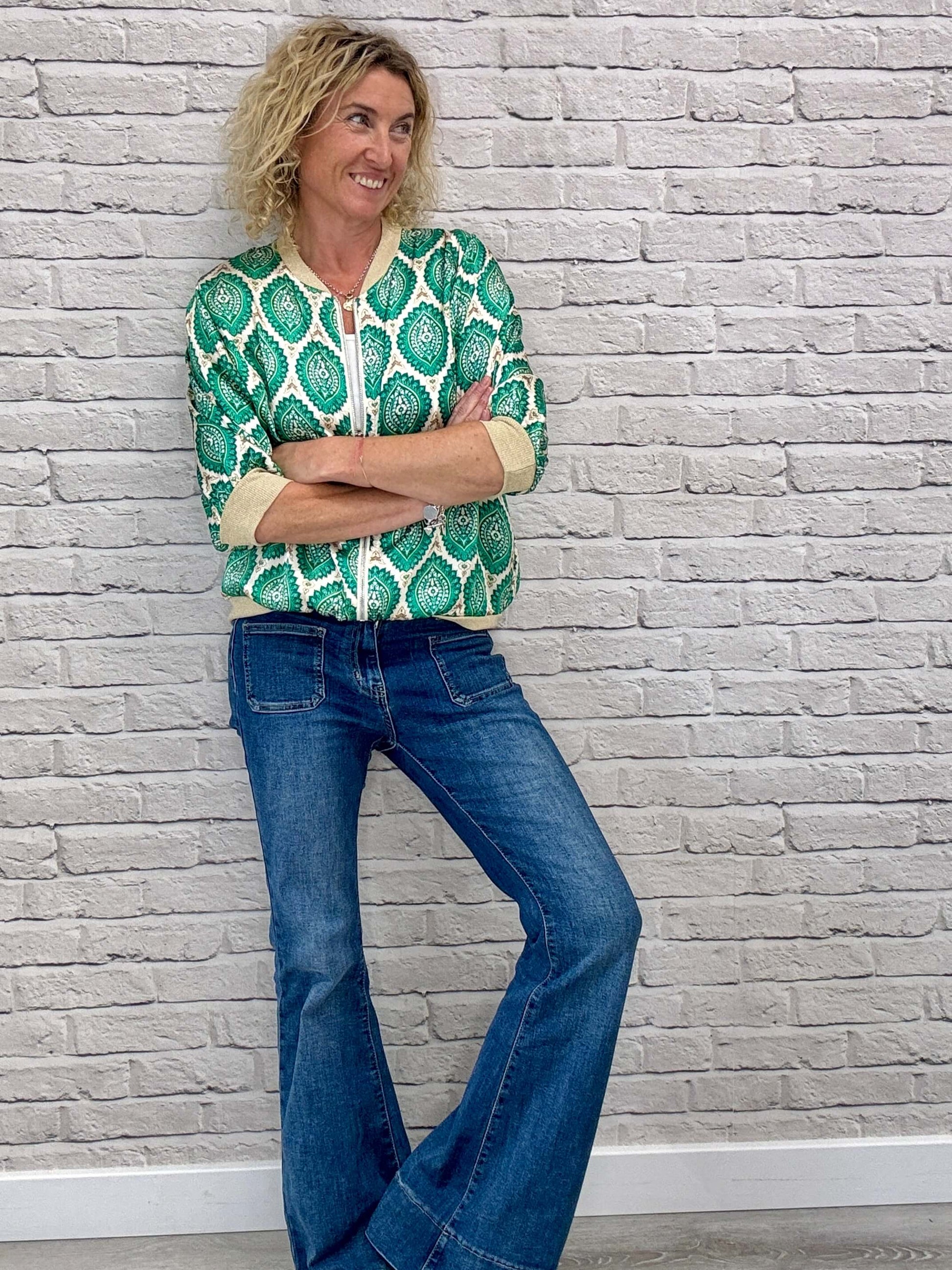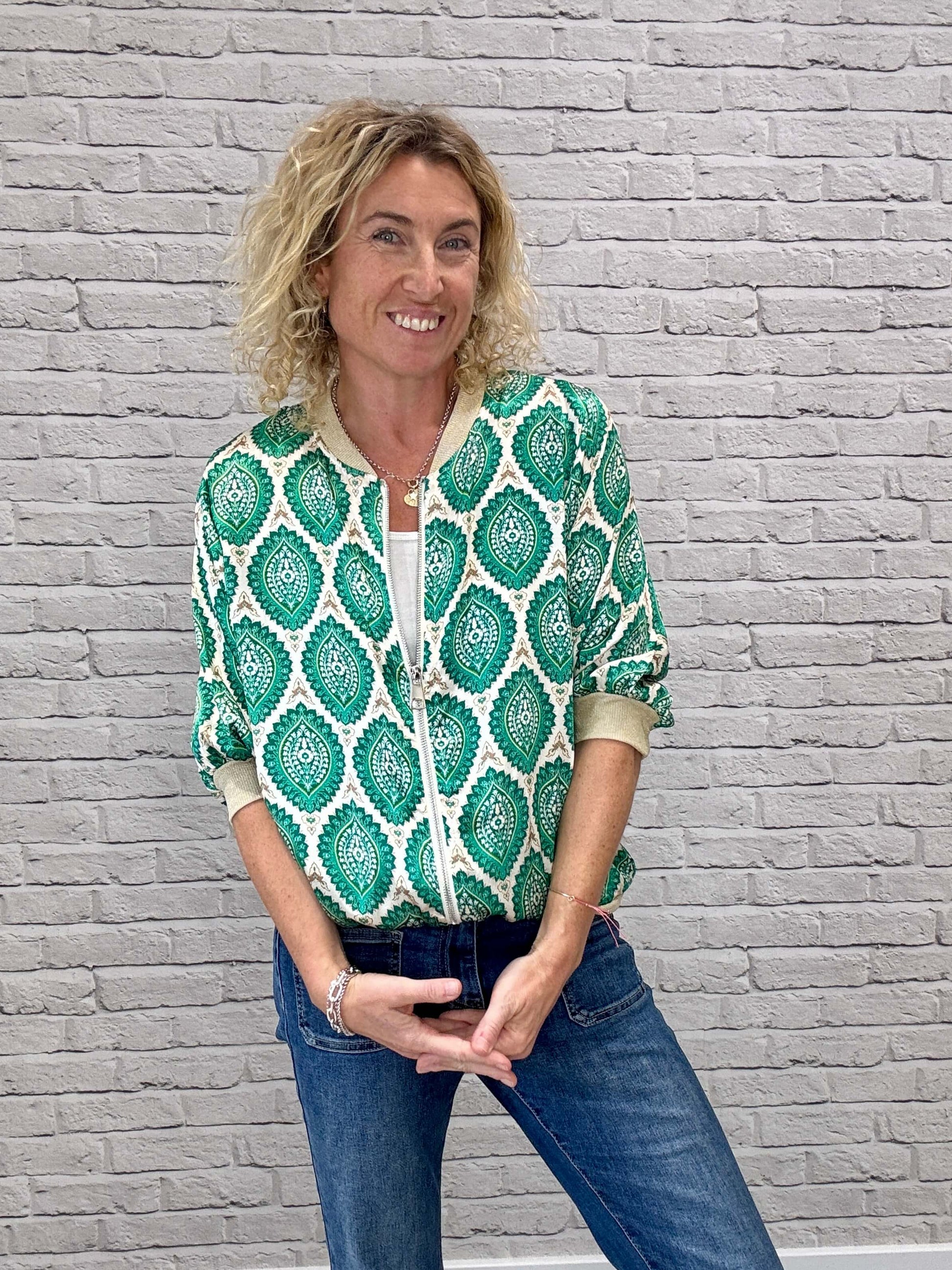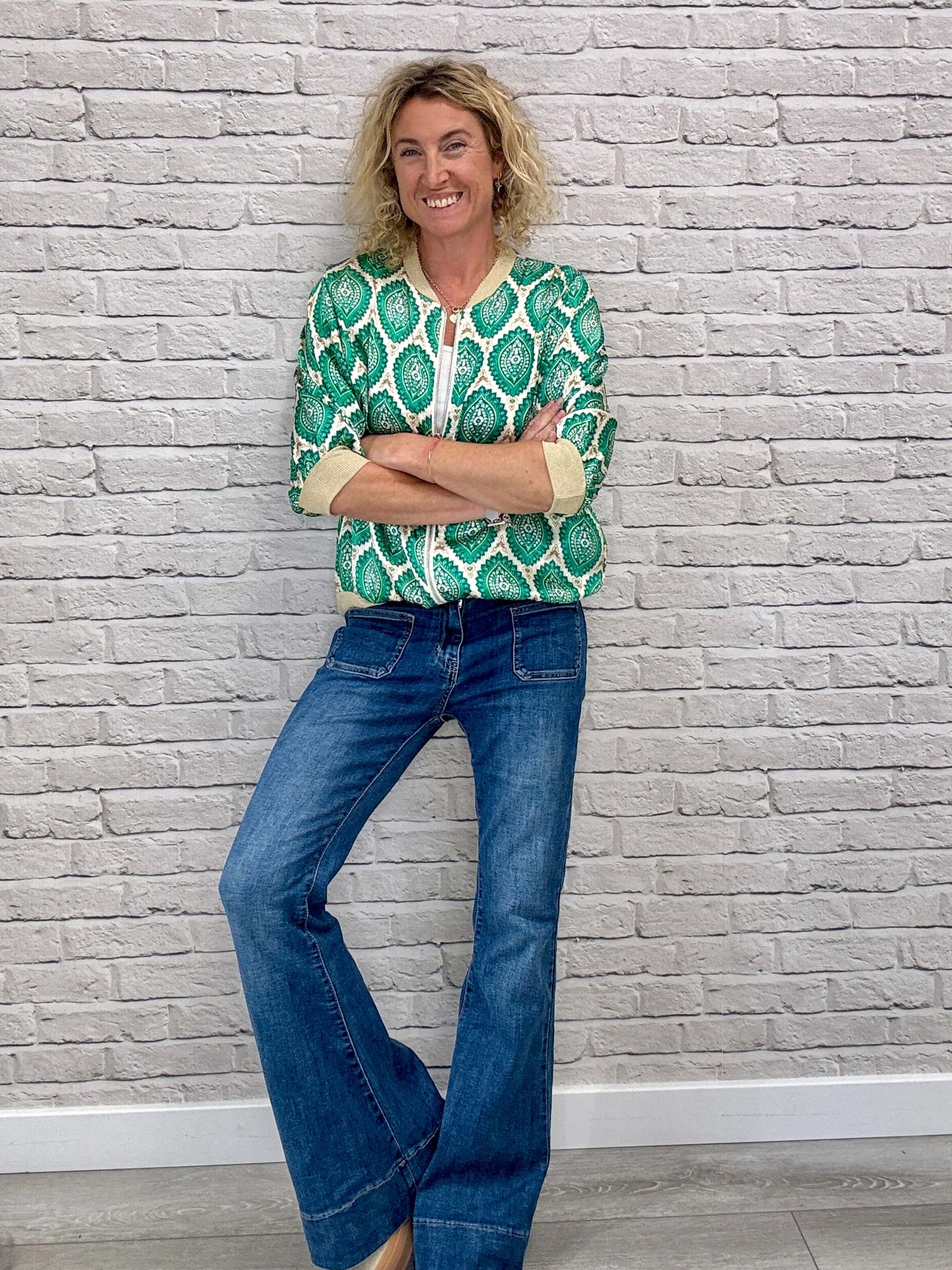 A statement silk bomber jacket with sparkly gold trim. For effortless glam, just add jeans.