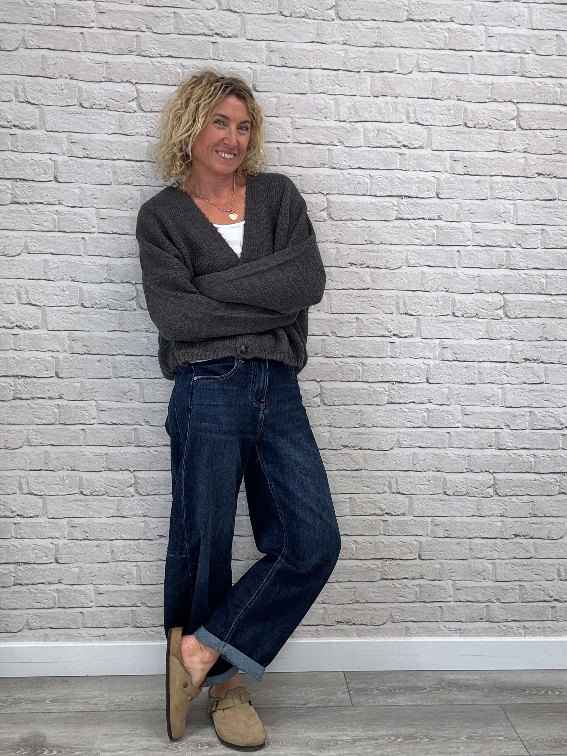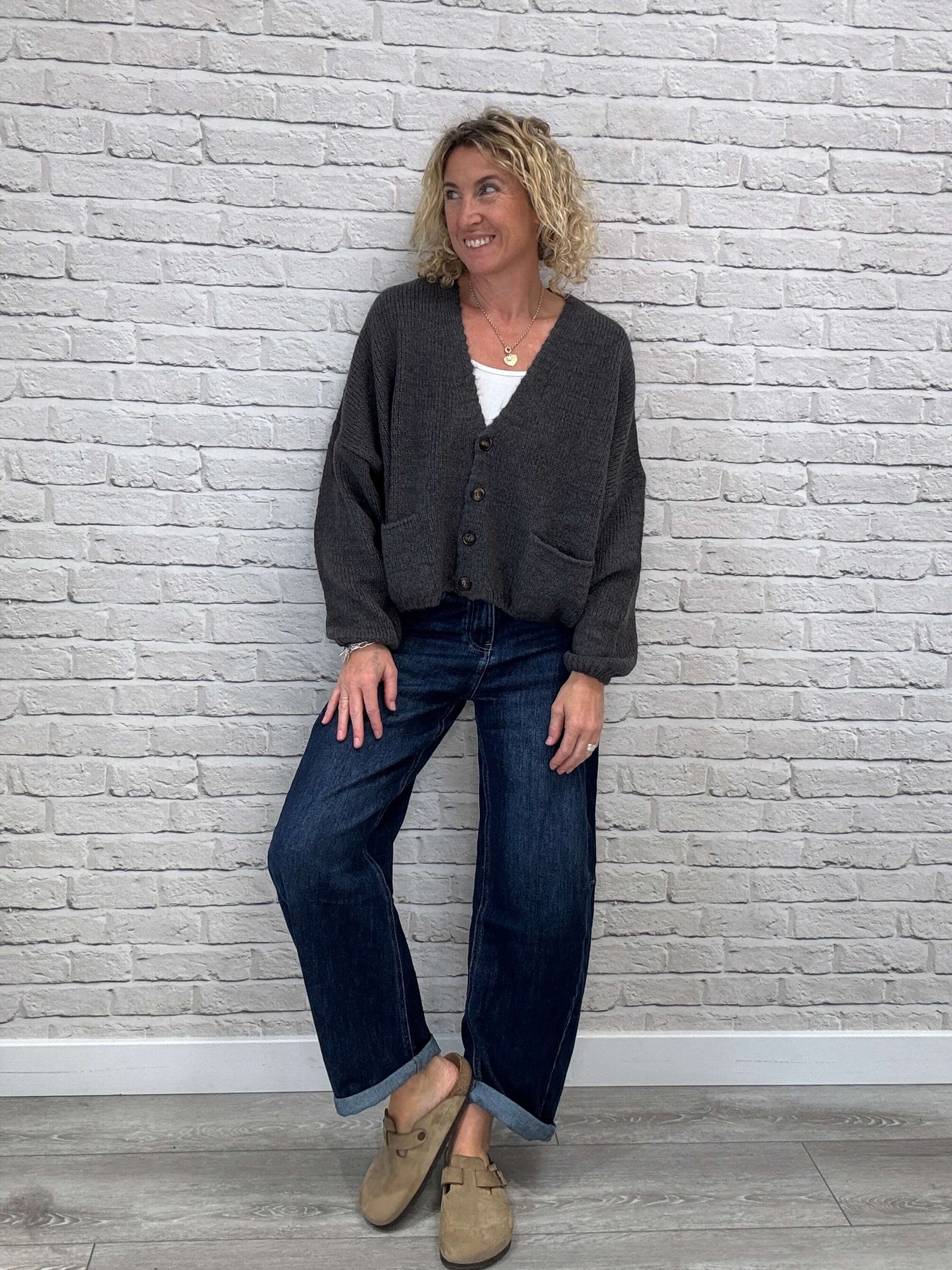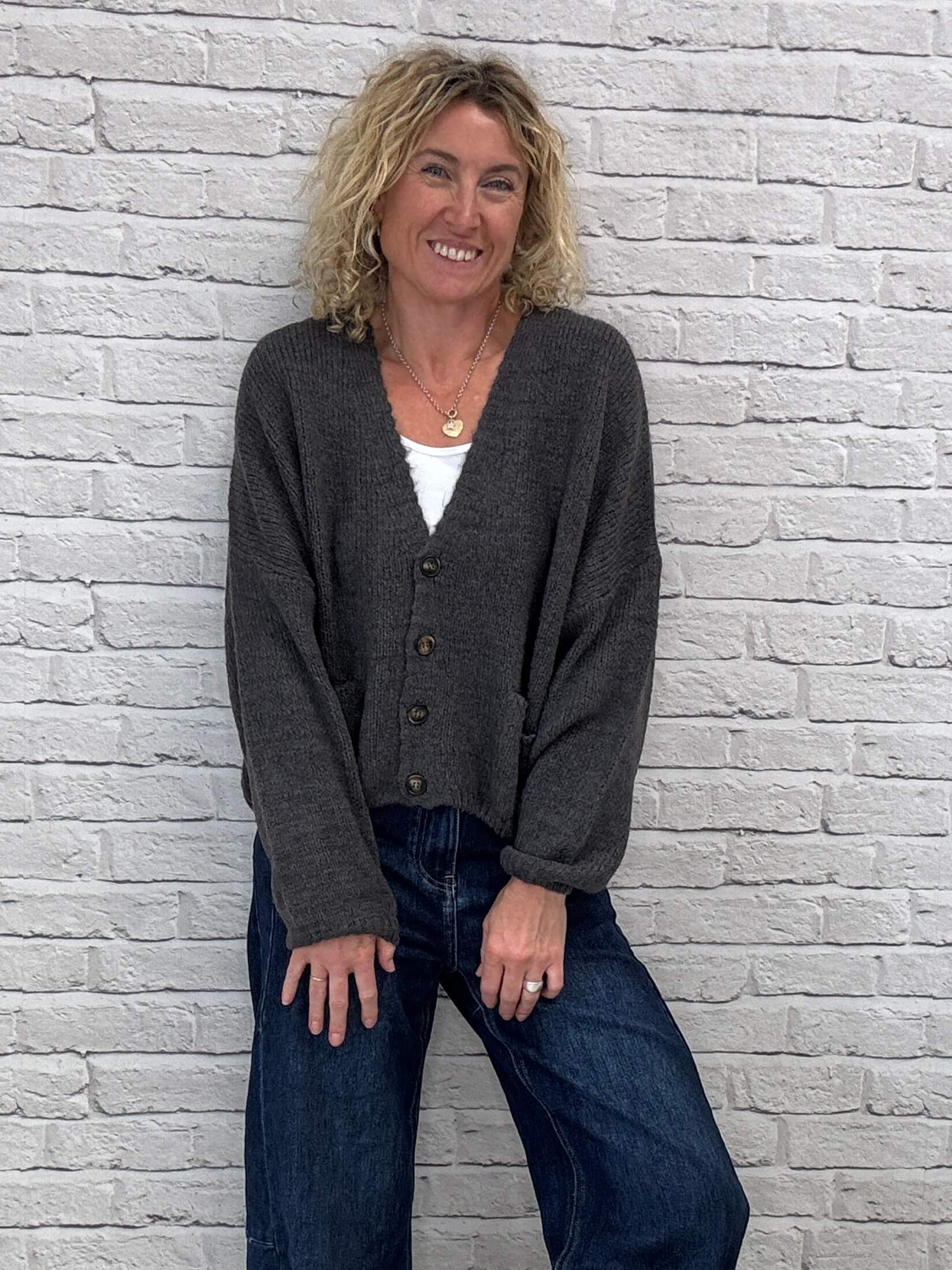 Chunky cardigan in a soft, slouchy knit with grandad style front pockets. The perfect oversized knit to snuggle into Autumn with.