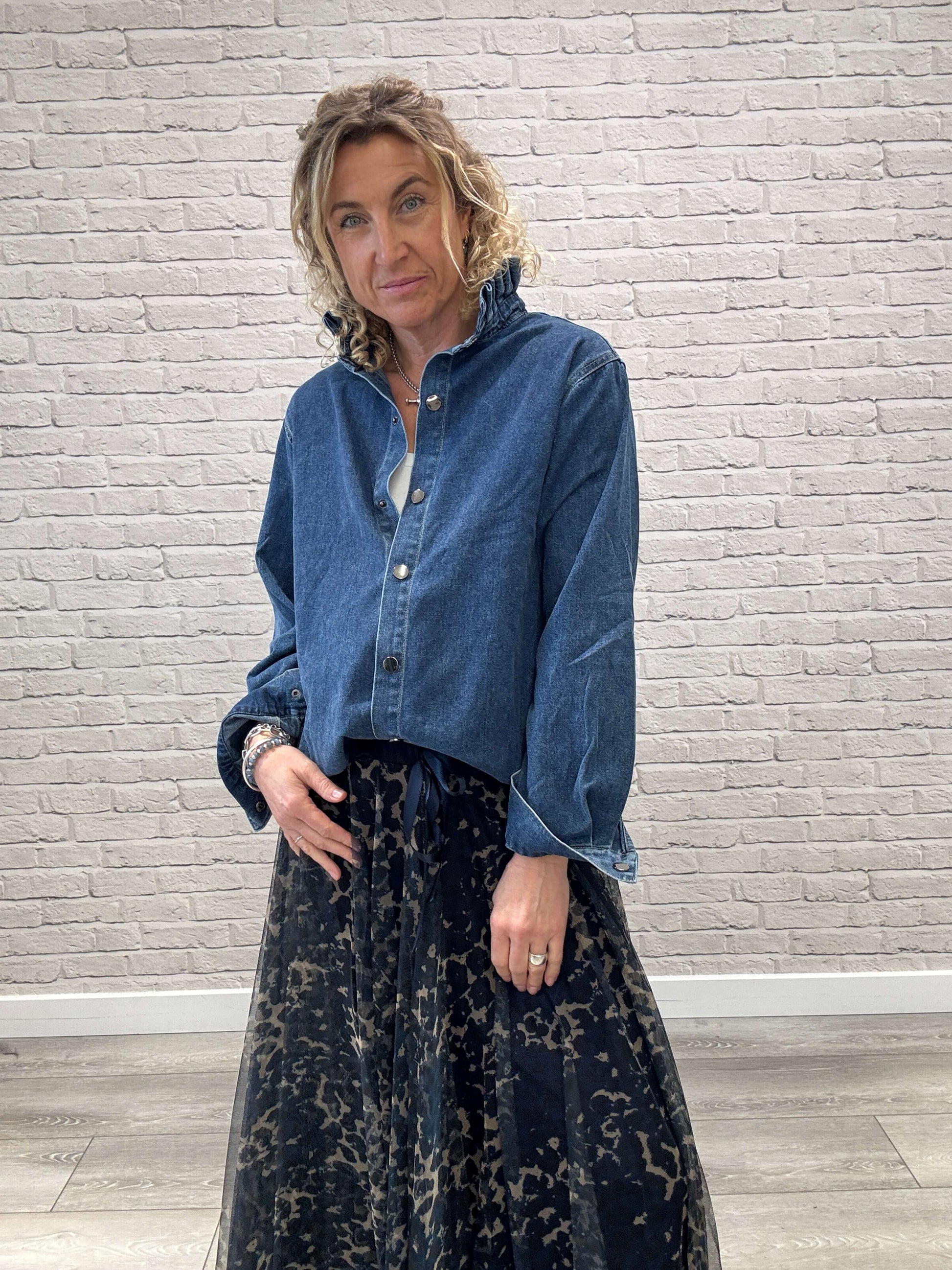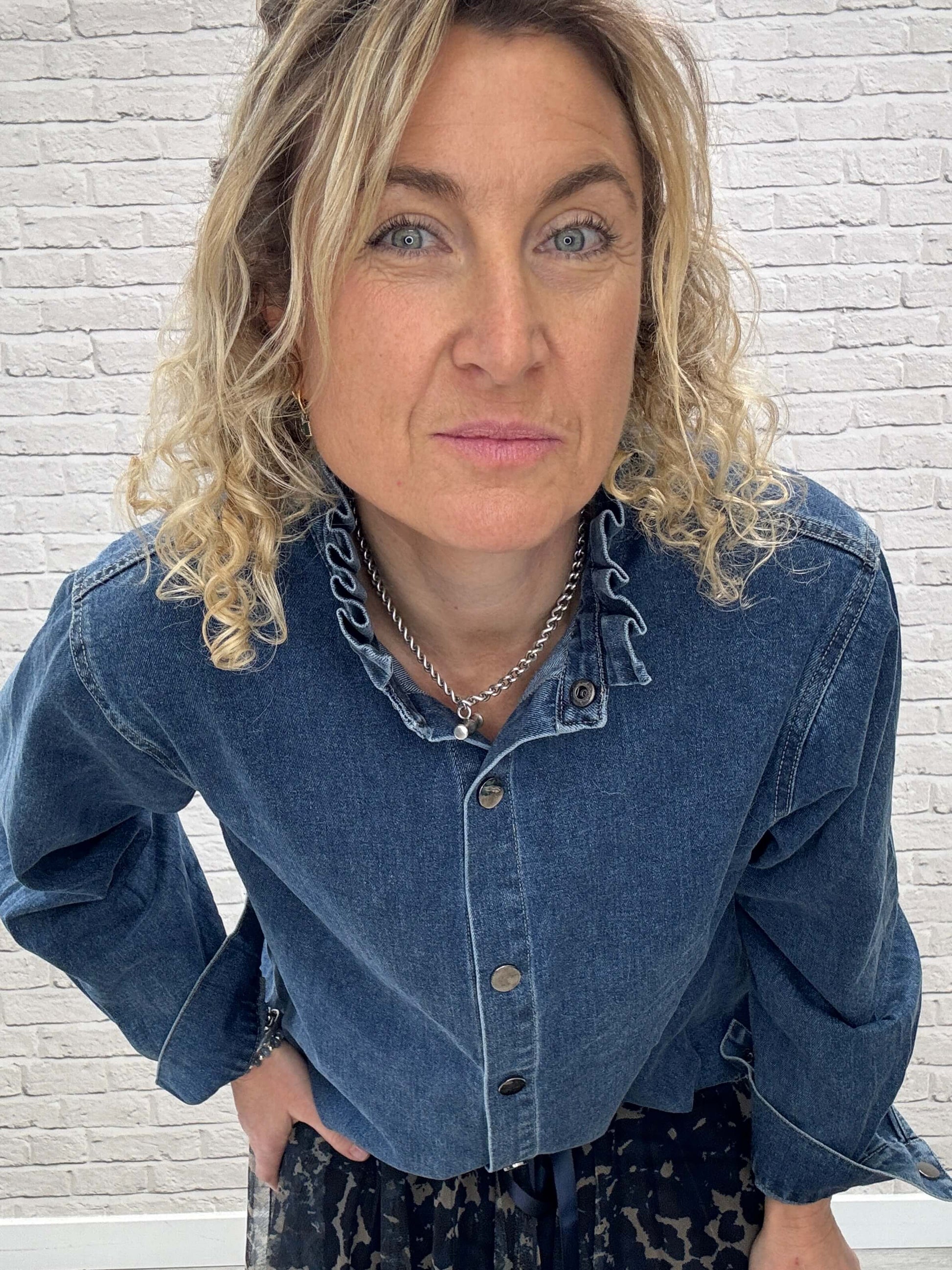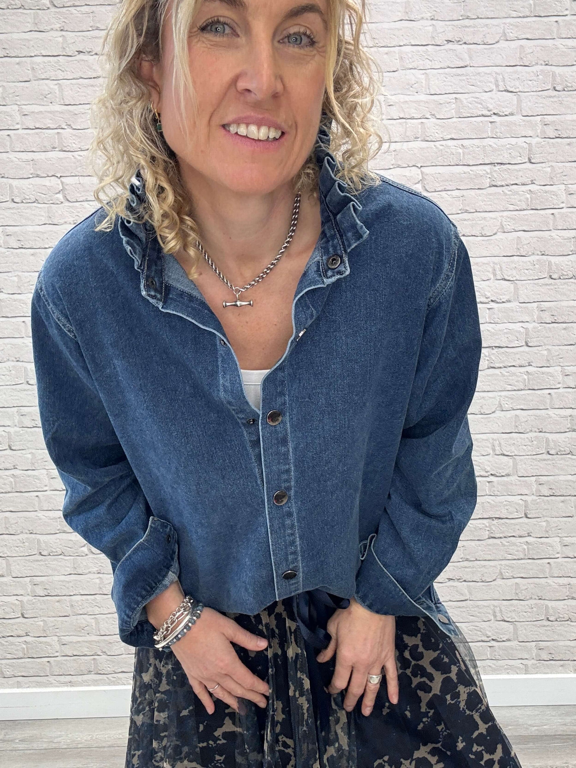 The perfect blend of shirt and jacket — this gorgeous denim shacket features a standing ruffle collar and a flattering medium-weight feel. Style it your way: French tucked into jeans or skirts, or worn open over your favourite layers. Effortless, feminine, and endlessly versatile.