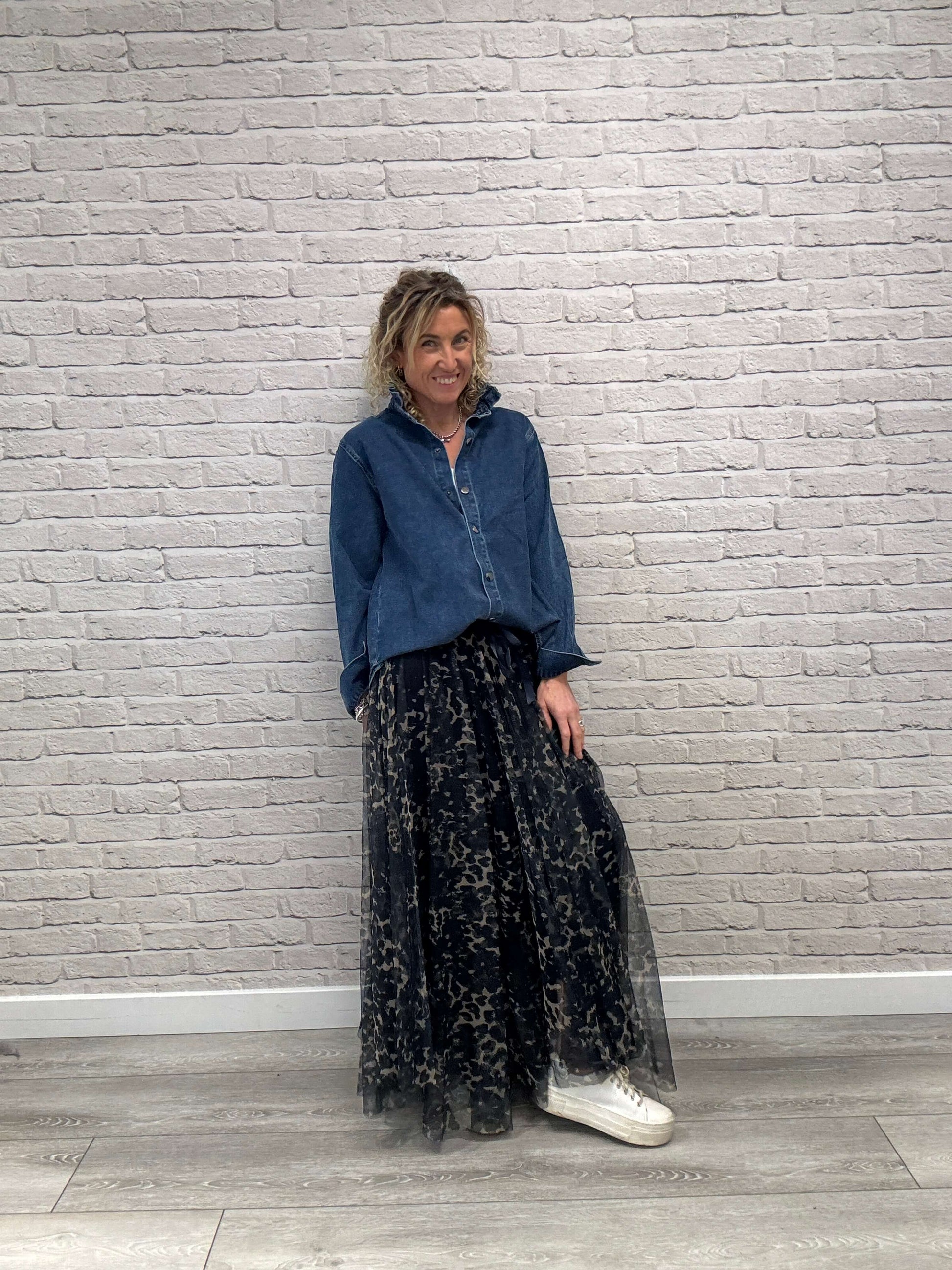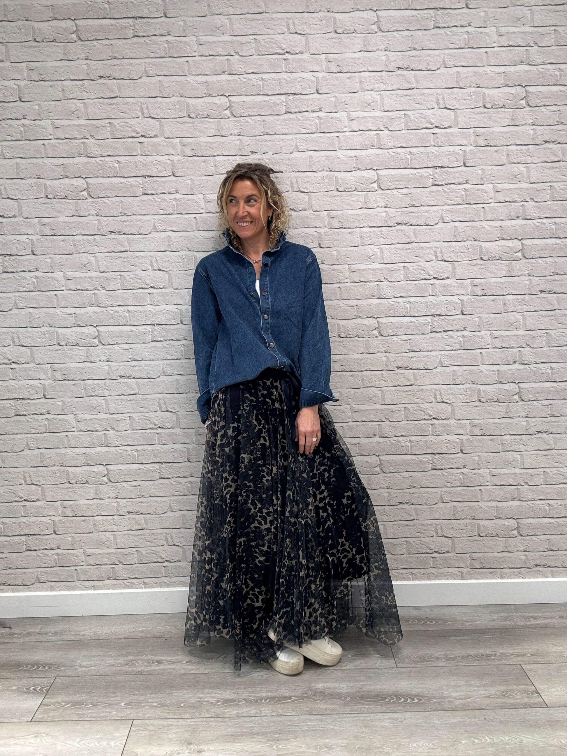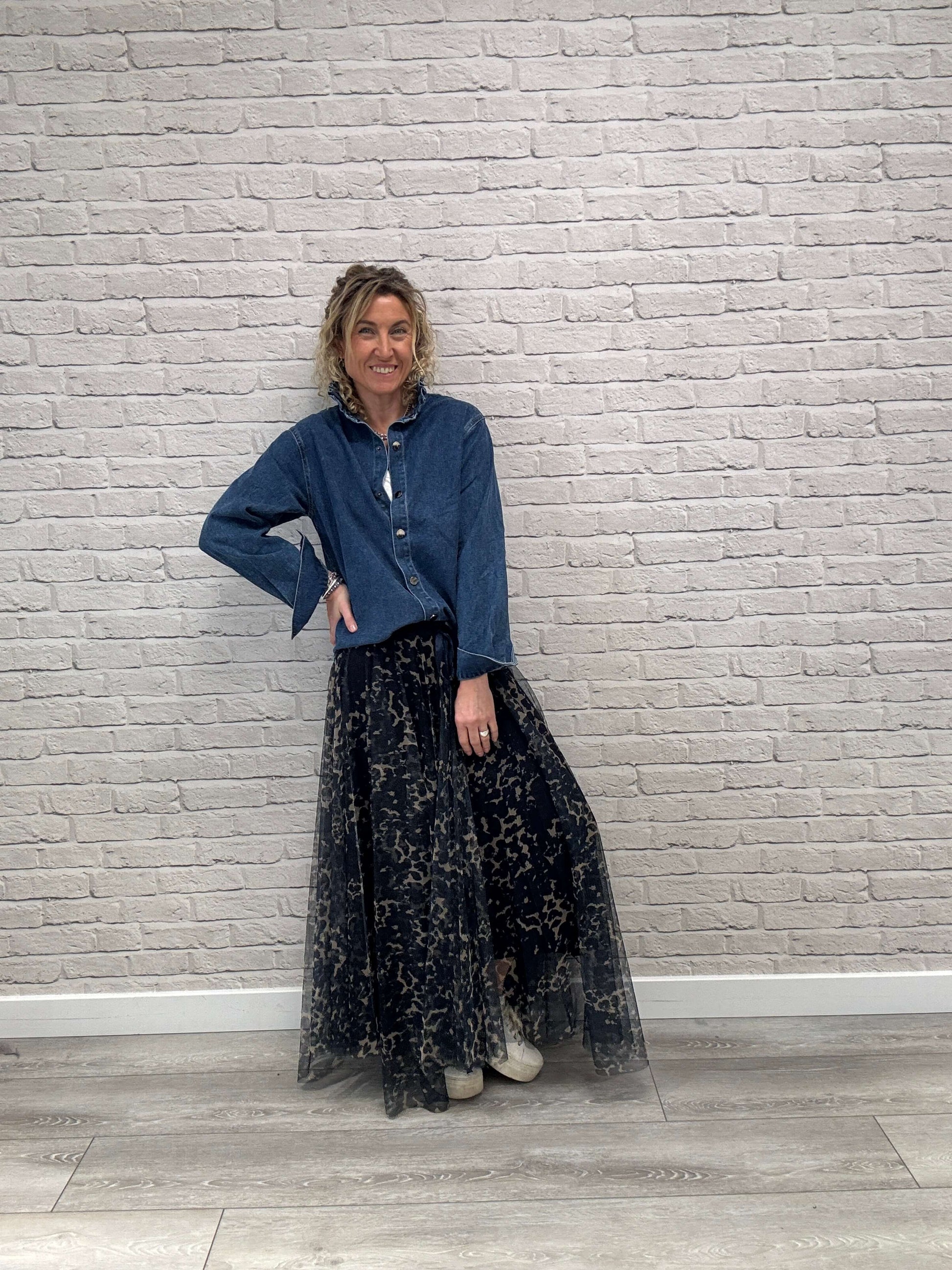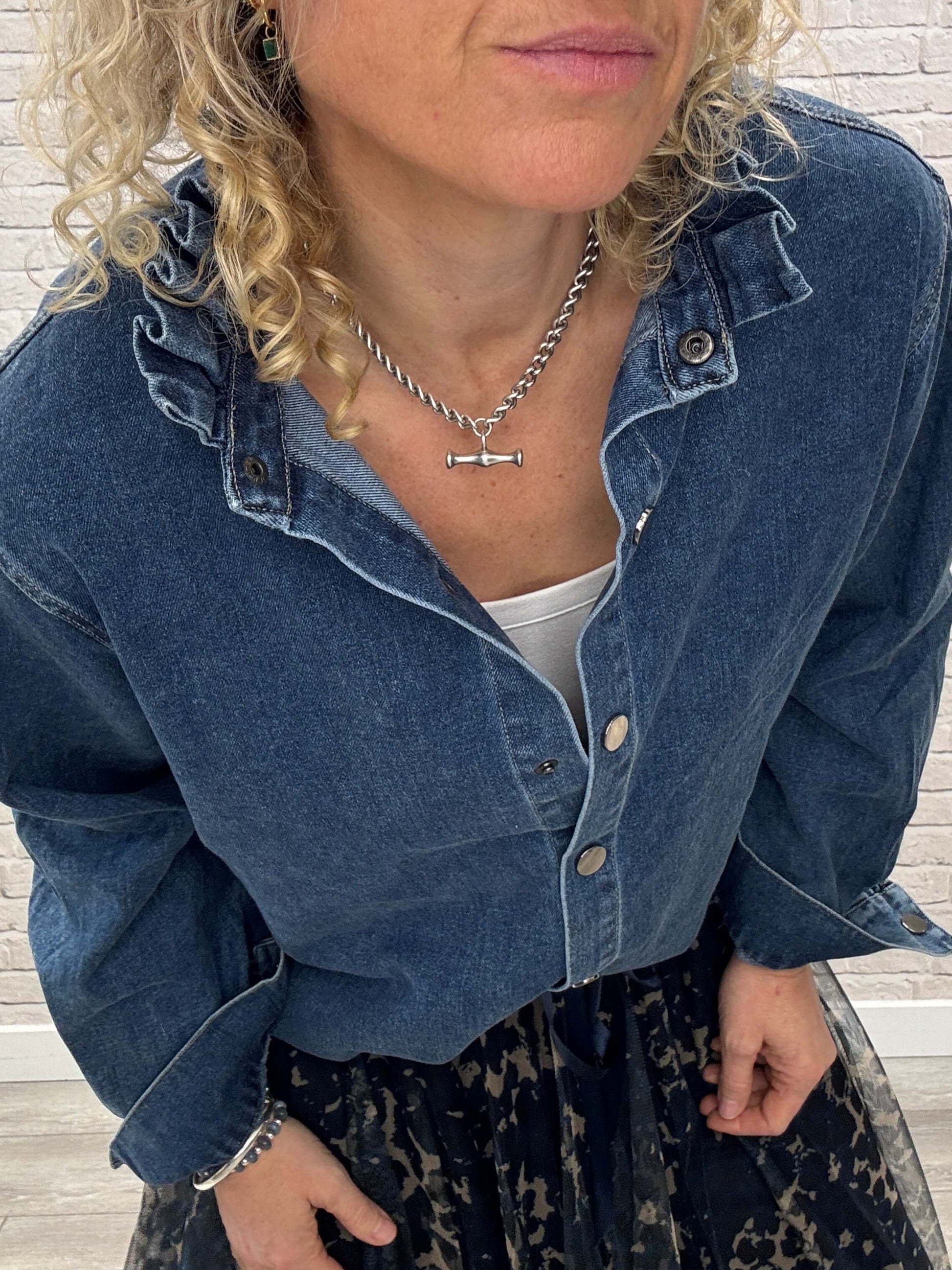 The perfect blend of shirt and jacket — this gorgeous denim shacket features a standing ruffle collar and a flattering medium-weight feel. Style it your way: French tucked into jeans or skirts, or worn open over your favourite layers. Effortless, feminine, and endlessly versatile.