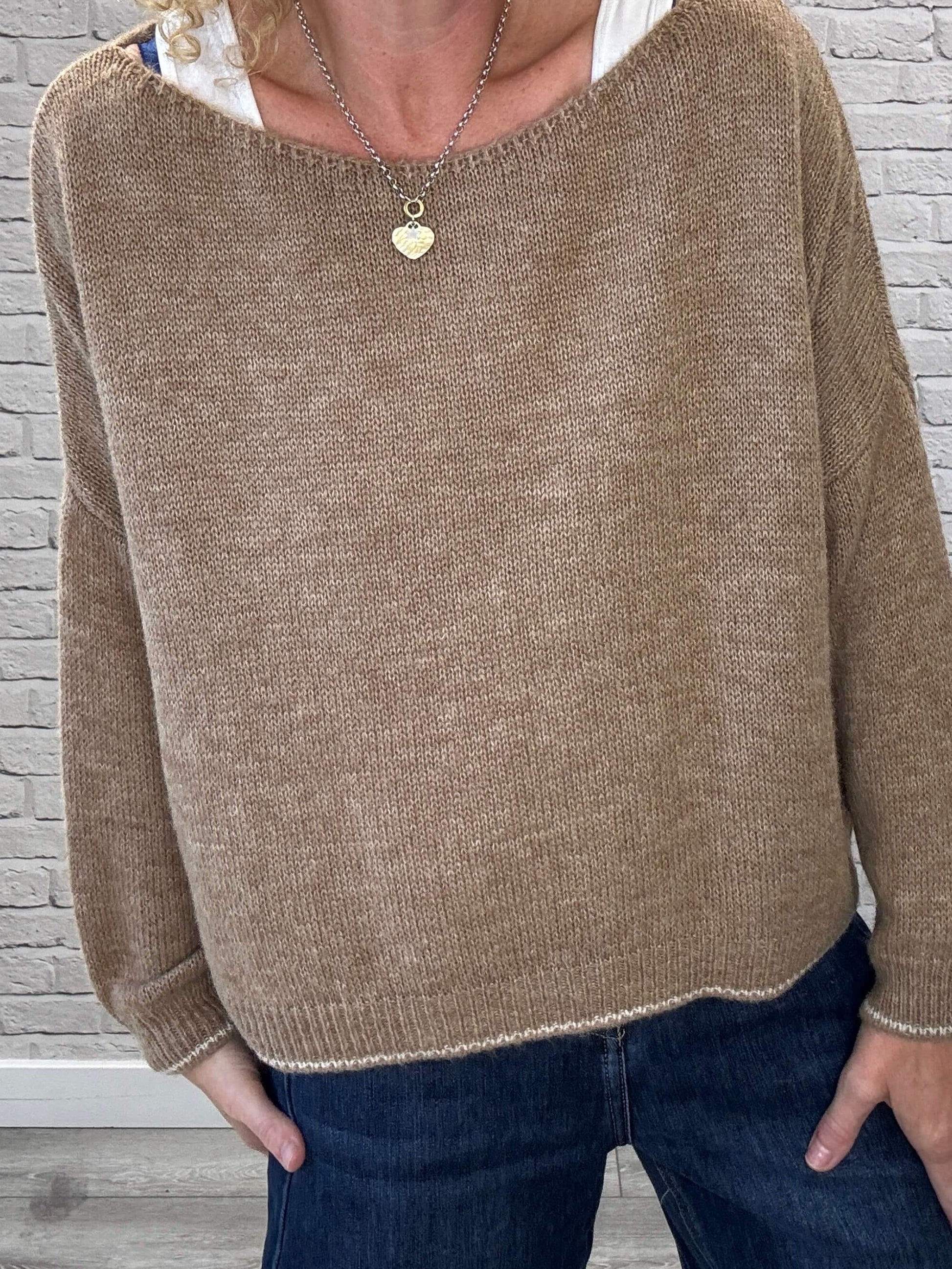 Relaxed wide-neck jumper with a slouchy fit. Contrasting cream trim on the cuffs and hem. A cosy effortless knit you'll wear on repeat.