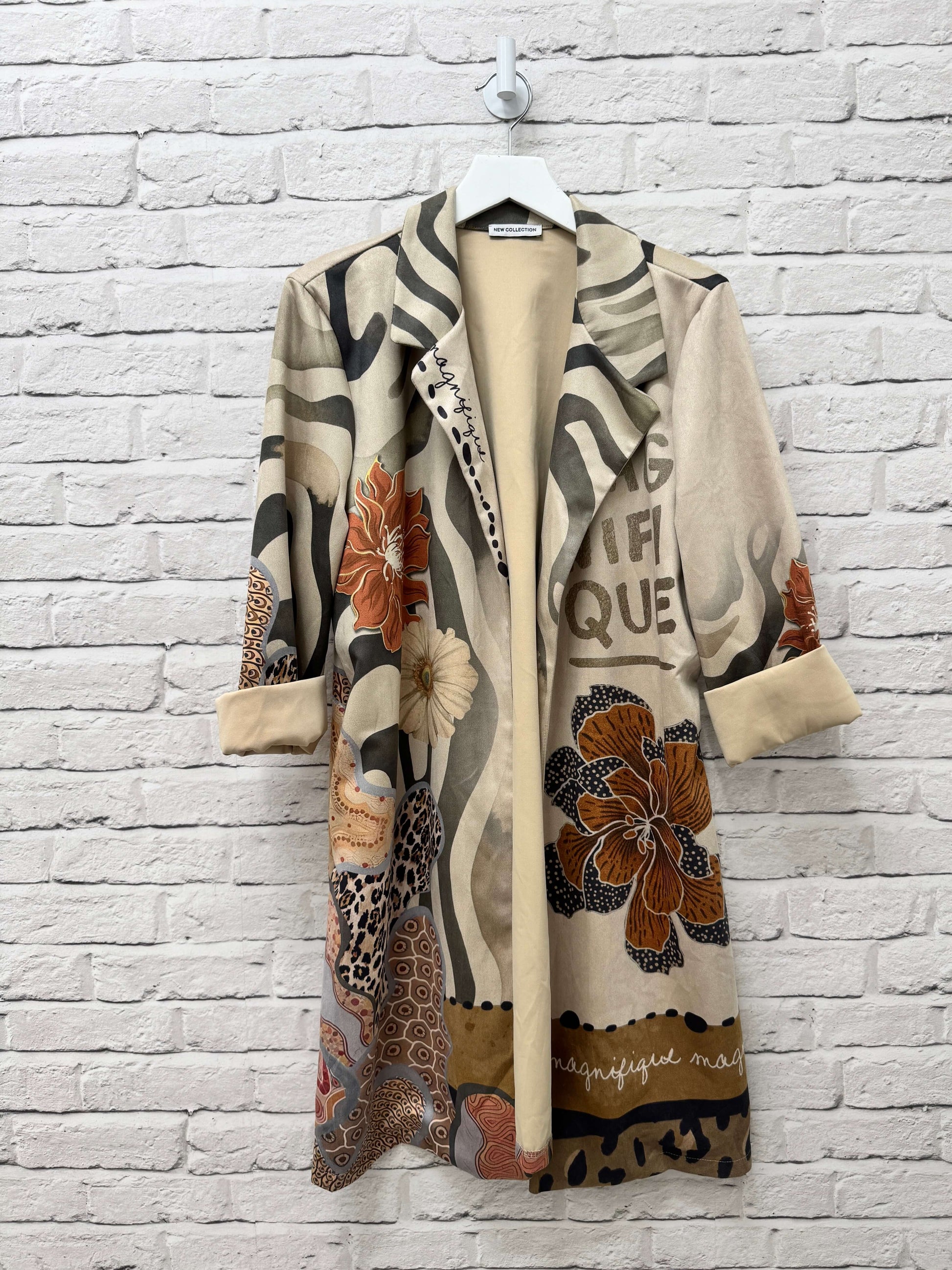 An amazing faux suede coat that pops with a vibrant, colourful print. Soft and supple to touch. A statement piece with instant mood boosting power.