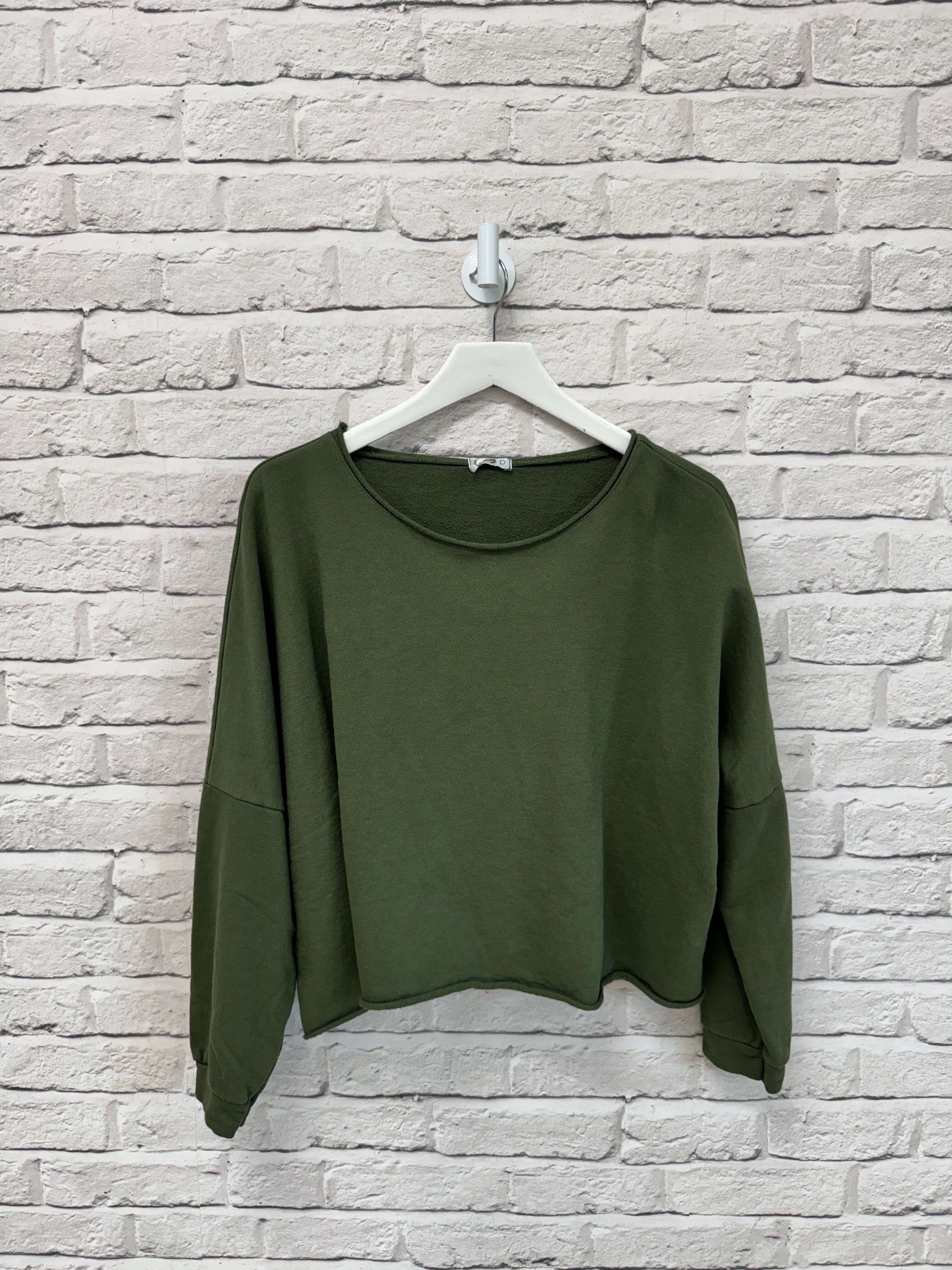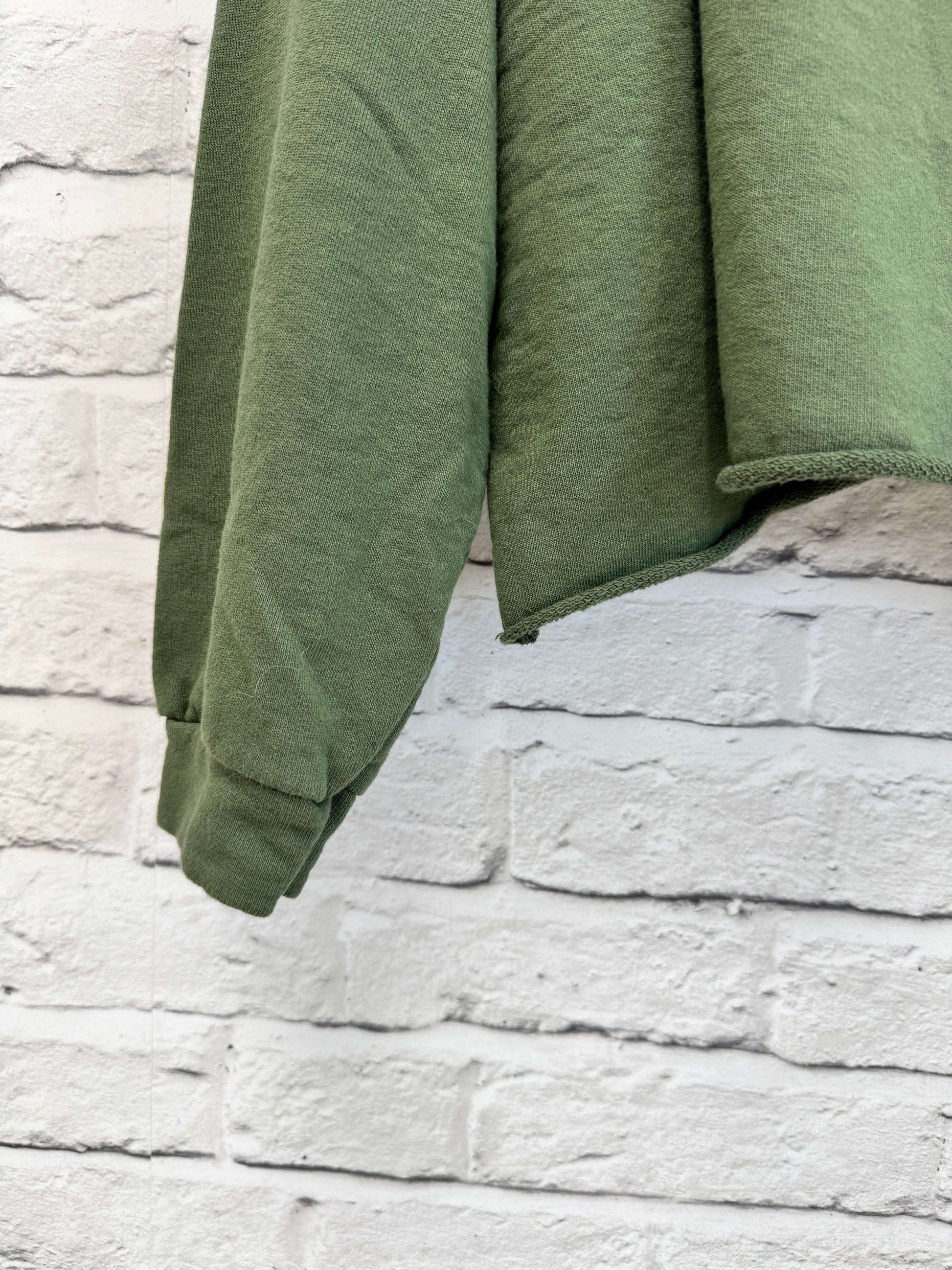 Slightly cropped raw-edge sweatshirt with a wide neck and an easy slouchy feel. Works with literally everything. Throw it over our longline vest for that perfect laid-back layered vibe.