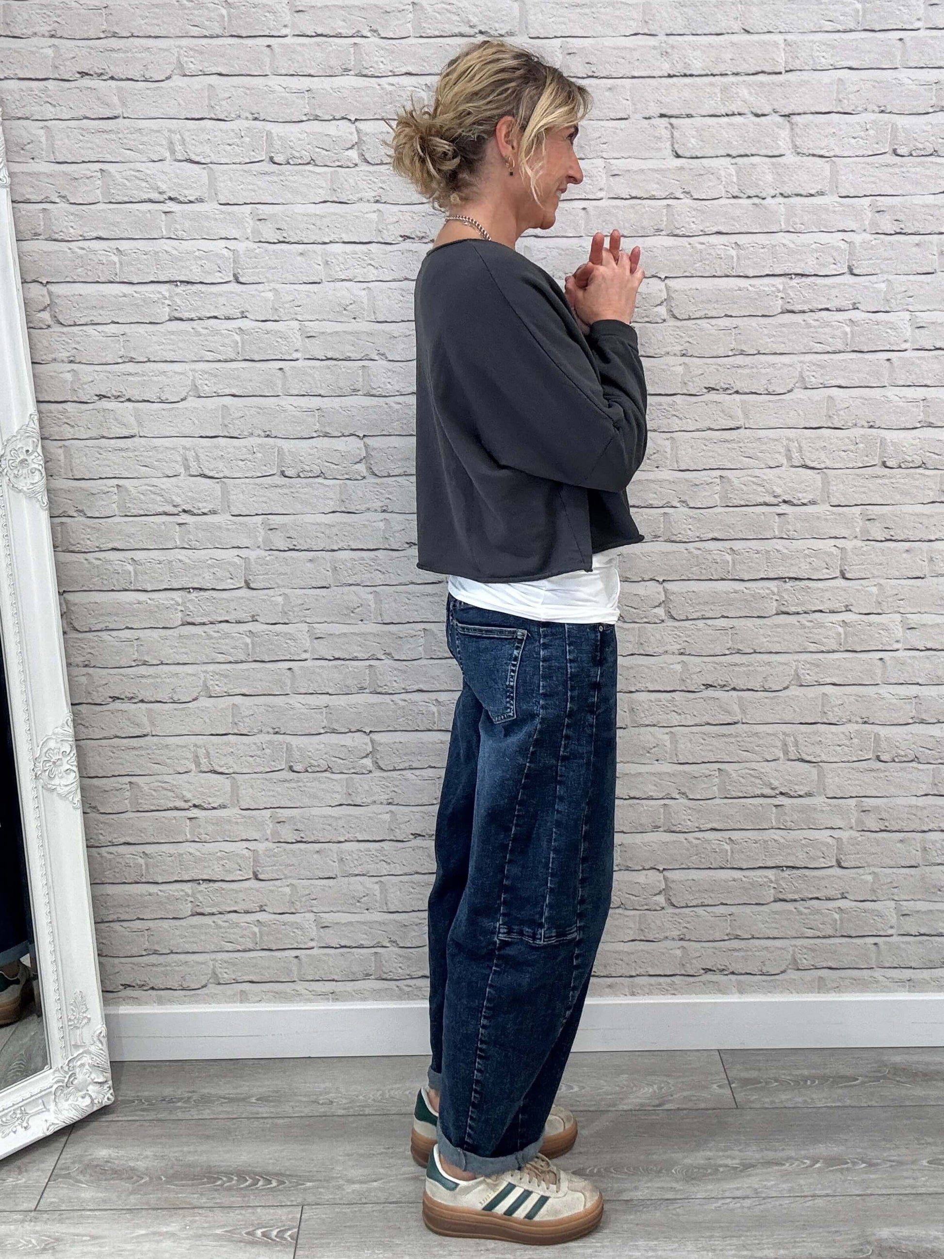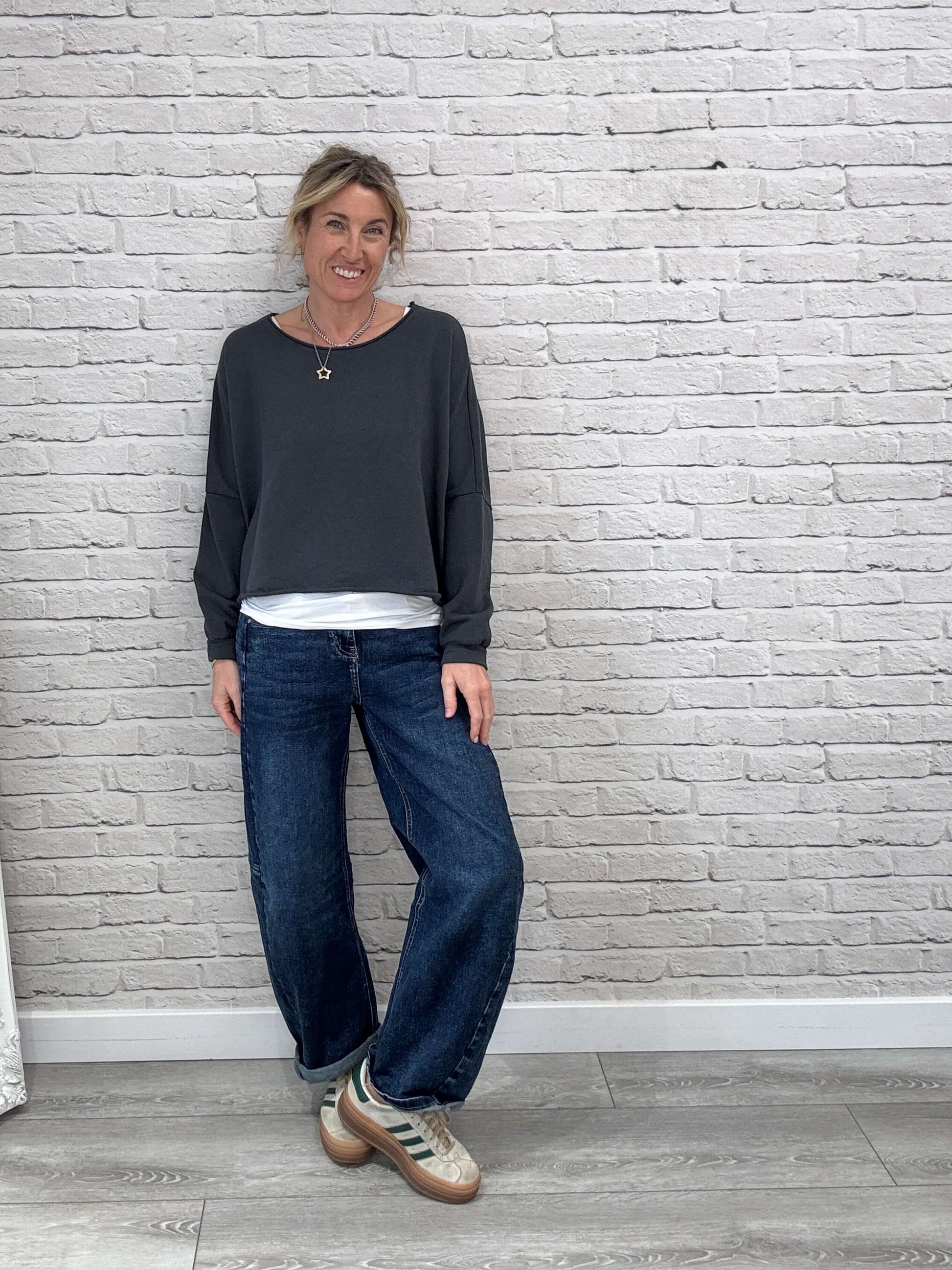 Slightly cropped raw-edge sweatshirt with a wide neck and an easy slouchy feel. Works with literally everything. Throw it over our longline vest for that perfect laid-back layered vibe.