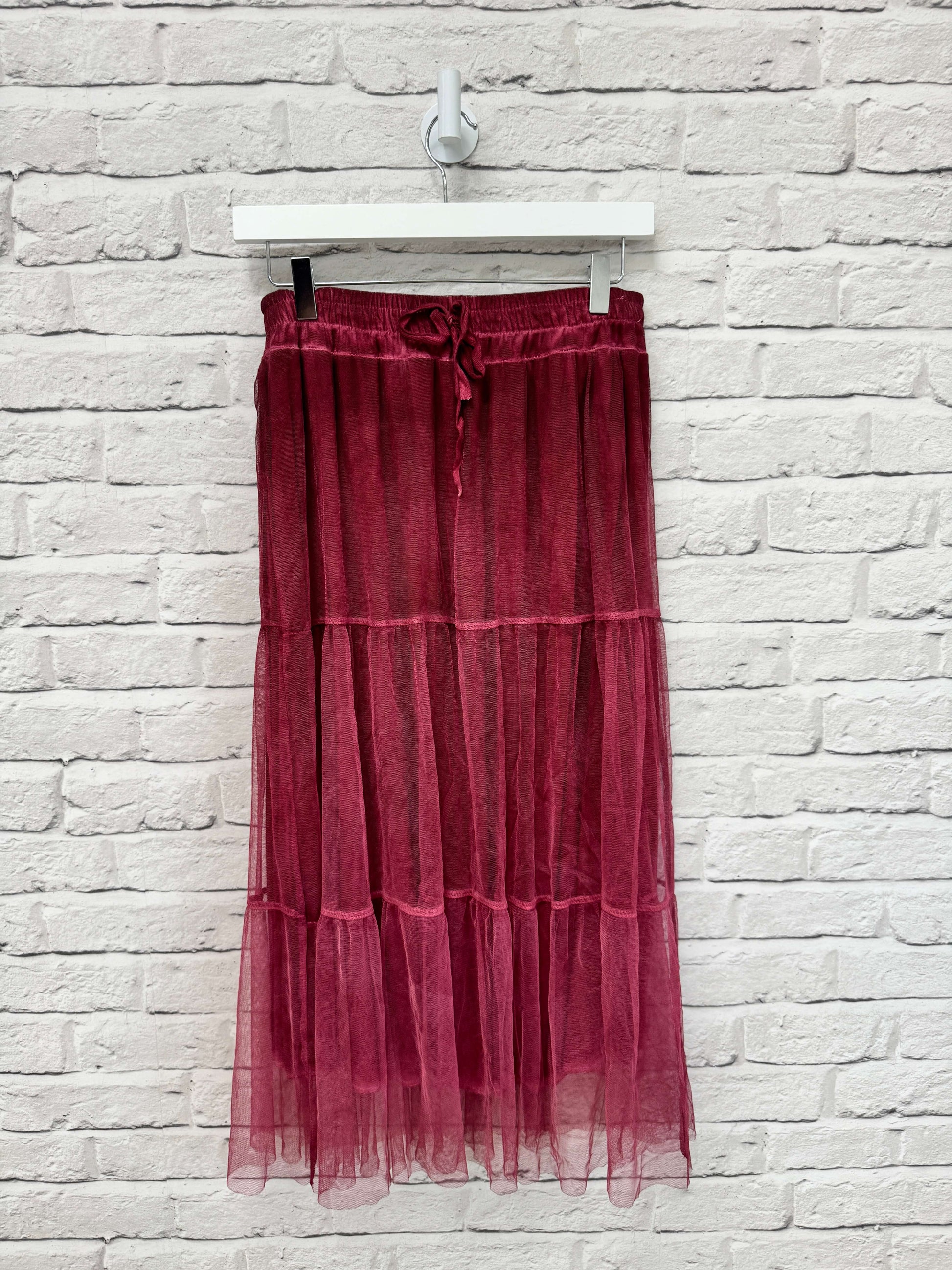 Super cute tulle midi skirt with soft floaty tiers. Stretchy tie waistband.