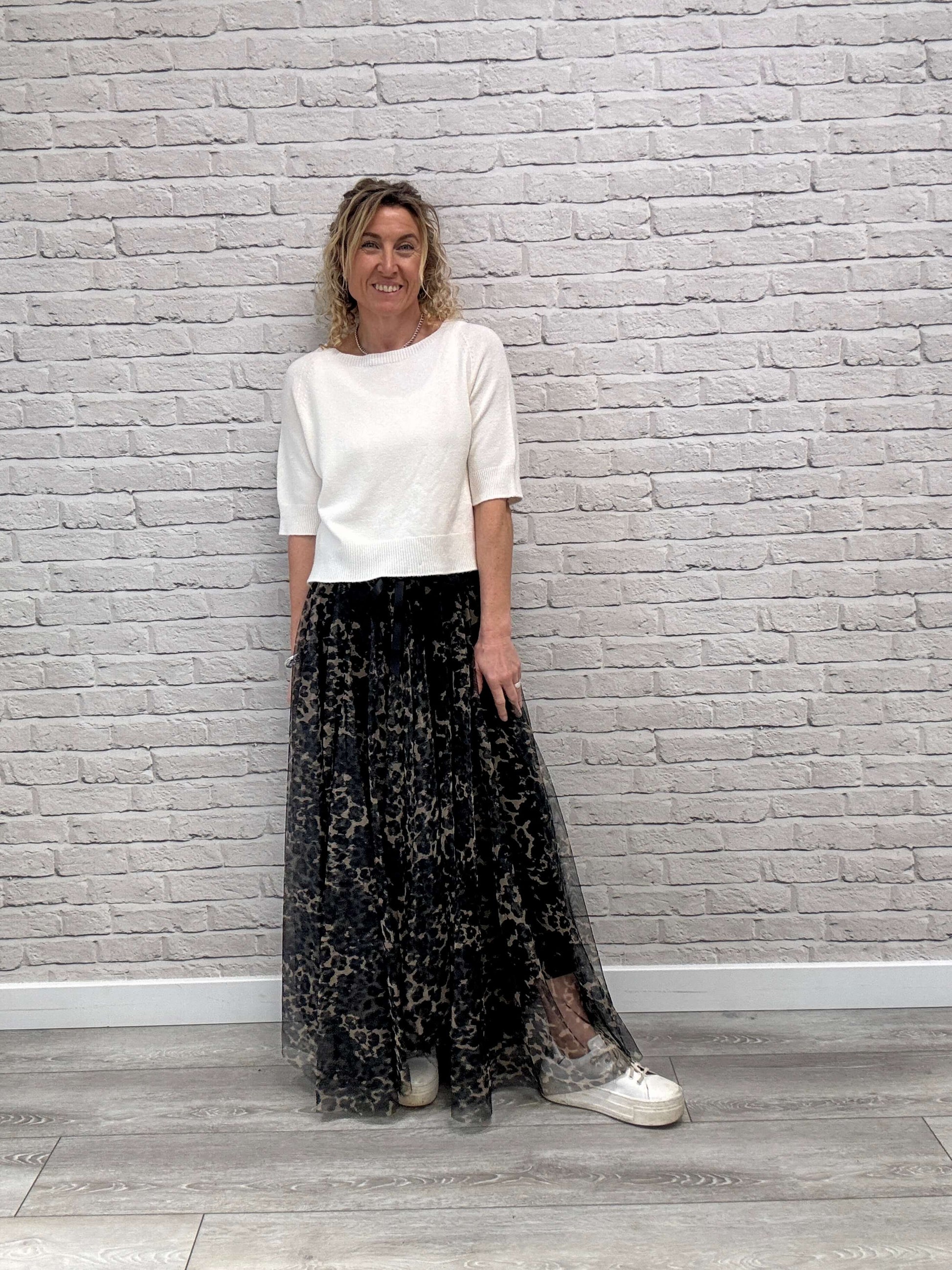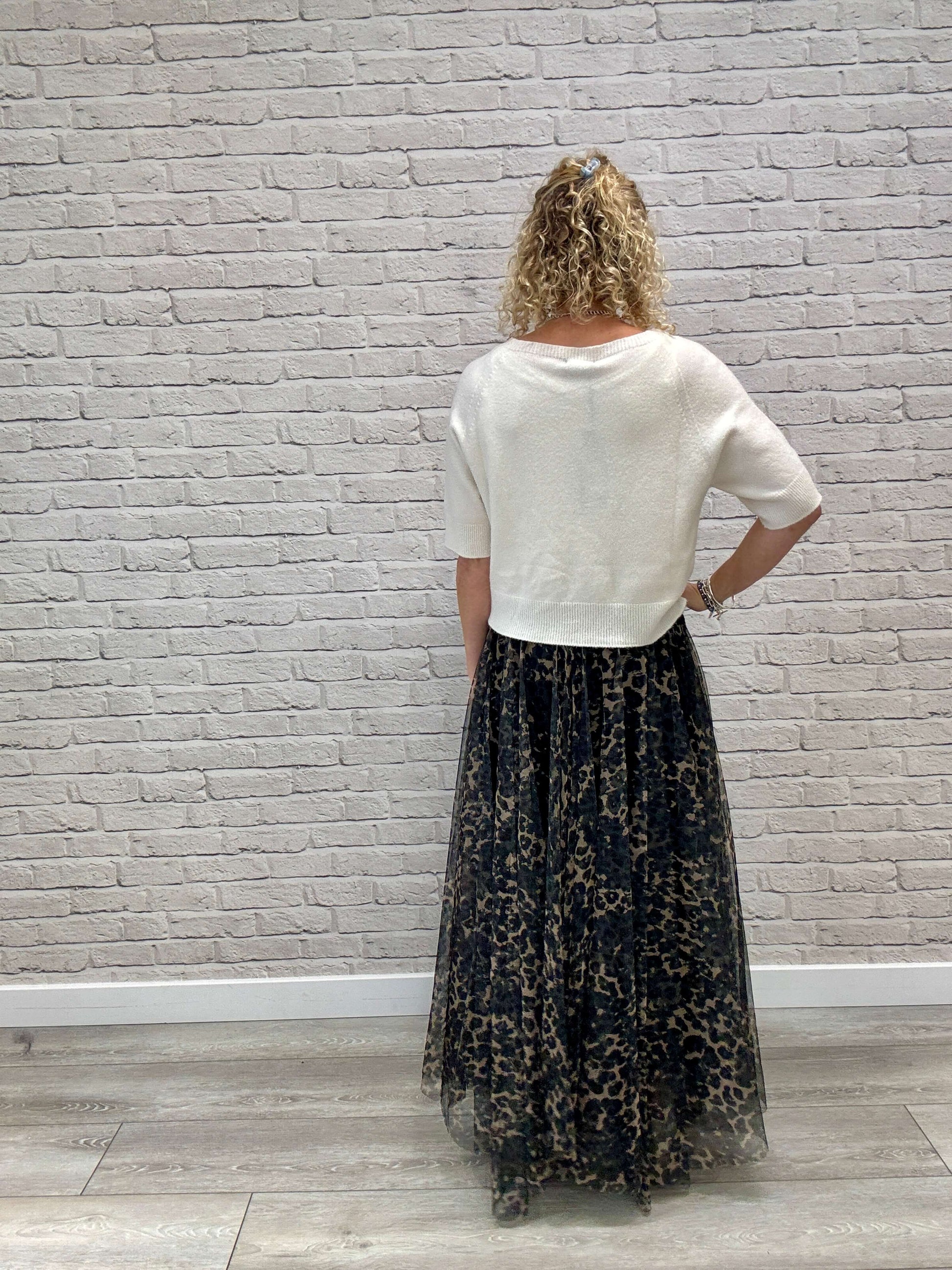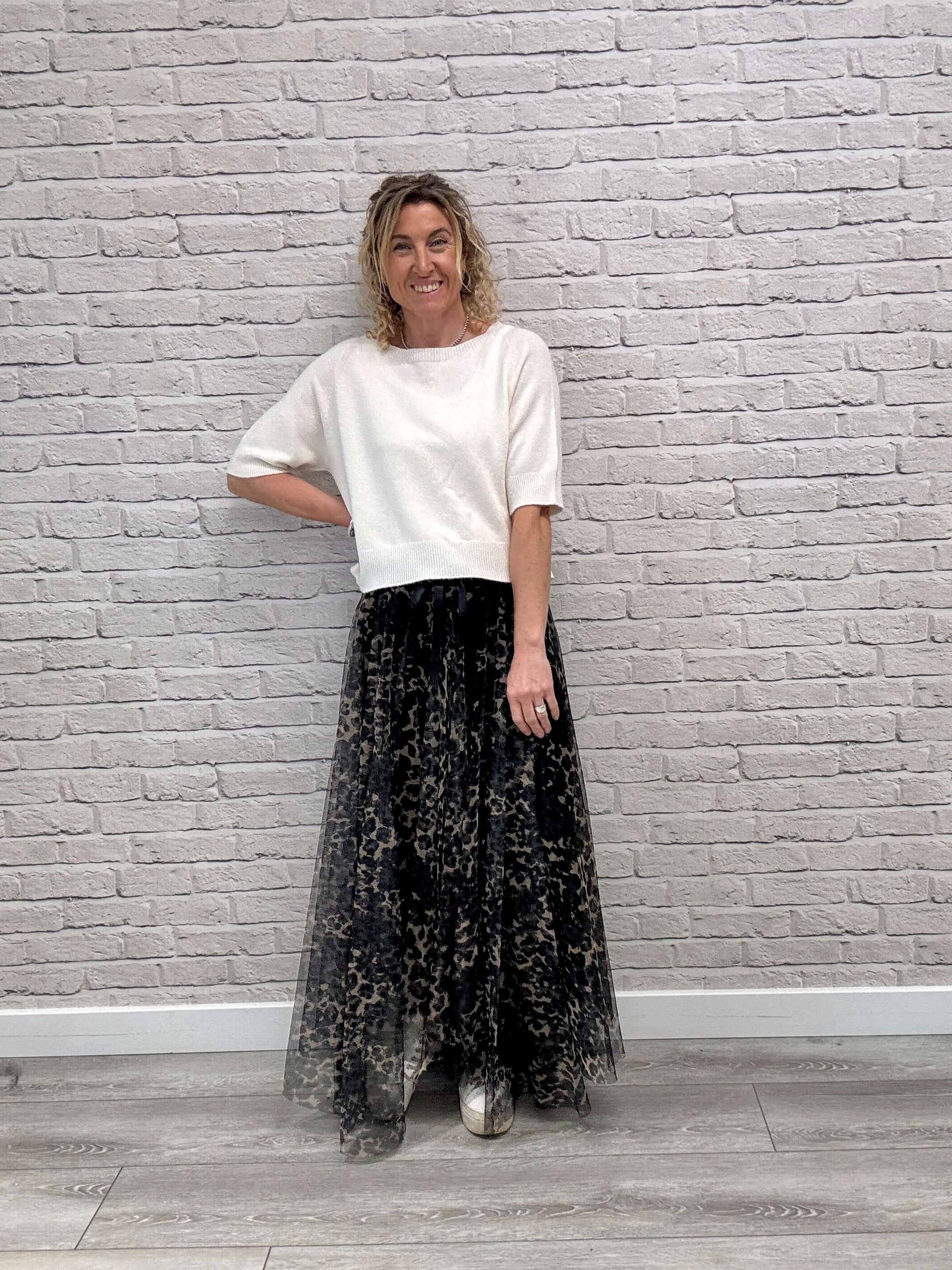A stunning floaty tulle skirt with satin waistband and front tie. An absolute winner at this year's fairs. Works perfectly paired with our Melrose or Hamptons Cardigan or a fitted Charlotte Knit.