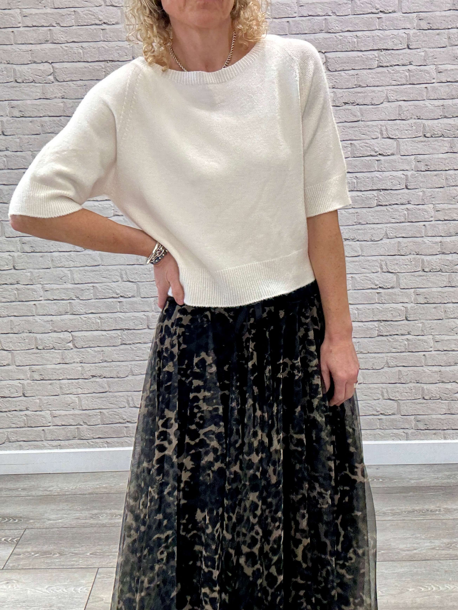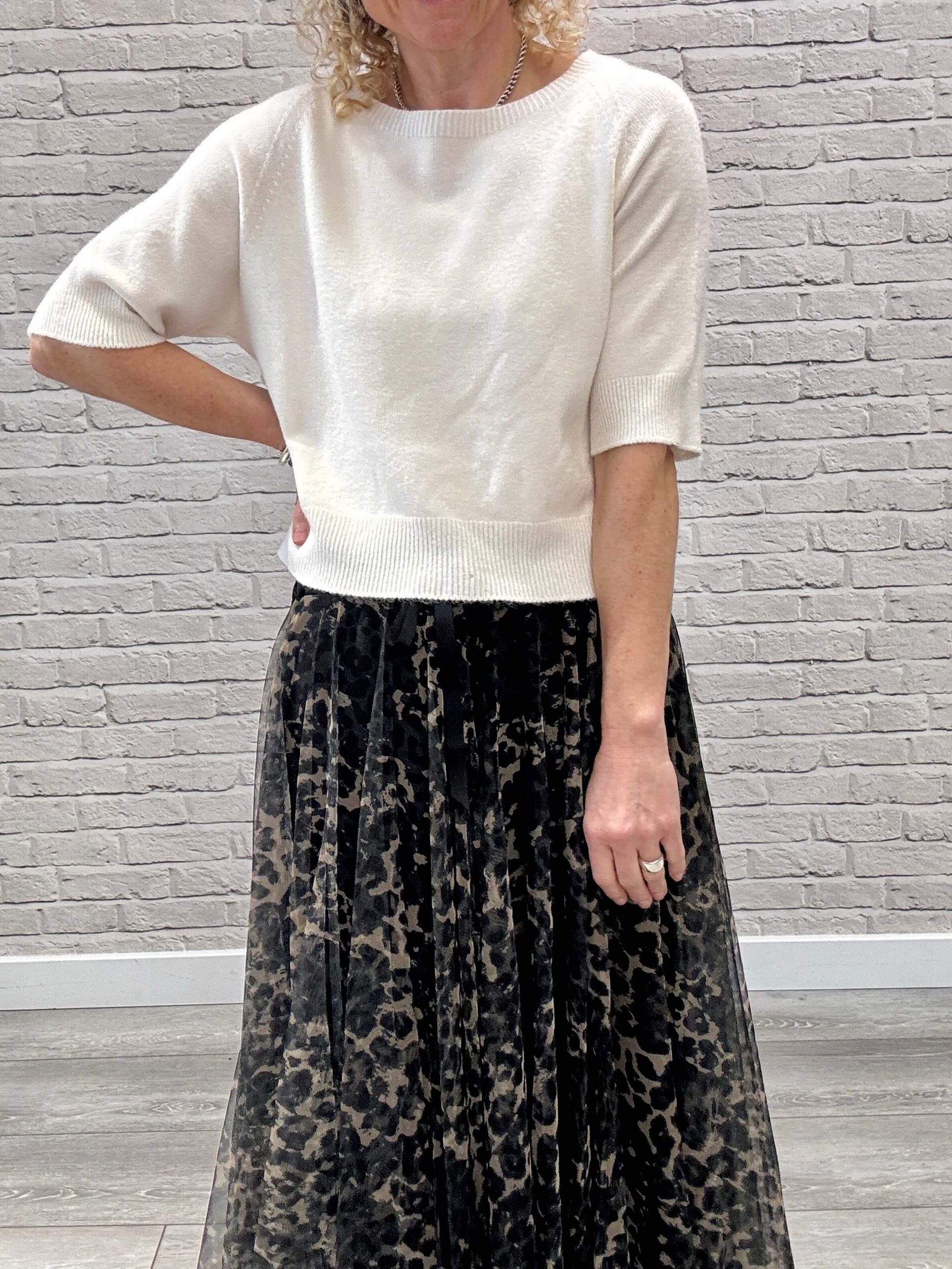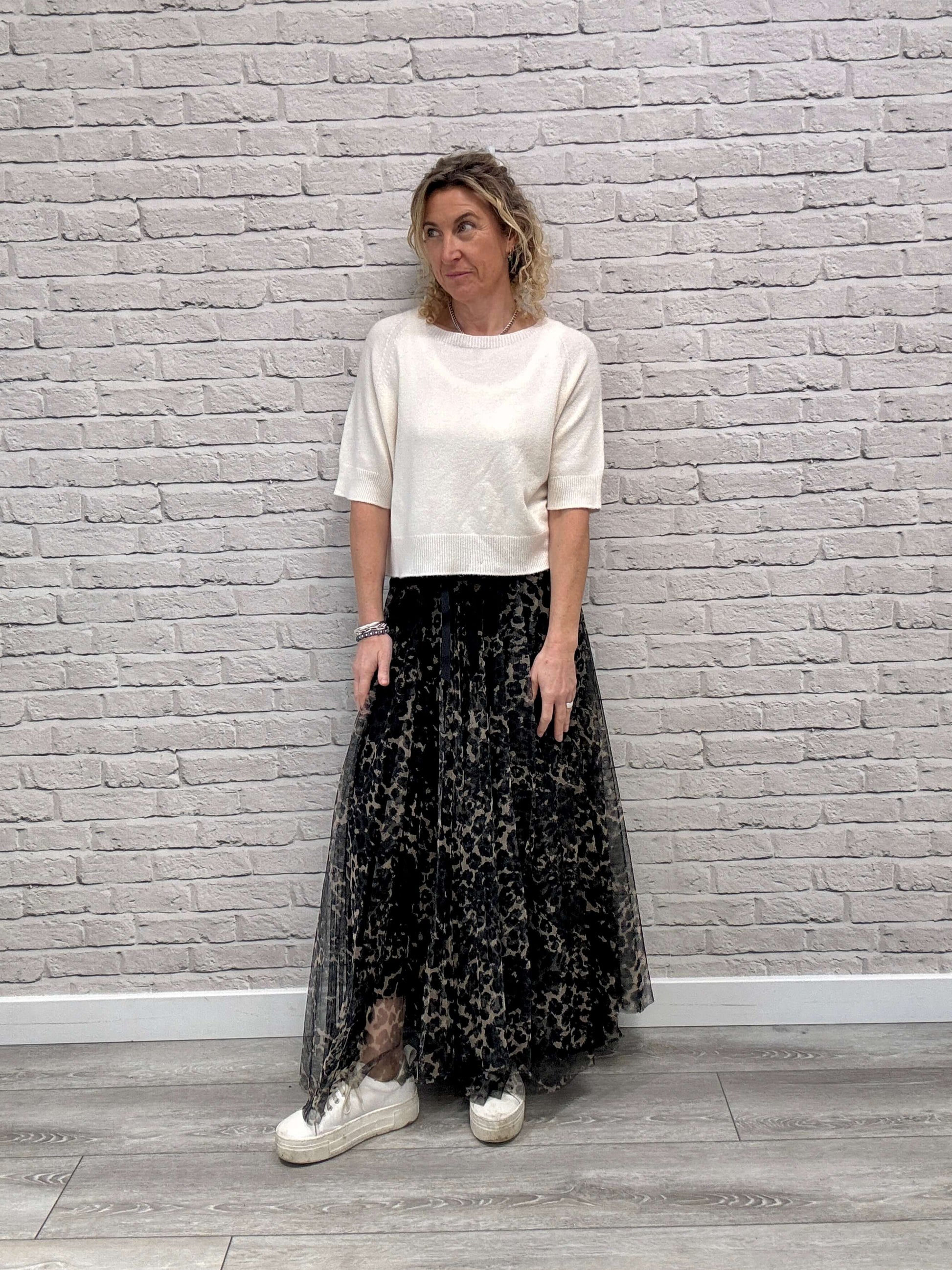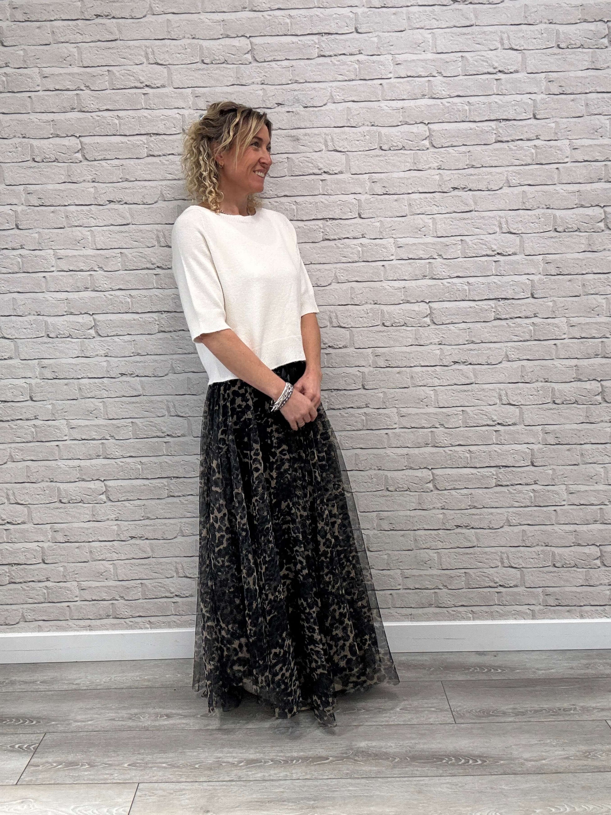A stunning floaty tulle skirt with satin waistband and front tie. An absolute winner at this year's fairs. Works perfectly paired with our Melrose or Hamptons Cardigan or a fitted Charlotte Knit.