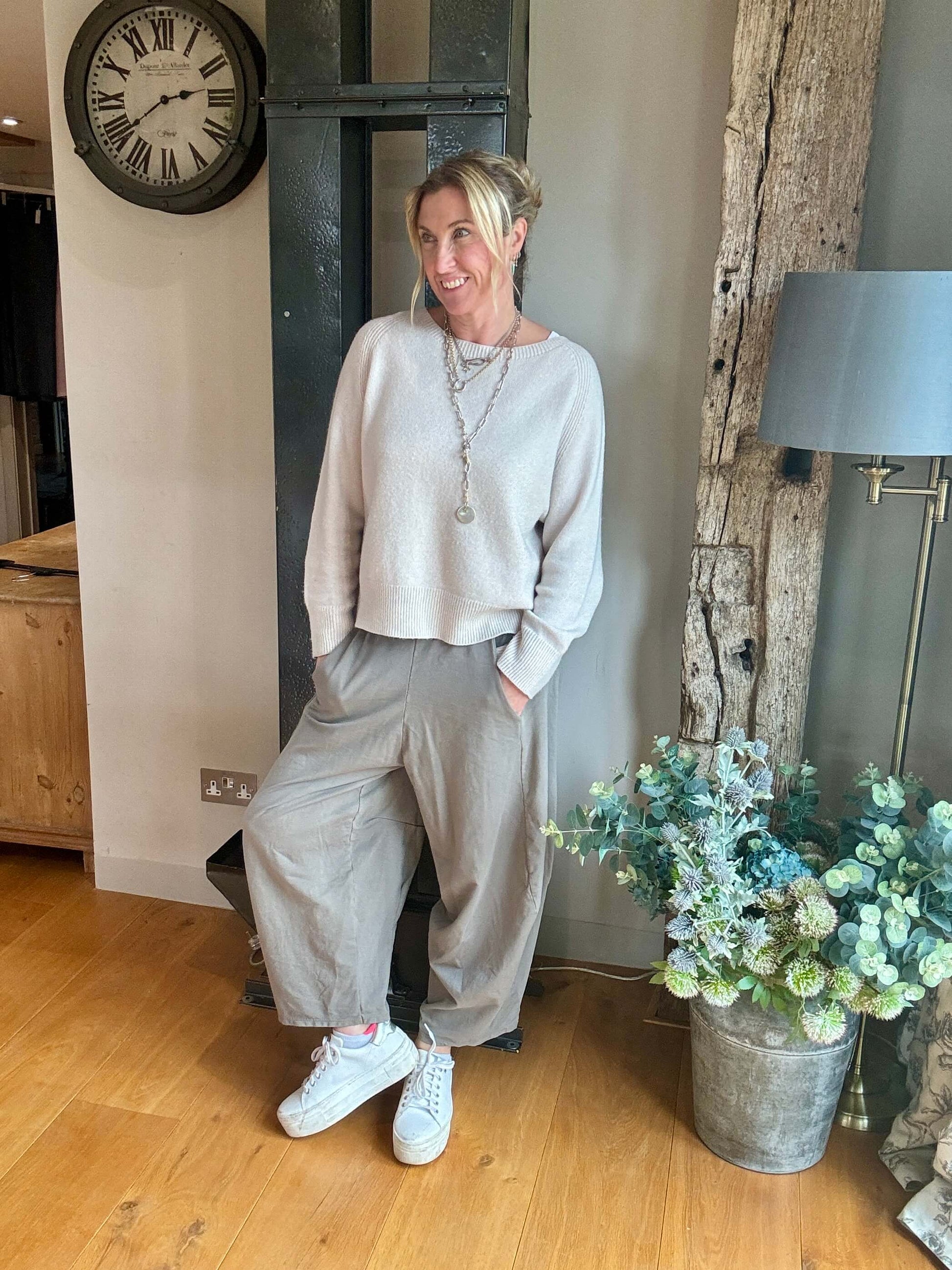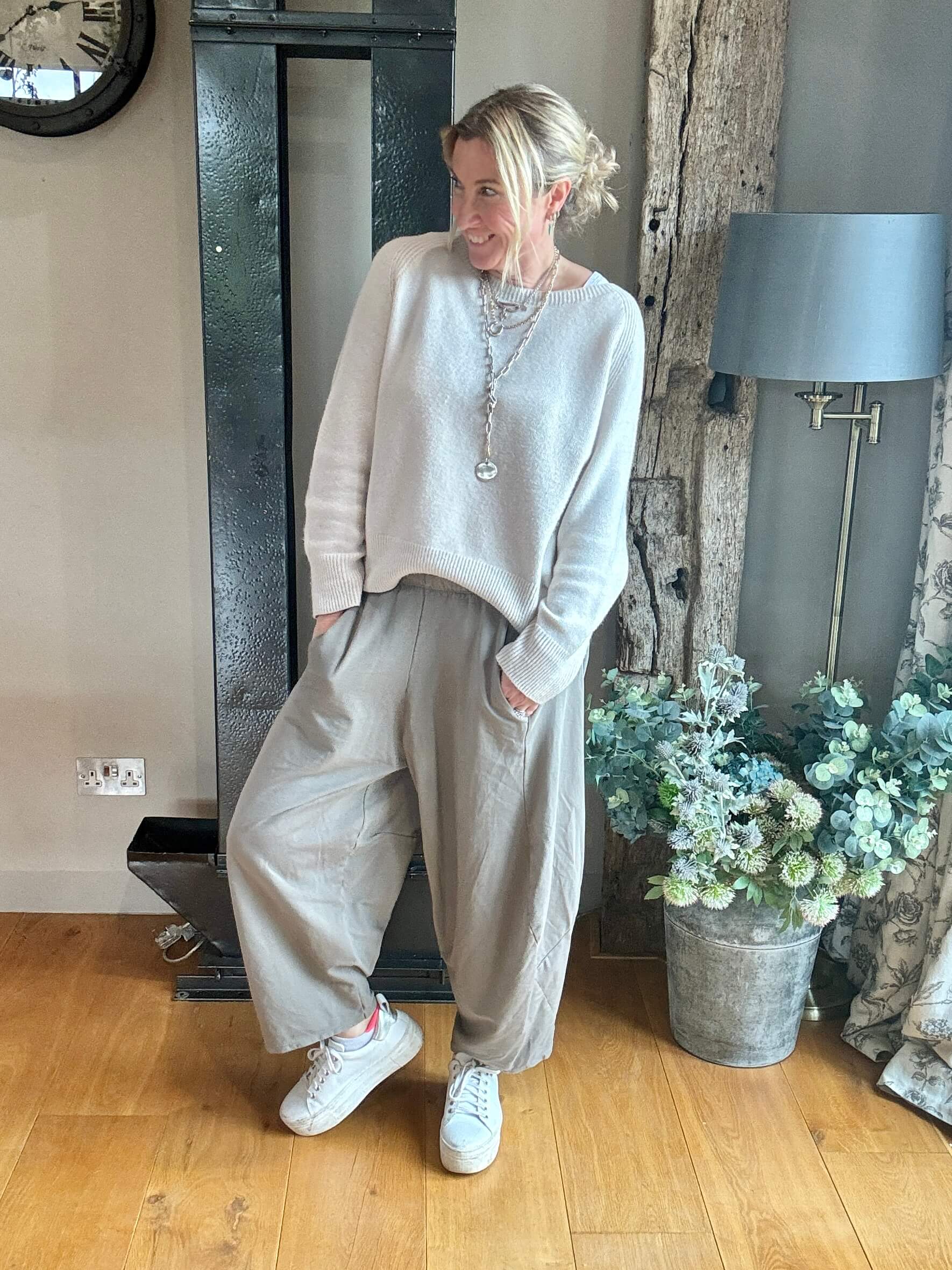 Wide throughout the legs. Tapered at the ankles. Stretchy waistband. Pockets. Perfect for those of you who love a relaxed, slouchy silhouette.
