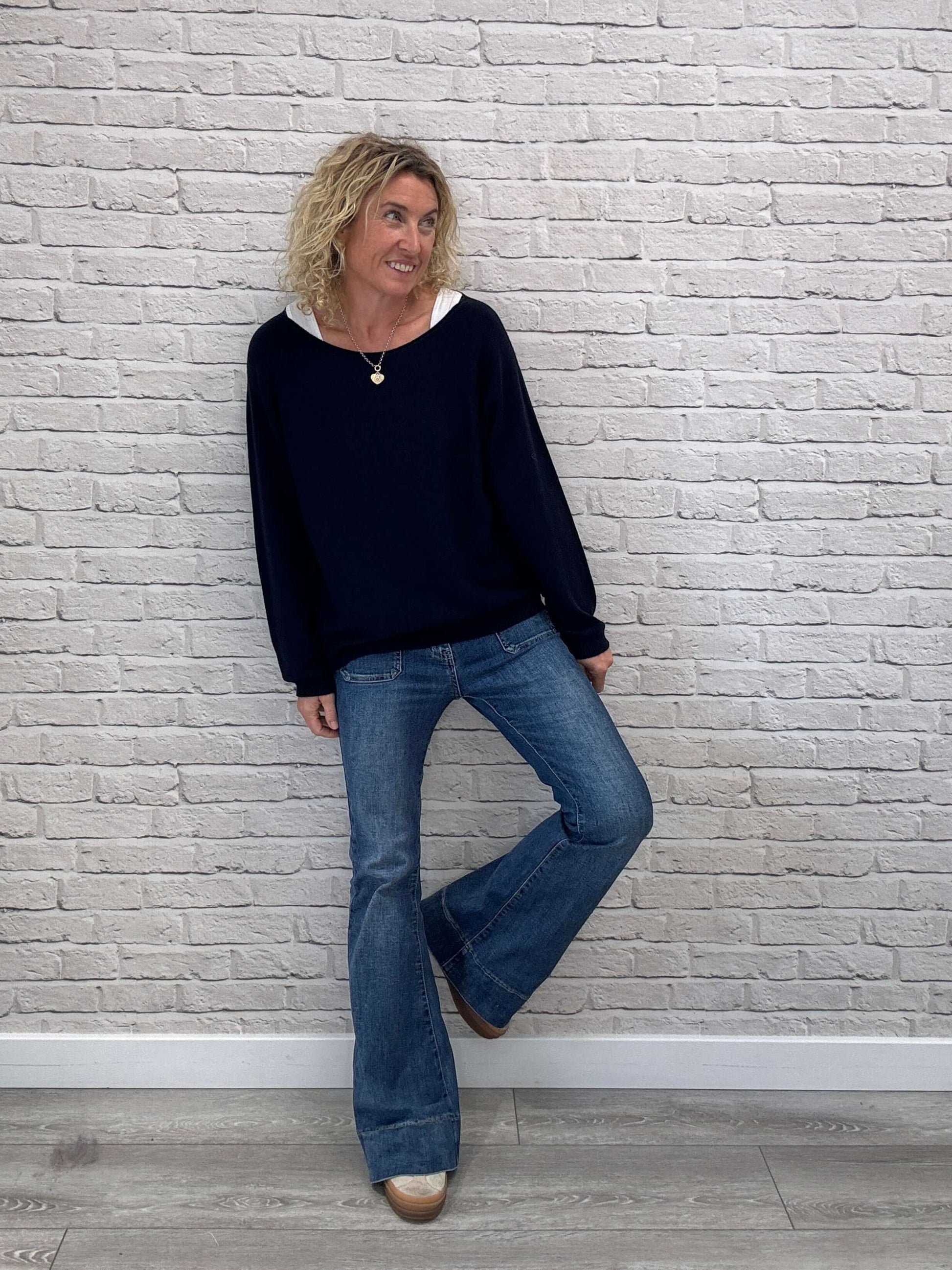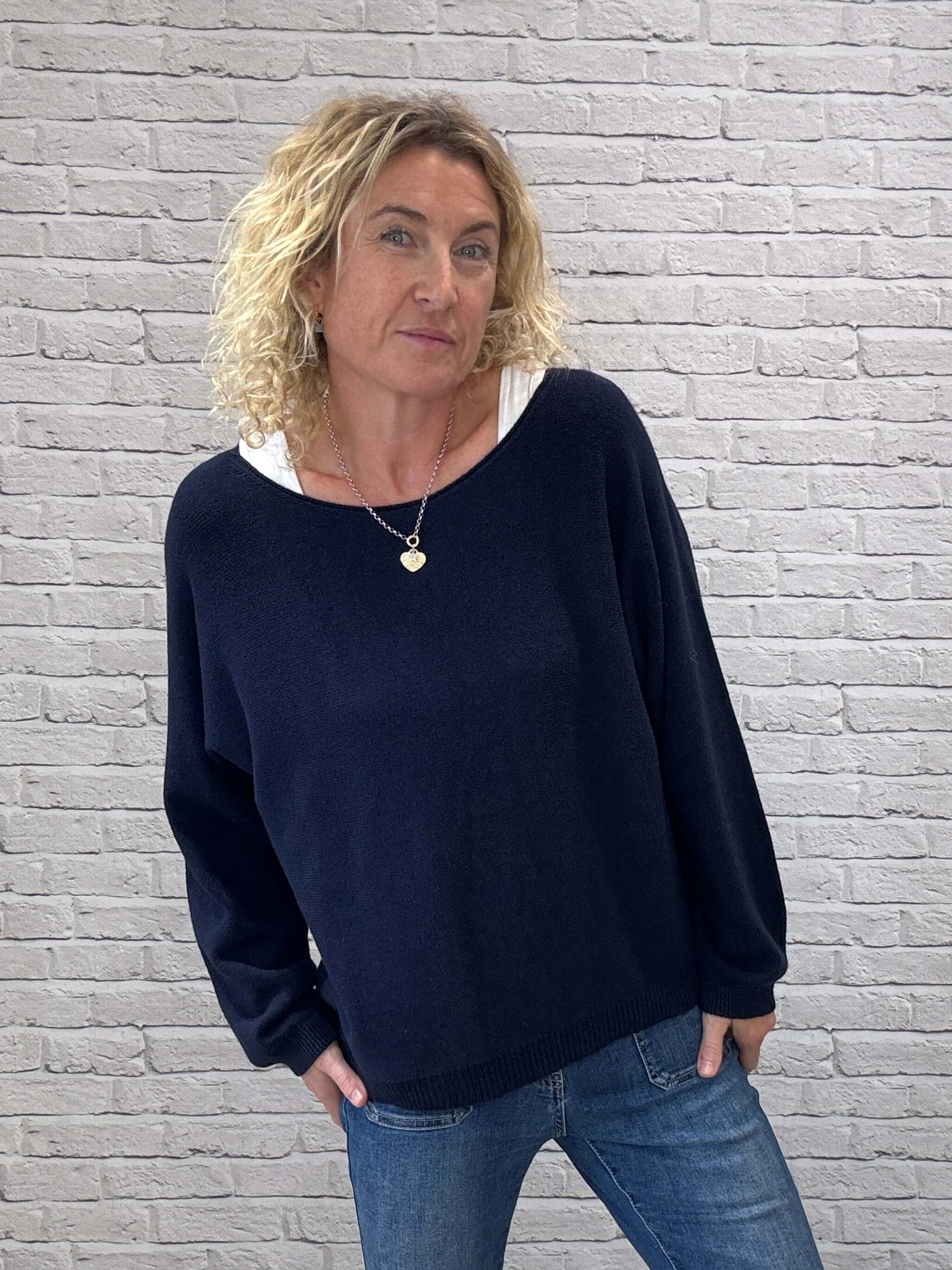 A soft-touch knit with a relaxed fit and flattering curved hemline. Perfect for layering or wearing solo. Effortless style, lightweight but cozy. An everyday staple.