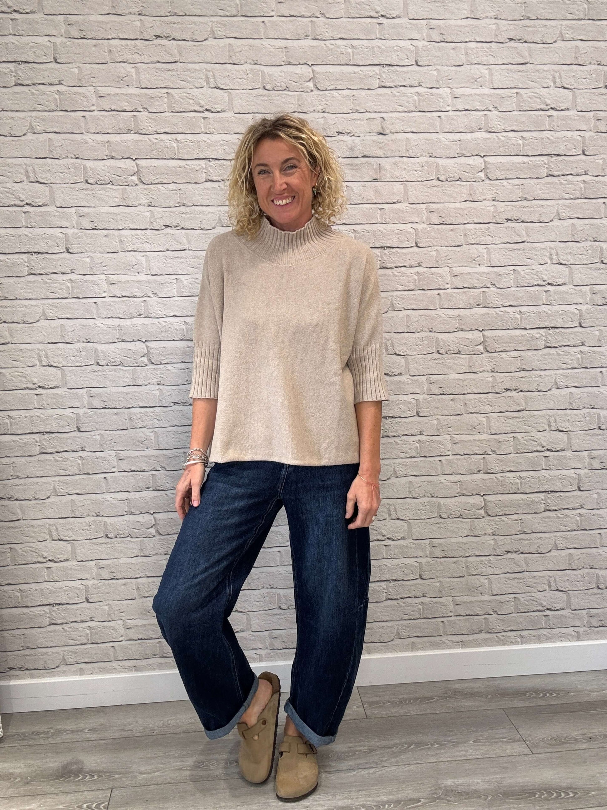 A beautifully soft funnel-neck jumper with elbow-length sleeves. Layer it over our long-sleeve Body Hug on cooler days, or wear it solo when the weather warms up. Effortlessly versatile, it pairs perfectly with skirts, joggers, or denim.