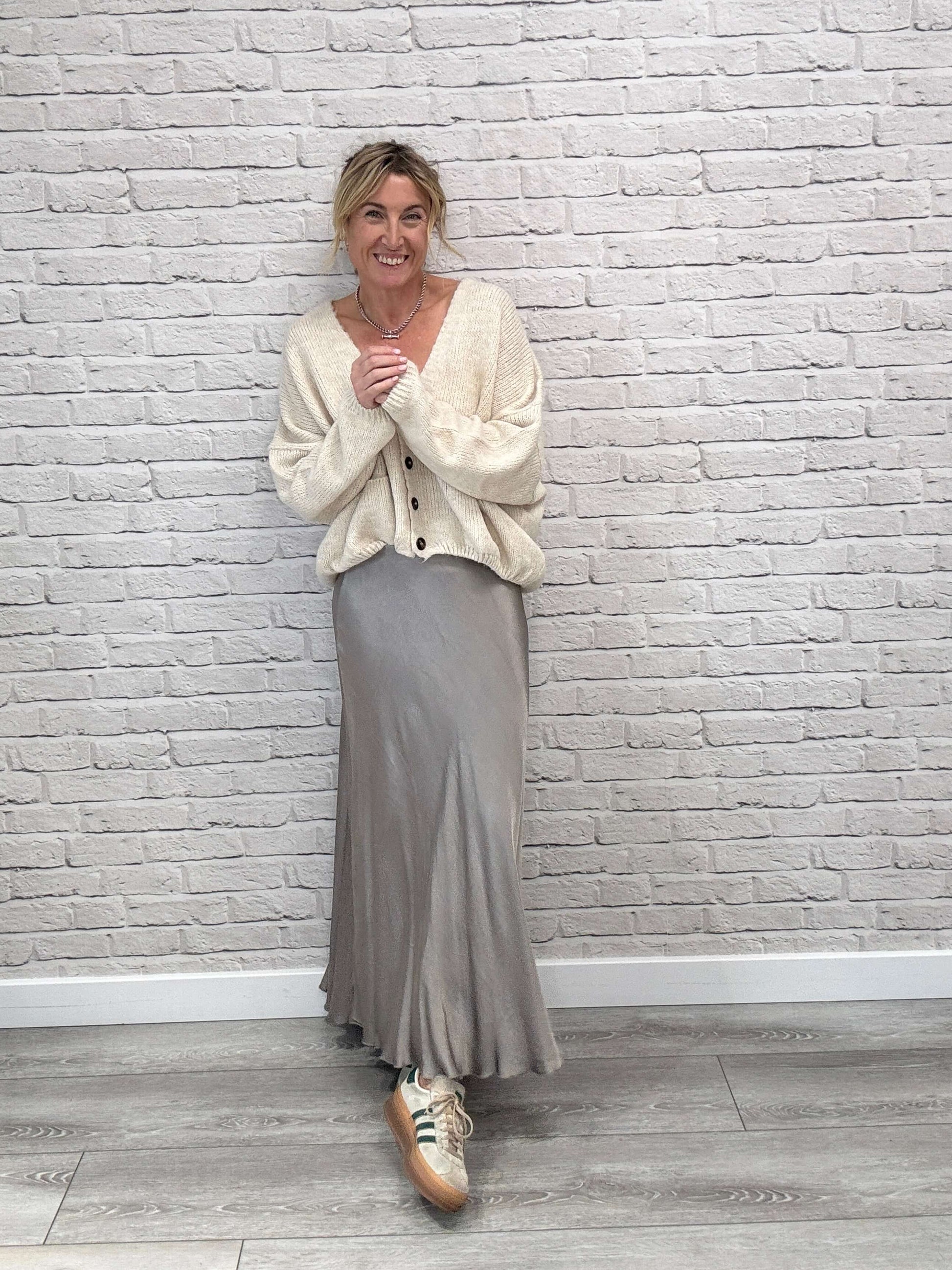 Satin slip skirt in a high rise silhouette featuring an elasticated waistband and bias cut midi-maxi hemline. The Orla can be dressed up or down depending on your mood. Style it with trainers and knitwear for everyday Autumn vibes or pair with our co-ordinating satin tops for an effortless all-in-one look.