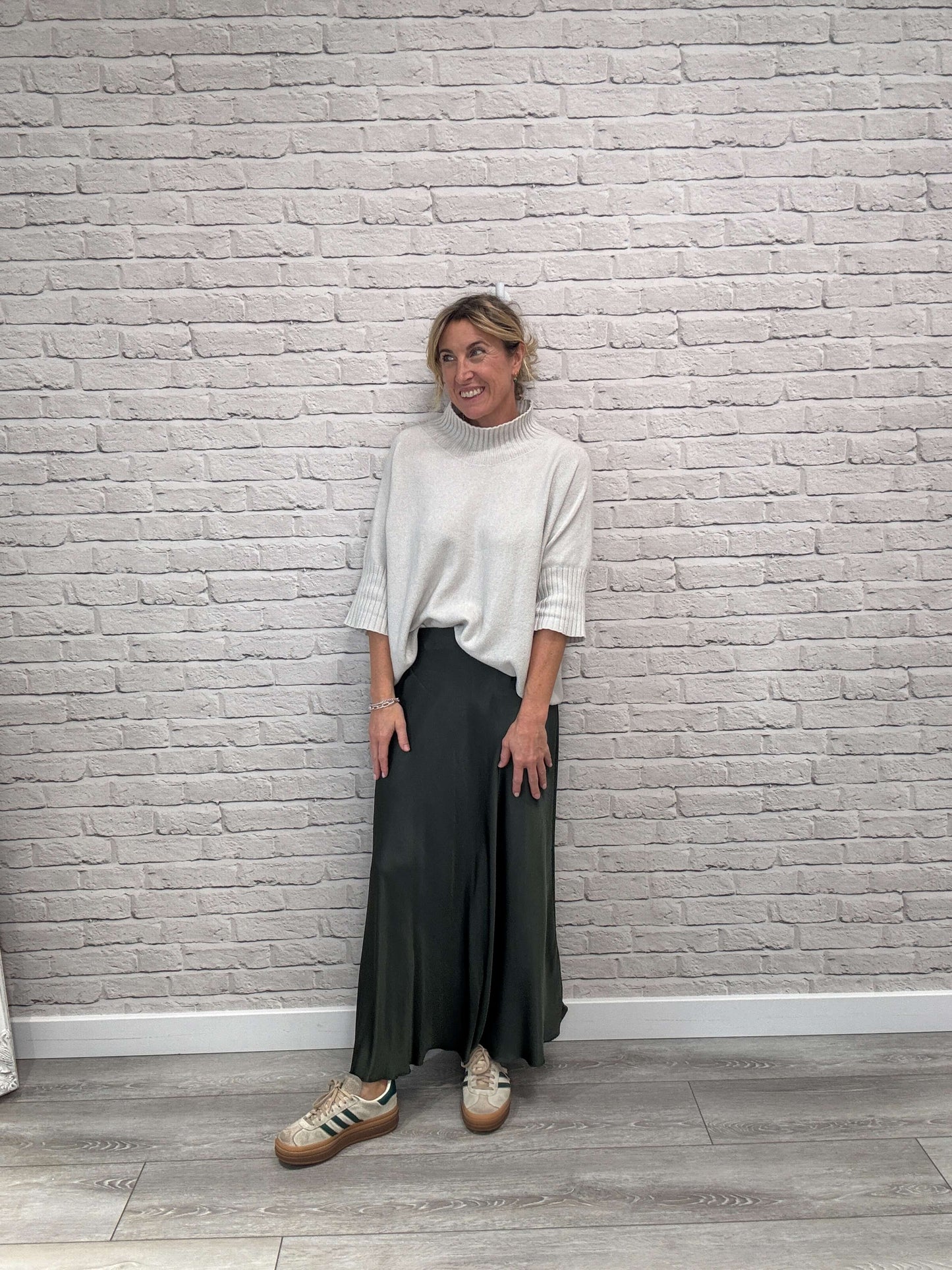 Satin slip skirt in a high rise silhouette featuring an elasticated waistband and bias cut midi-maxi hemline. The Orla can be dressed up or down depending on your mood. Style it with trainers and knitwear for everyday Autumn vibes or pair with our co-ordinating satin tops for an effortless all-in-one look.