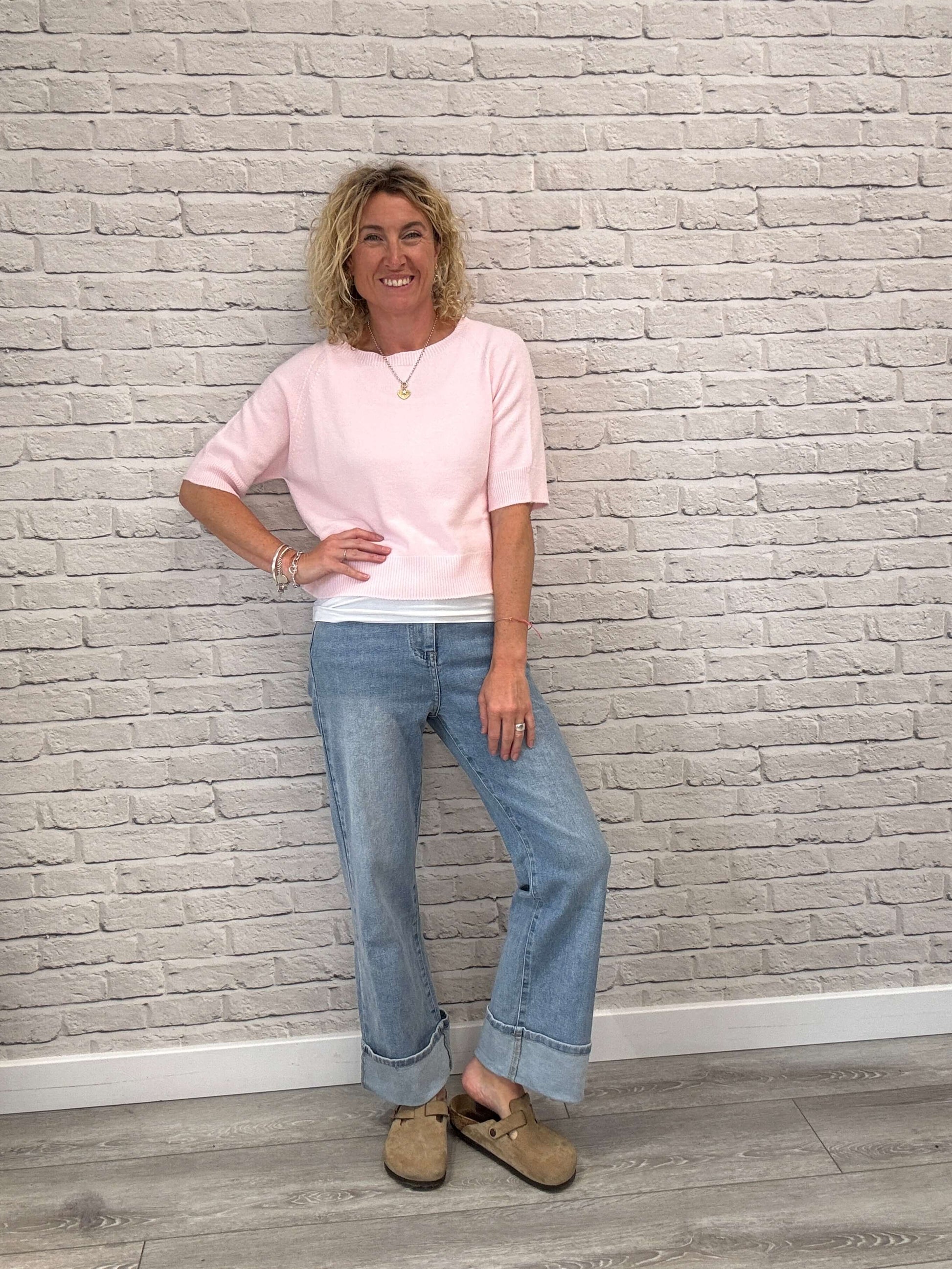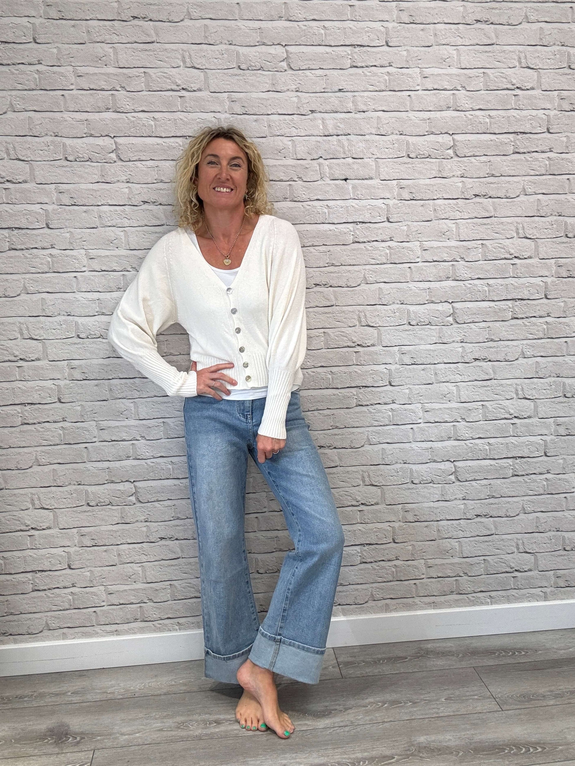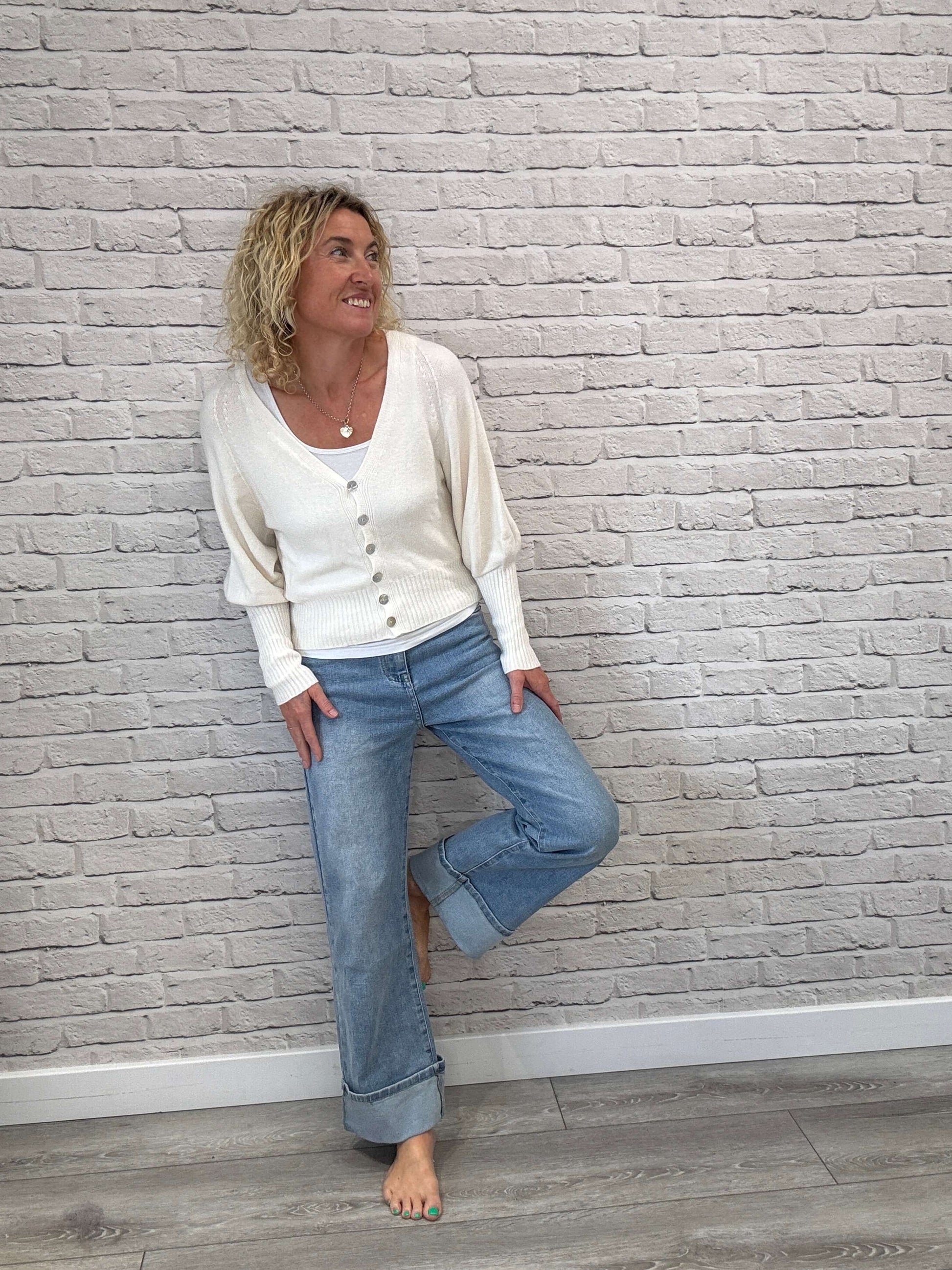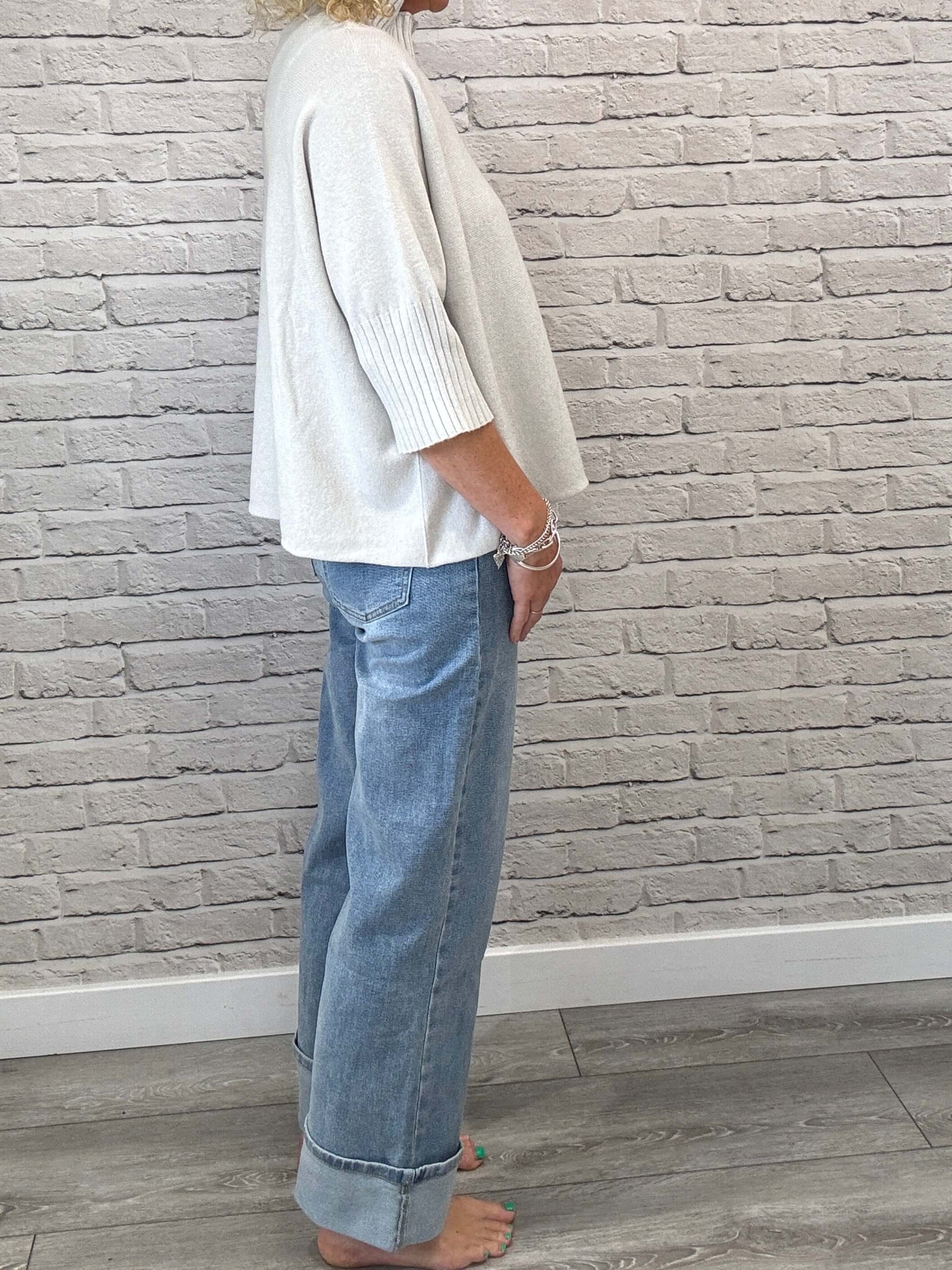 Relaxed fit, high-waist jean with a five-pocket design. Straight leg with wide cuffed hems. Slightly cropped ankle length finish. Front zip fly and button closure.