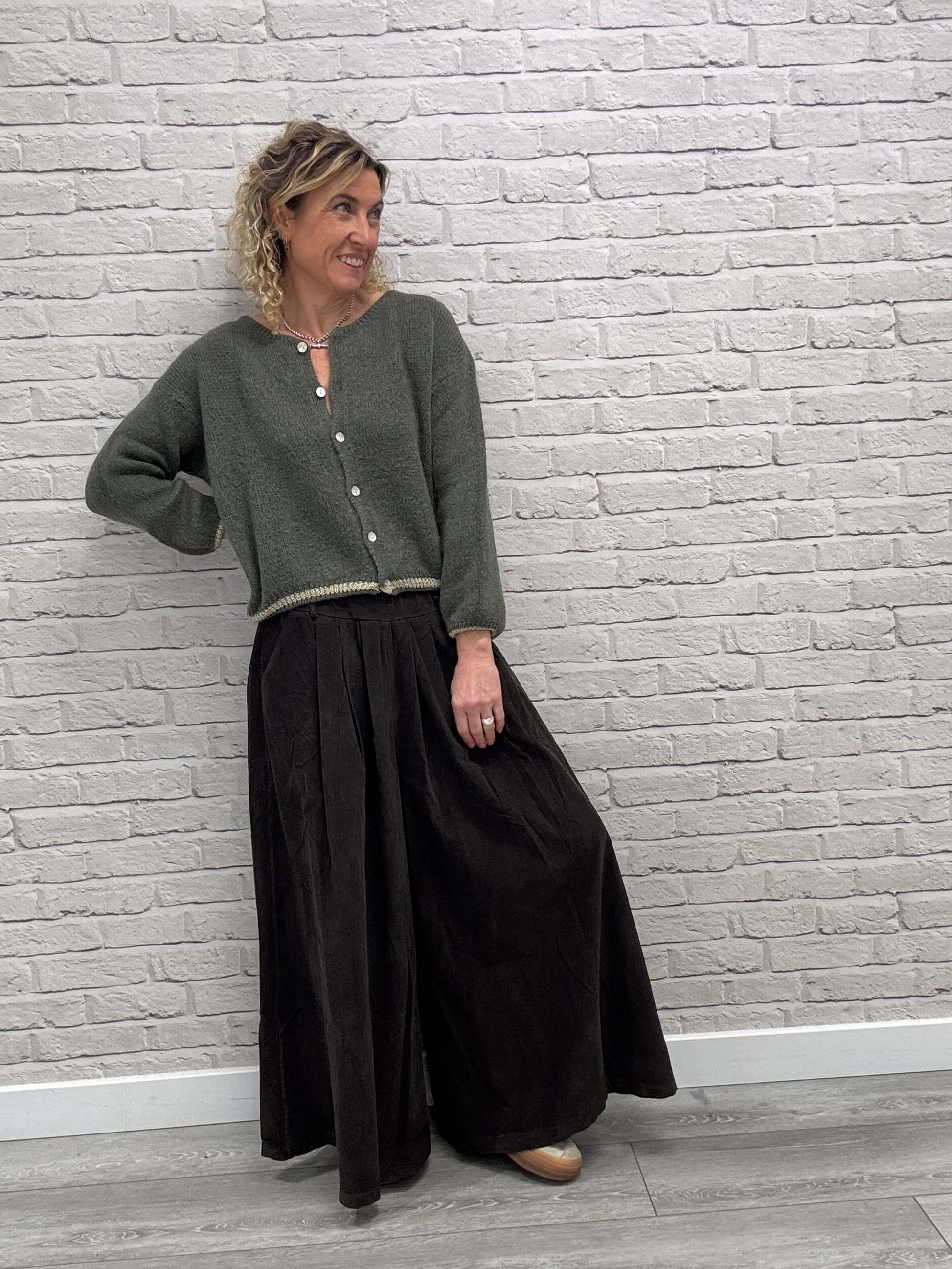 The most amazing, floaty-wide-leg palazzo trousers crafted from super-soft needle cord. Designed with a flattering flat front panel and a comfy elasticated waistband. Finished with side pockets — effortless style meets everyday comfort.