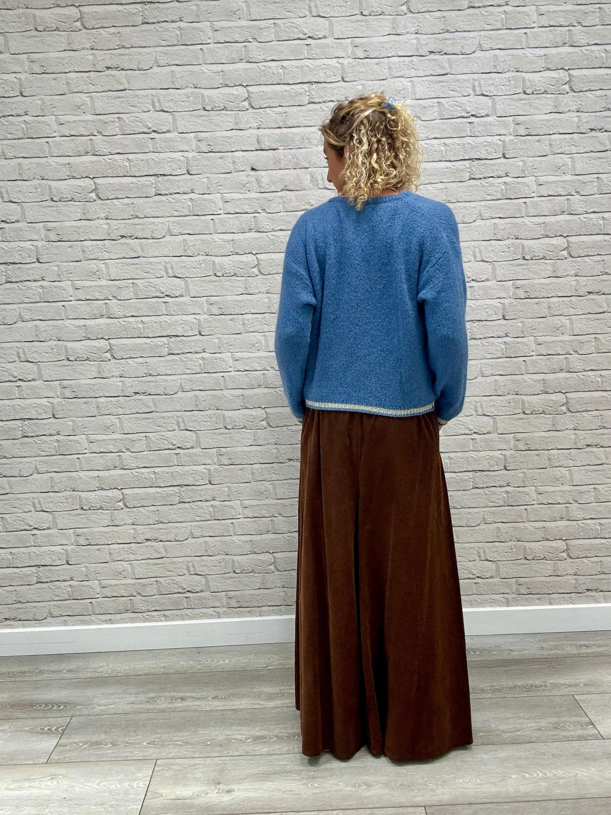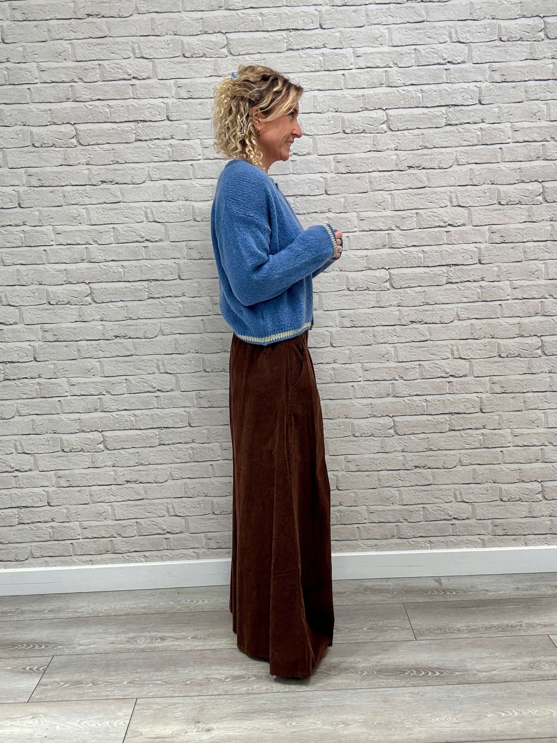 The most amazing, floaty-wide-leg palazzo trousers crafted from super-soft needle cord. Designed with a flattering flat front panel and a comfy elasticated waistband. Finished with side pockets — effortless style meets everyday comfort.