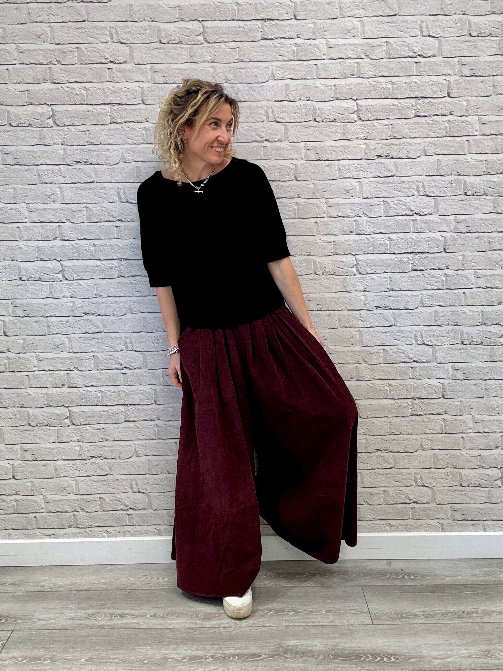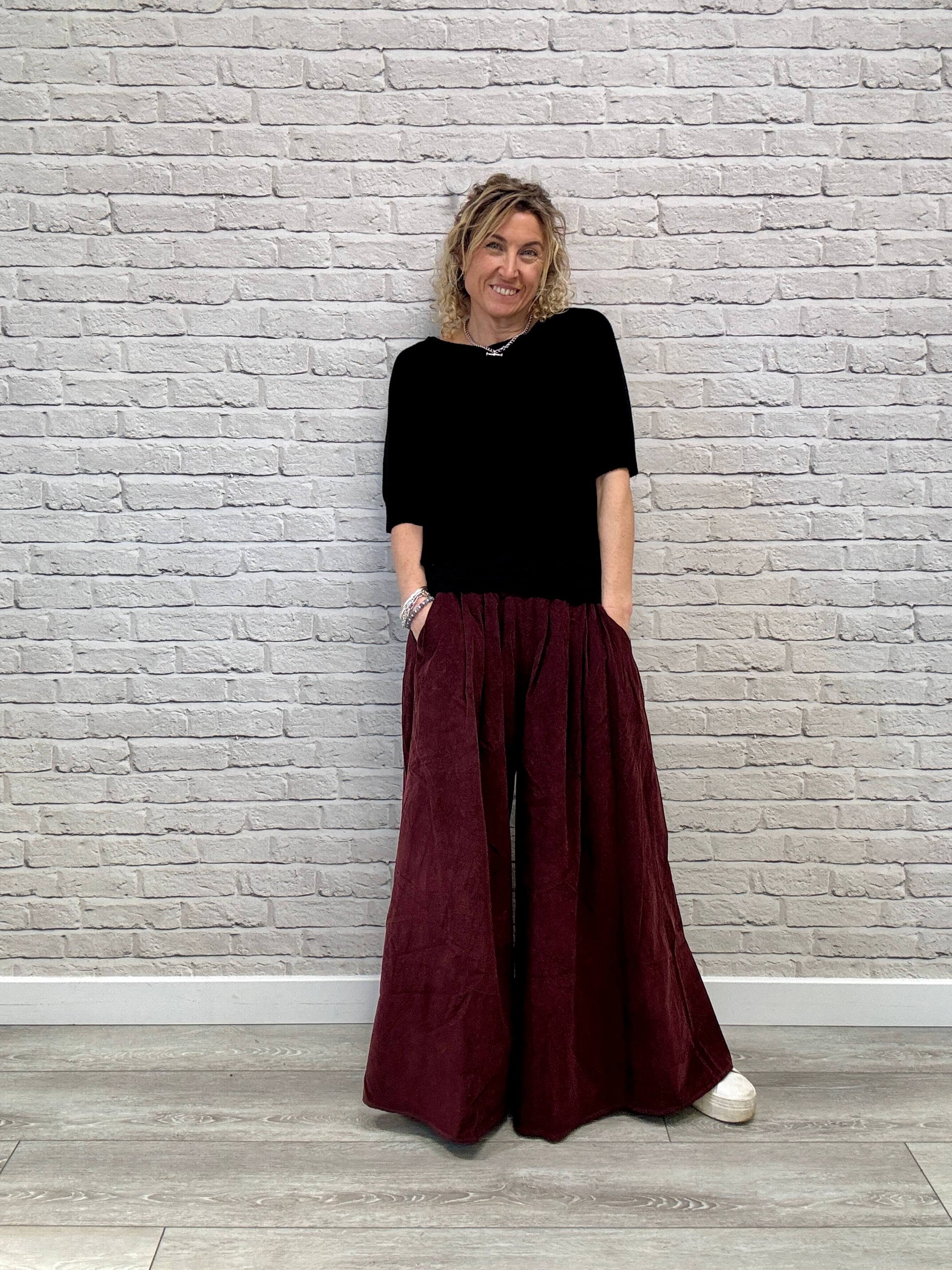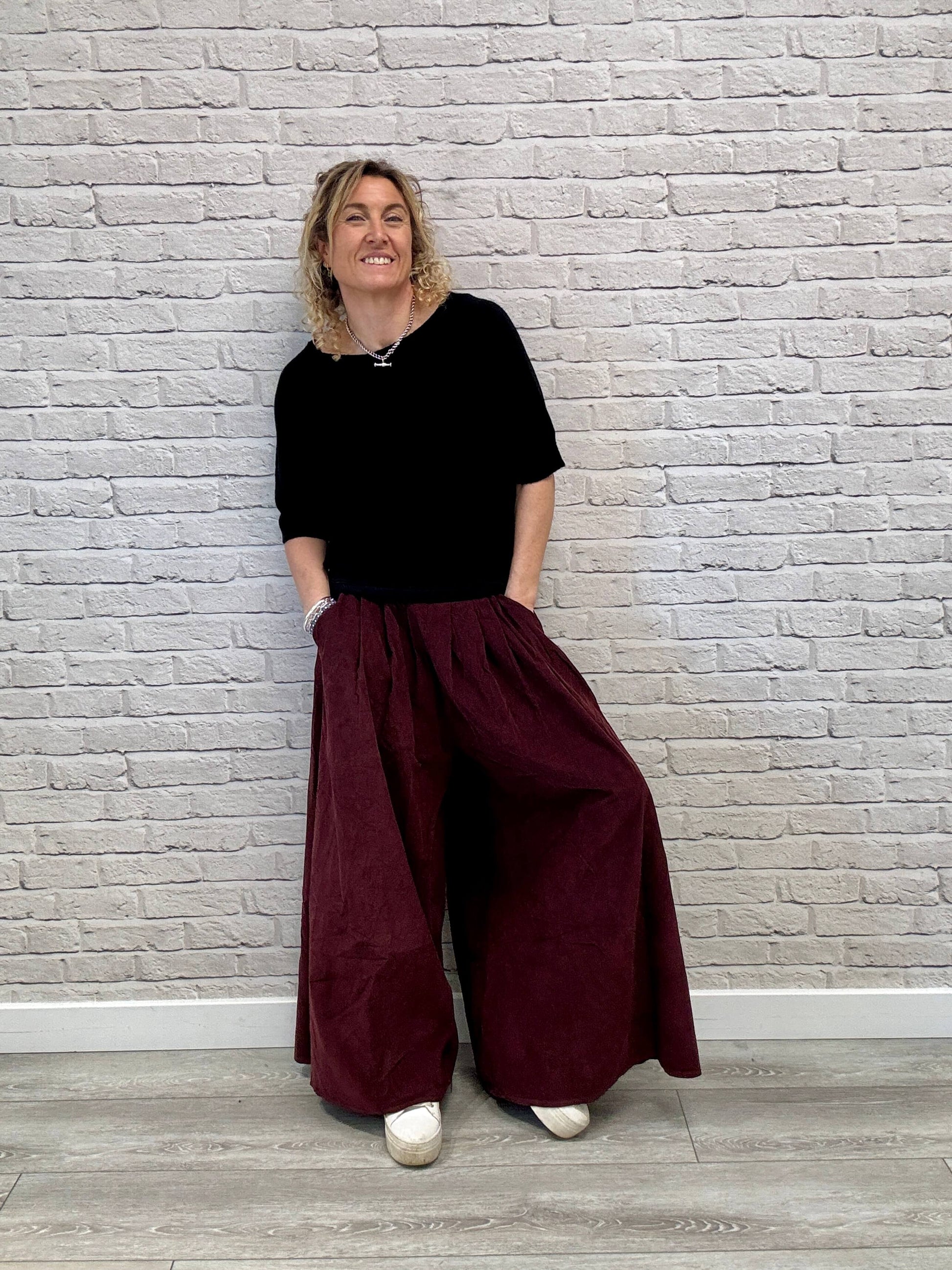 The most amazing, floaty-wide-leg palazzo trousers crafted from super-soft needle cord. Designed with a flattering flat front panel and a comfy elasticated waistband. Finished with side pockets — effortless style meets everyday comfort.