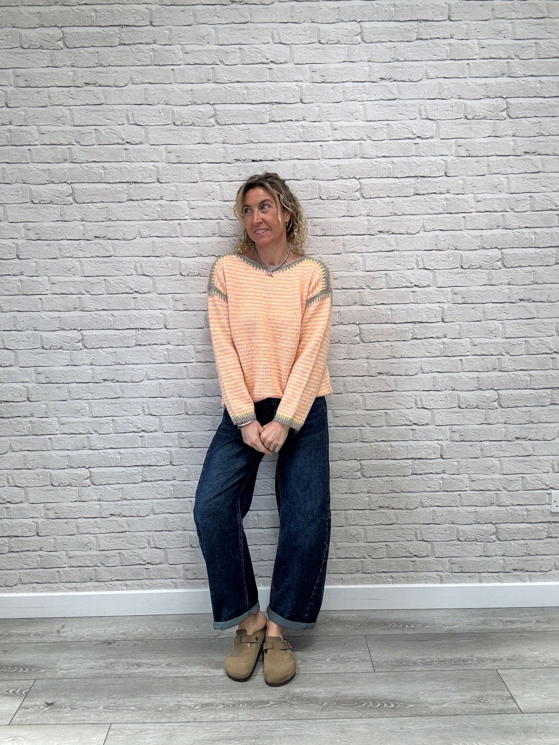 A wonderfully soft, snuggly jumper featuring pink and yellow stripes with chunky taupe stitch detailing.