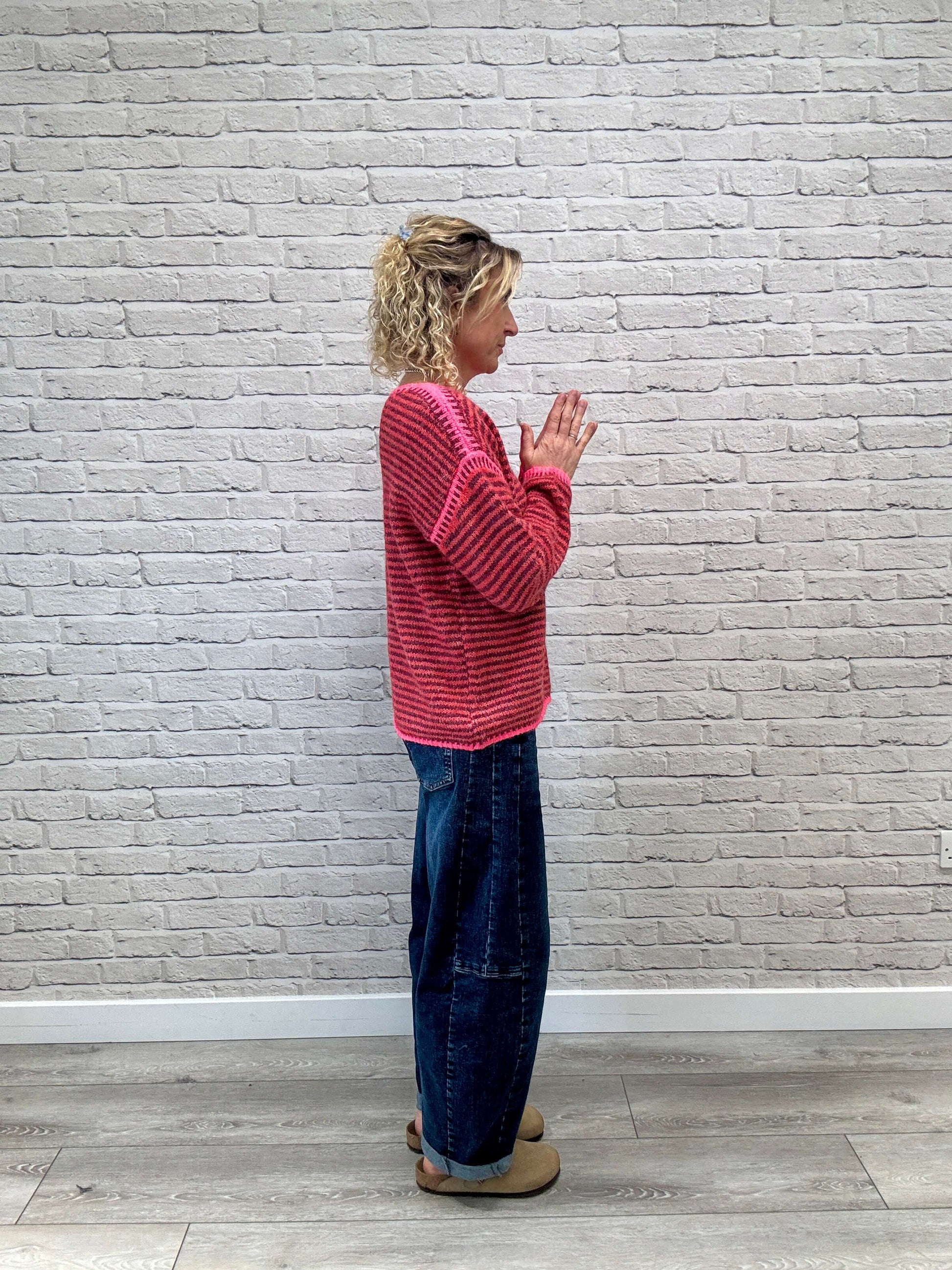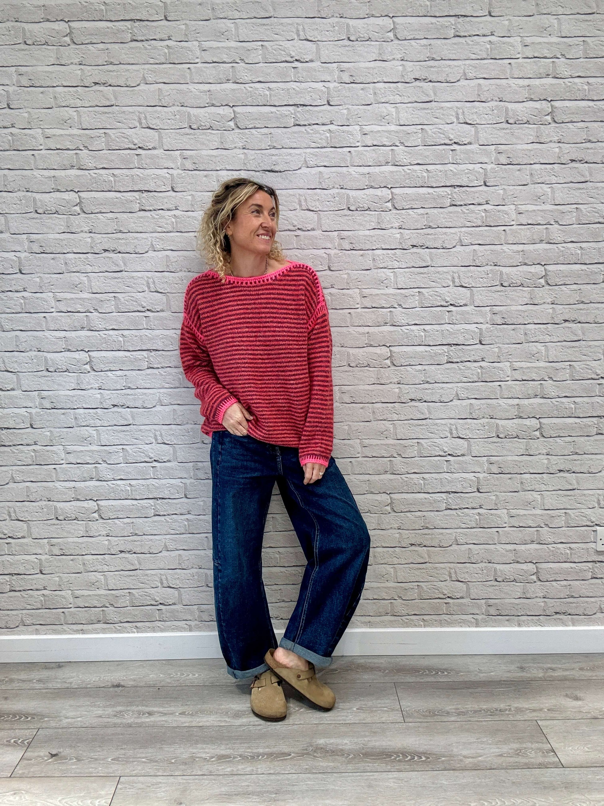 A wonderfully soft, snuggly jumper featuring pink and yellow stripes with chunky taupe stitch detailing.