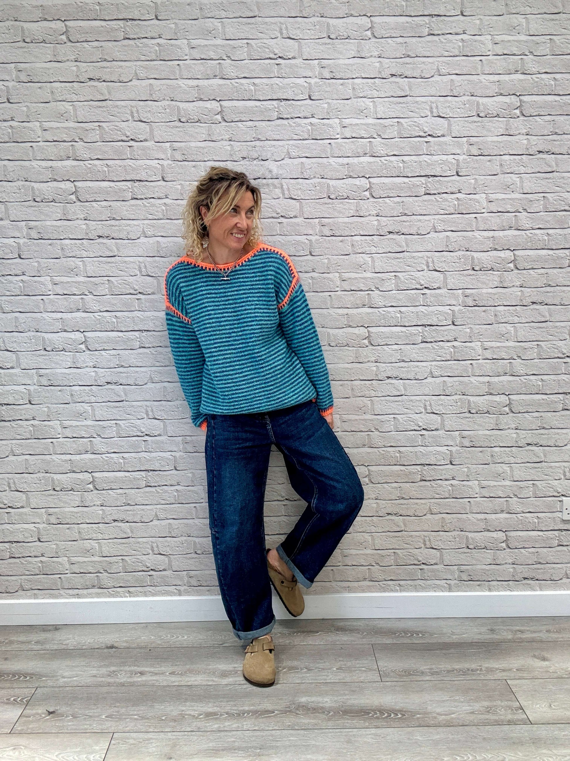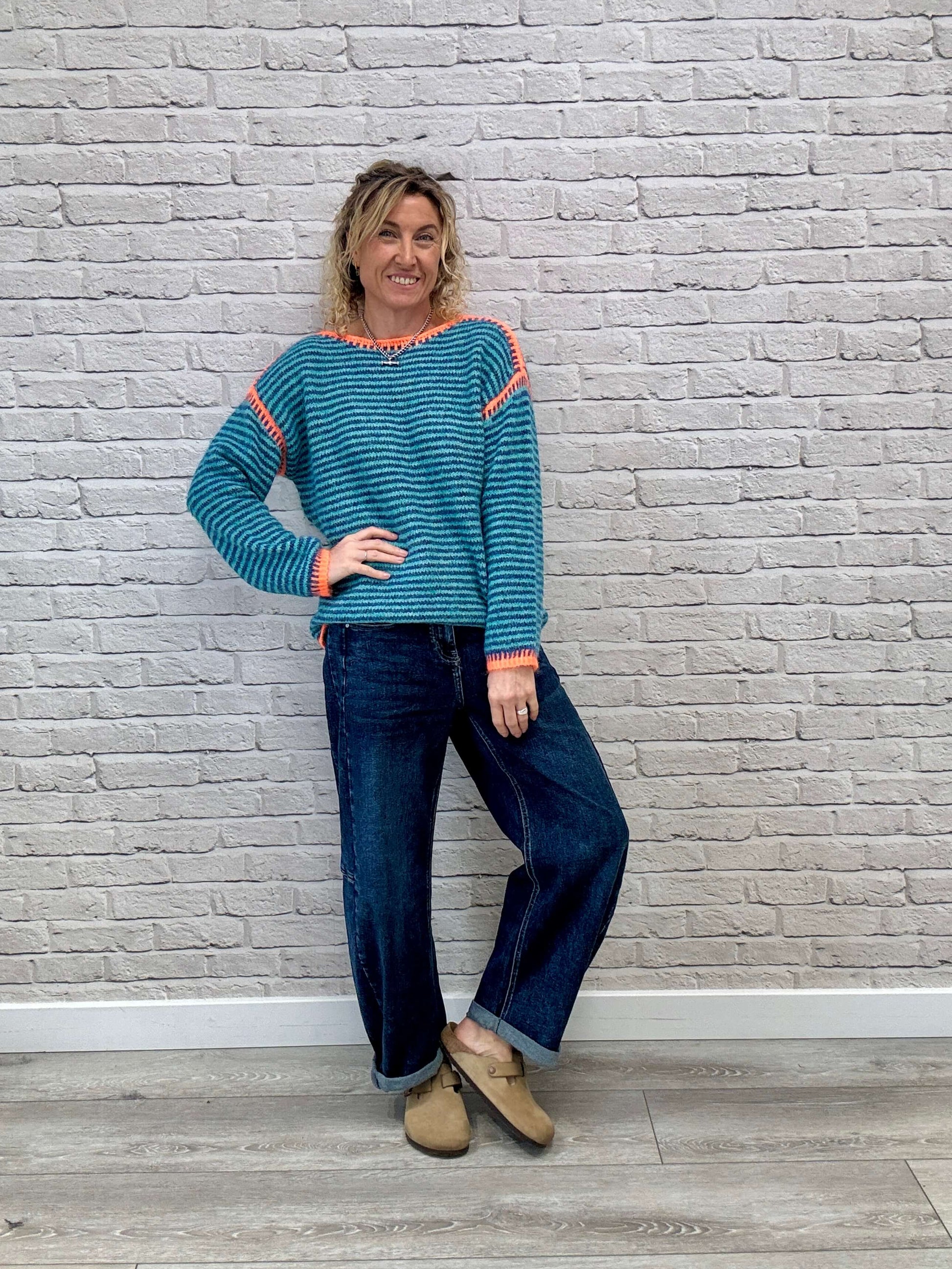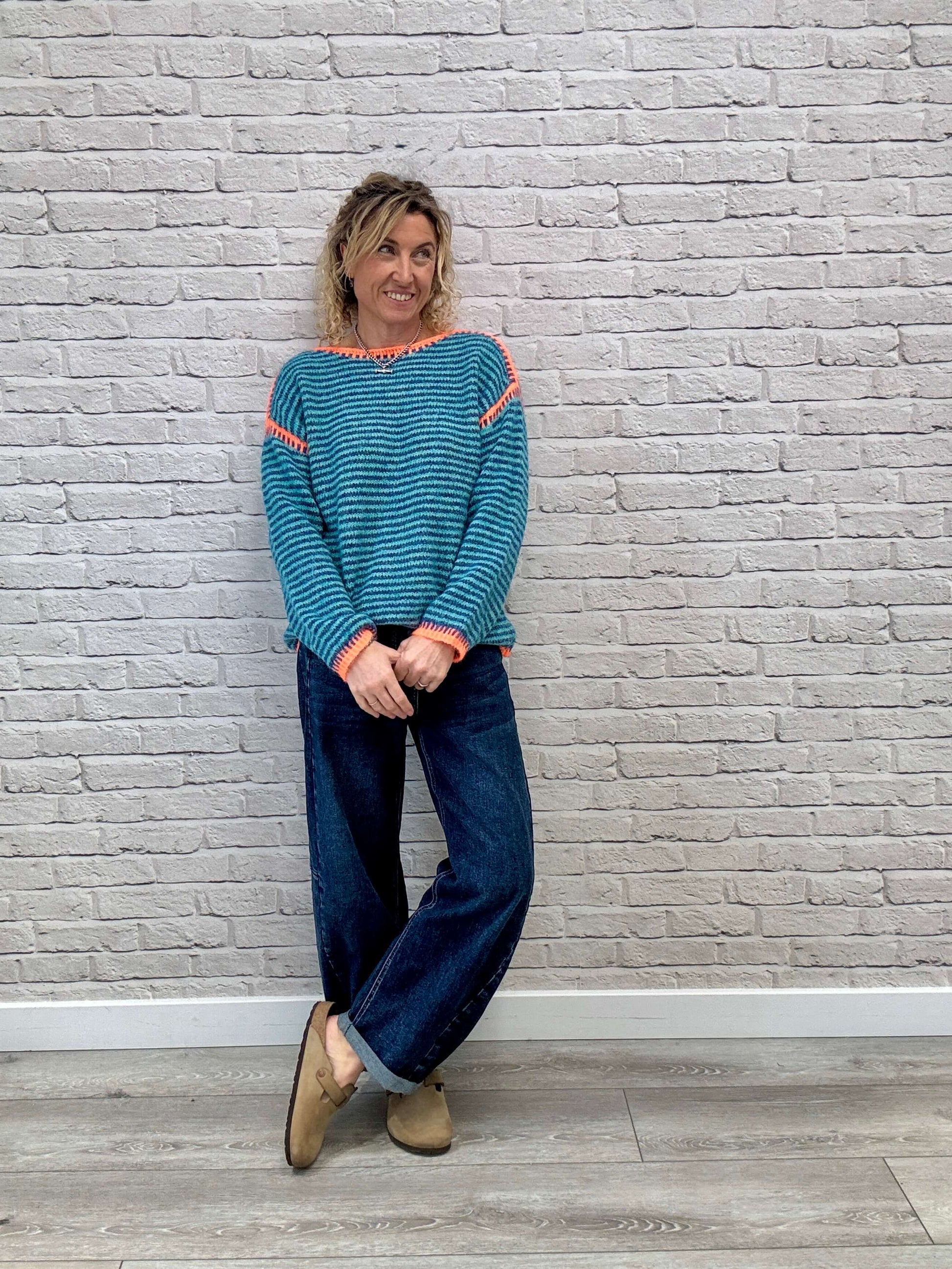 A wonderfully soft, snuggly jumper featuring teal and blue stripes with chunky orange stitch detailing.