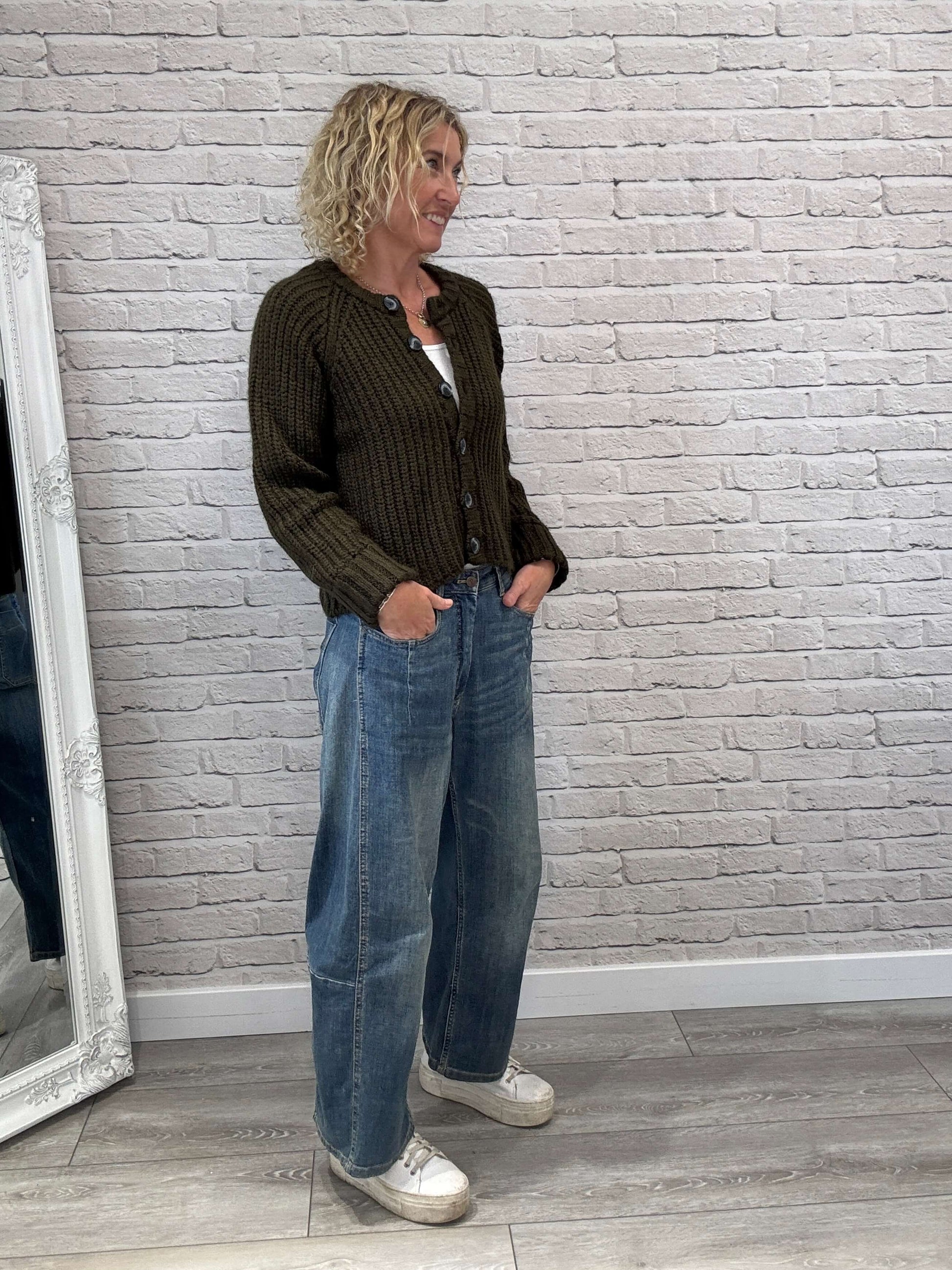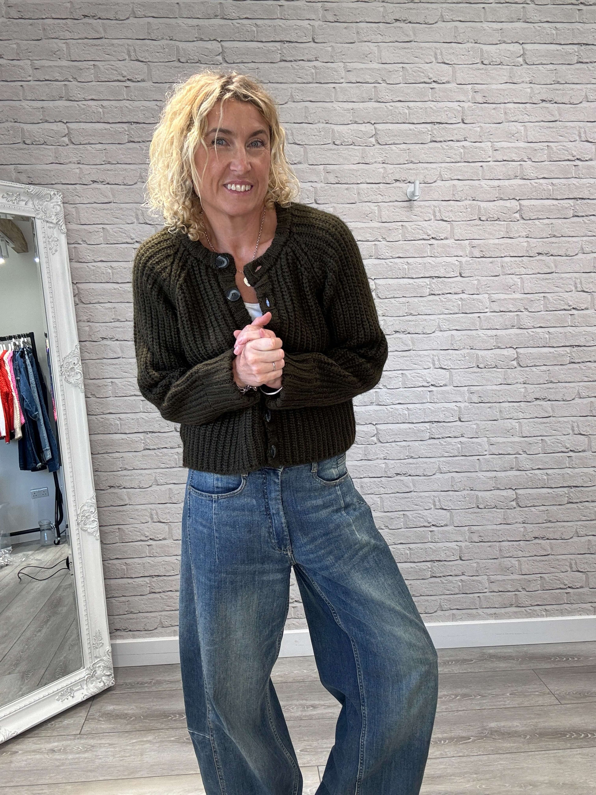 Chunky knit cardigan with contrasting stitch on the cuffs and placket. Made from a super soft yarn with a round neck and oversized tortoiseshell buttons.