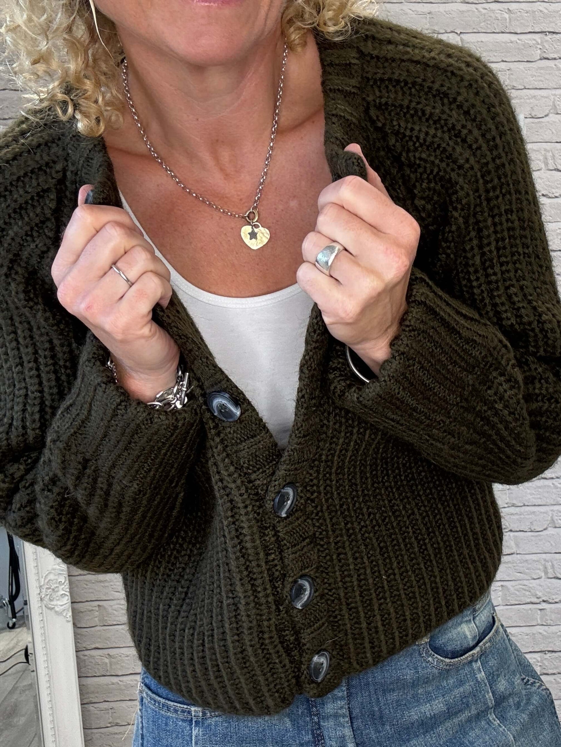 This cardigan is a beautiful dark olive green but looks brown in some lights.