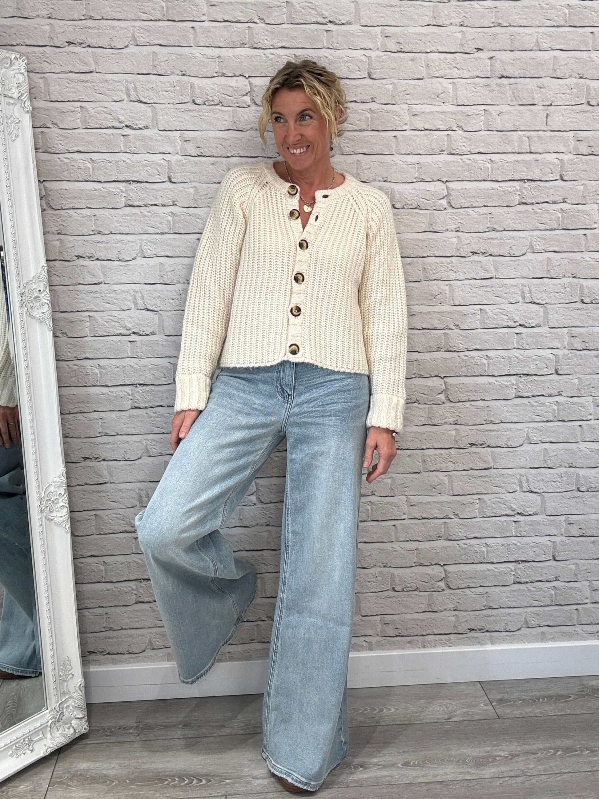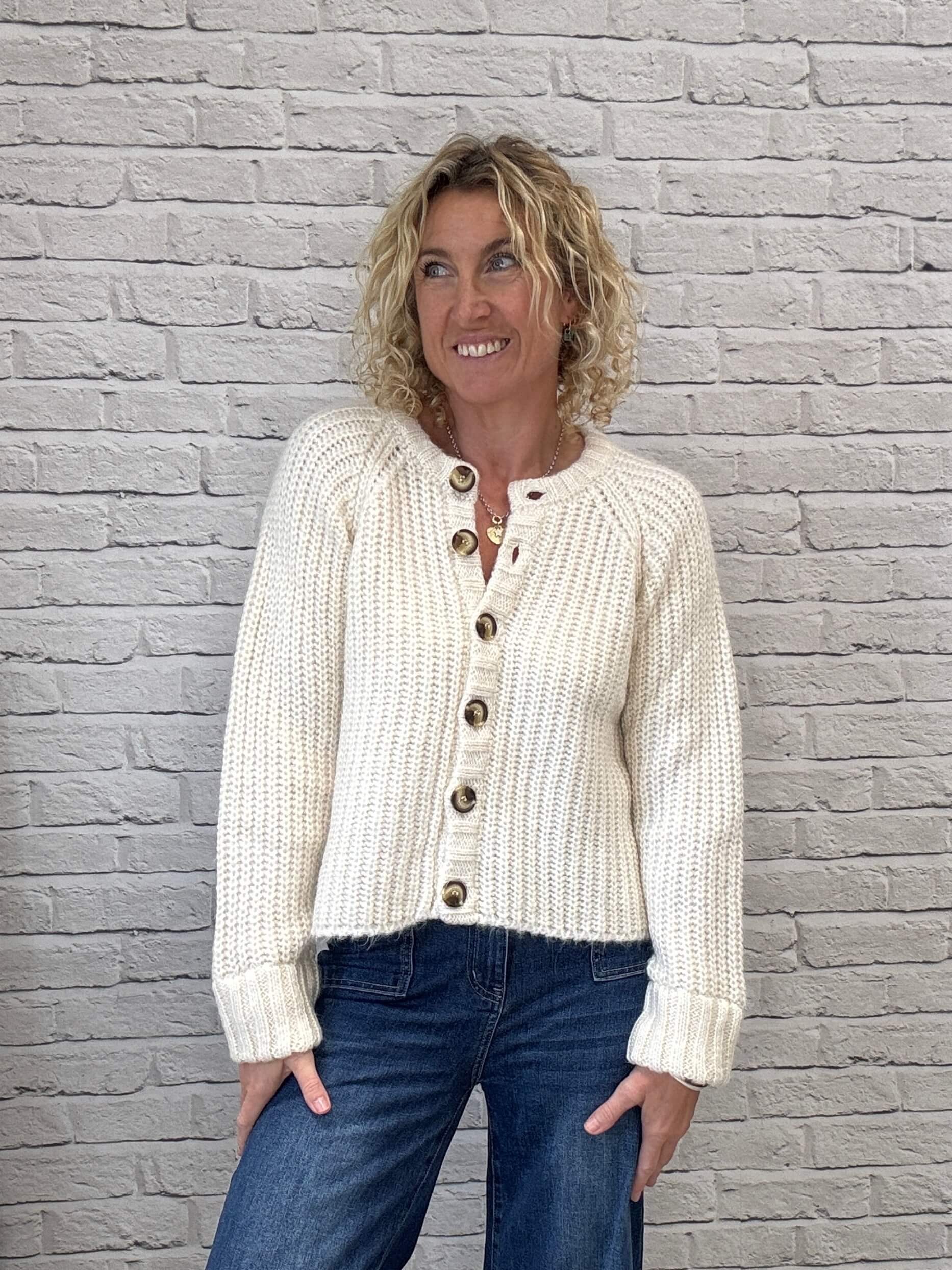 Chunky knit cardigan with contrasting stitch on the cuffs and placket. Made from a super soft yarn with a round neck and oversized tortoiseshell buttons.