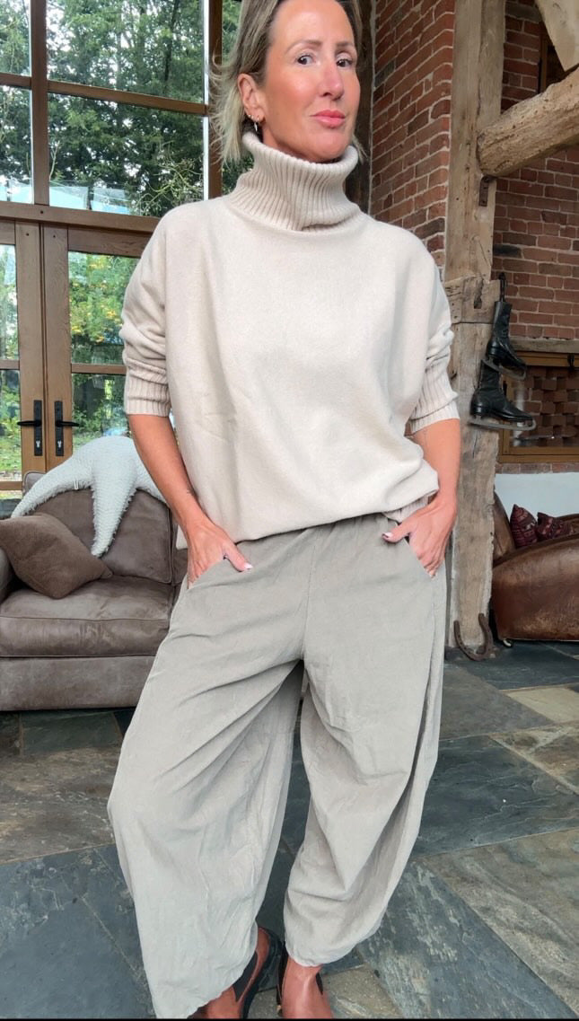 Stylishly simply pull on barrel leg trousers crafted from a super soft lightweight needle cord.