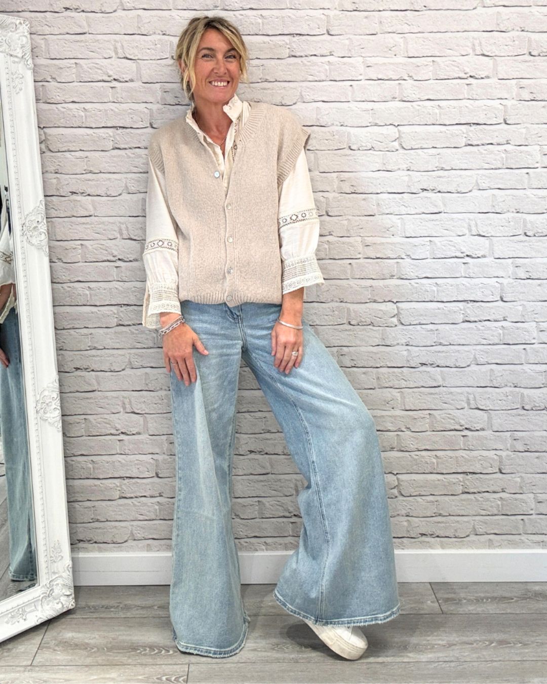 A timeless, sleeveless sweater with crew neck and button through fastening. Ribbed detailing on the trims. A staple for trans-seasonal dressing.