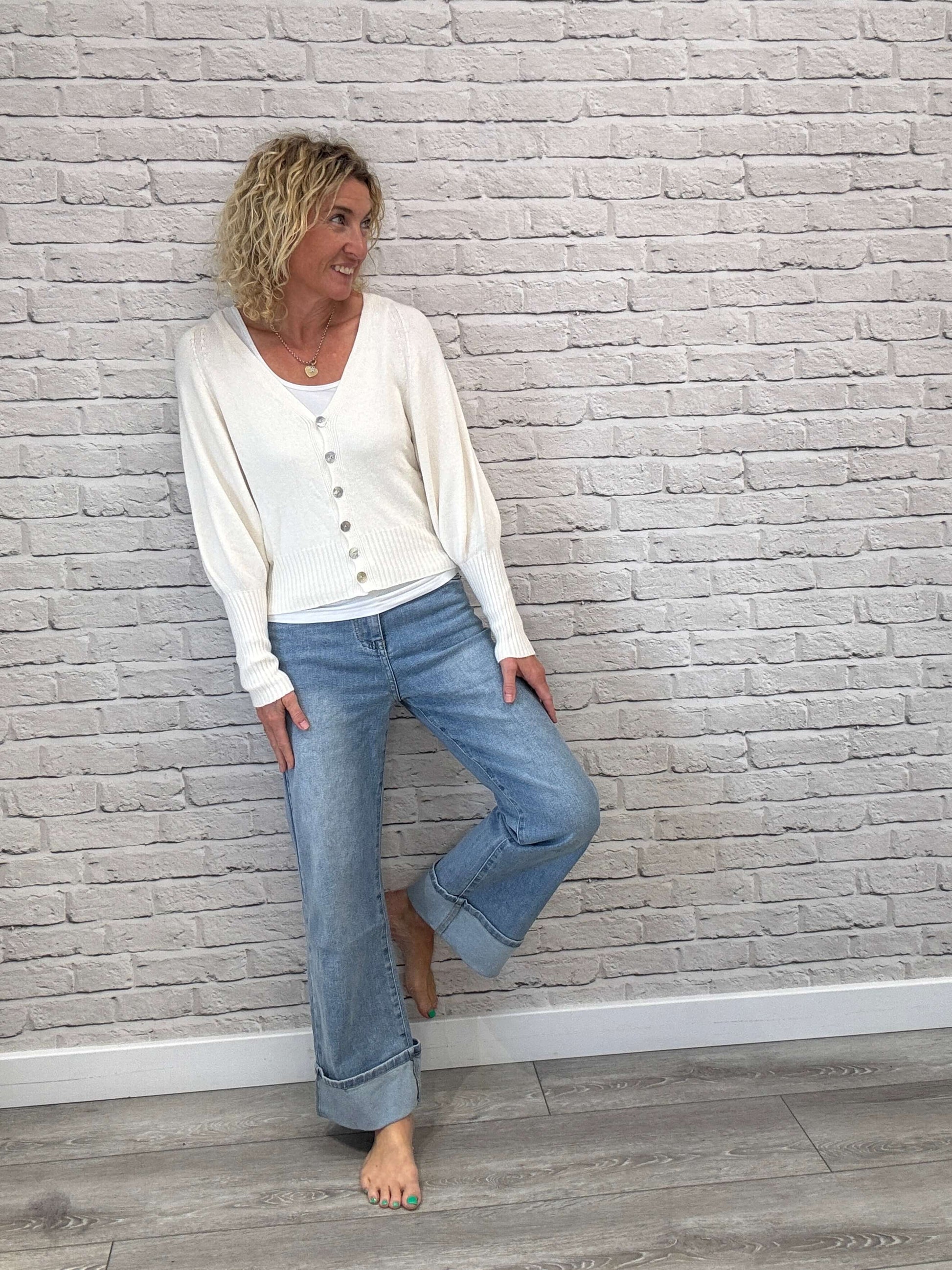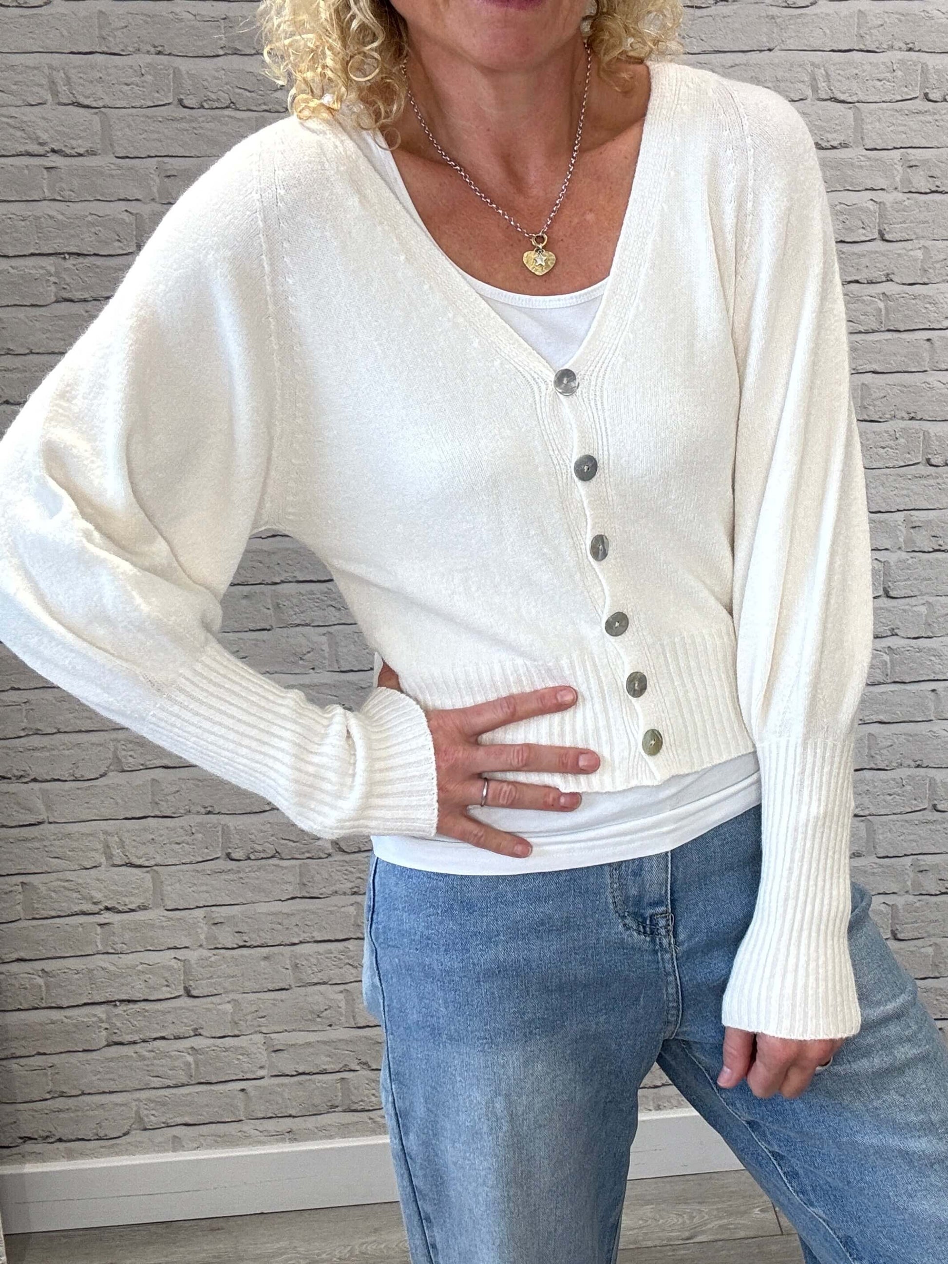 A neat-fit cardigan with statement balloon sleeves with extra deep ribbed cuffs. Wide cuffed hemline which sits perfectly on your hips. Brilliant with wide leg trousers, jeans and skirts. Flattering v neckline with button front.